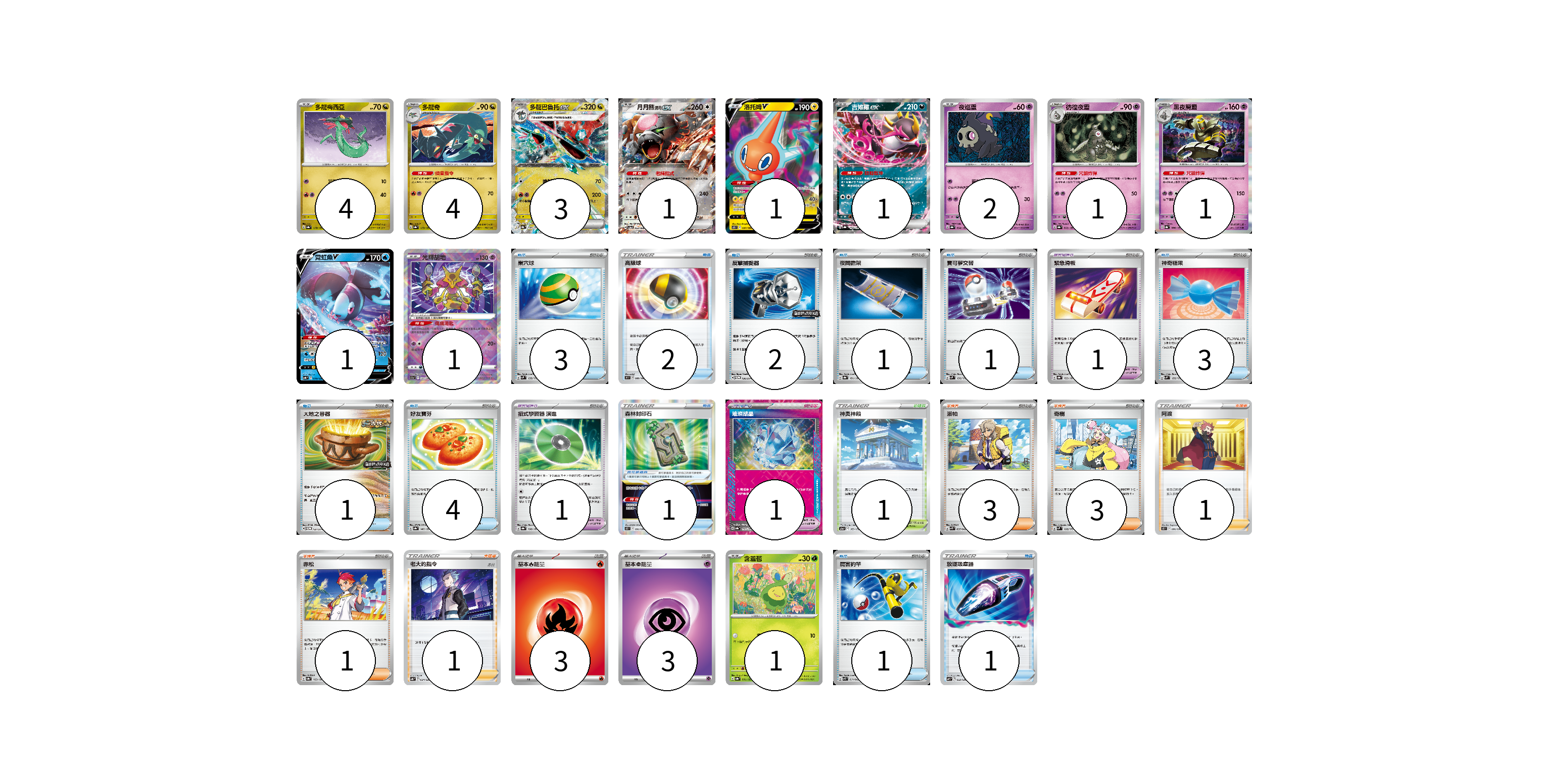 牌組構築方案 以此牌組為基礎新構築牌組 顯示卡面 顯示列表 寶可夢卡(21) 4 4 3 1 1 1 2 1 1 1 1 1 寶可夢道具(4) 1 1 1 1 物品卡(19) 3 2 2 1 1 3 1 4 1 1 支援者卡(9) 3 3 1 1 1 競技場卡(1) 1 能量卡(6) 3 3 寶可夢卡(21) 卡牌名稱 張數 卡牌名稱 張數 多龍梅西亞 SV8a 118/187 04 多龍奇 SV8a 119/187 04 多龍巴魯托ex SV8a 120/187 03 月月熊 赫月 ex SV5a 052/066 01 洛托姆V S11 037/100 01 吉雉雞ex SV8a 104/187 01 夜巡靈 SV8a 064/187 02 彷徨夜靈 SV8a 065/187 01 黑夜魔靈 SV8a 066/187 01 霓虹魚V SVB 008/028 01 光輝胡地 S11a 031/068 01 含羞苞 SV8a 001/187 01 寶可夢道具(4) 卡牌名稱 張數 卡牌名稱 張數 緊急滑板 SV8a 153/187 01 招式學習器 演進 SV8a 160/187 01 森林封印石 S12 092/098 01 璀璨結晶 SV8a 152/187 01 物品卡(19) 卡牌名稱 張數 卡牌名稱 張數 巢穴球 SVM 133/175 03 高級球 S9 089/100 02 反擊捕捉器 SV-P 136/SV-P 02 夜間擔架 SV8a 151/187 01 寶可夢交替 SVM 136/175 01 神奇糖果 SVM 135/175 03 大地之容器 SV-P 137/SV-P 01 好友寶芬 SV8a 147/187 04 厲害釣竿 SVK 011/042 01 放逐吸塵器 SVF 023/038 01 支援者卡(9) 卡牌名稱 張數 卡牌名稱 張數 派帕 SVK 035/042 03 奇樹 SVM 160/175 03 阿渡 S12 096/098 01 赤松 SV8a 163/187 01 老大的指令(赤日) SVB 024/028 01 競技場卡(1) 卡牌名稱 張數 卡牌名稱 張數 神奧神殿 S12a 169/172 01 能量卡(6) 卡牌名稱 張數 卡牌名稱 張數 基本火能量 sv-p FIR 03 基本超能量 sv-p PSY 03 以此牌組為基礎新構築牌組 牌組編碼 JRdQvF-zAluCl-HwpGjG copy 列印牌組單 牌組編碼已複製 分享至SNS