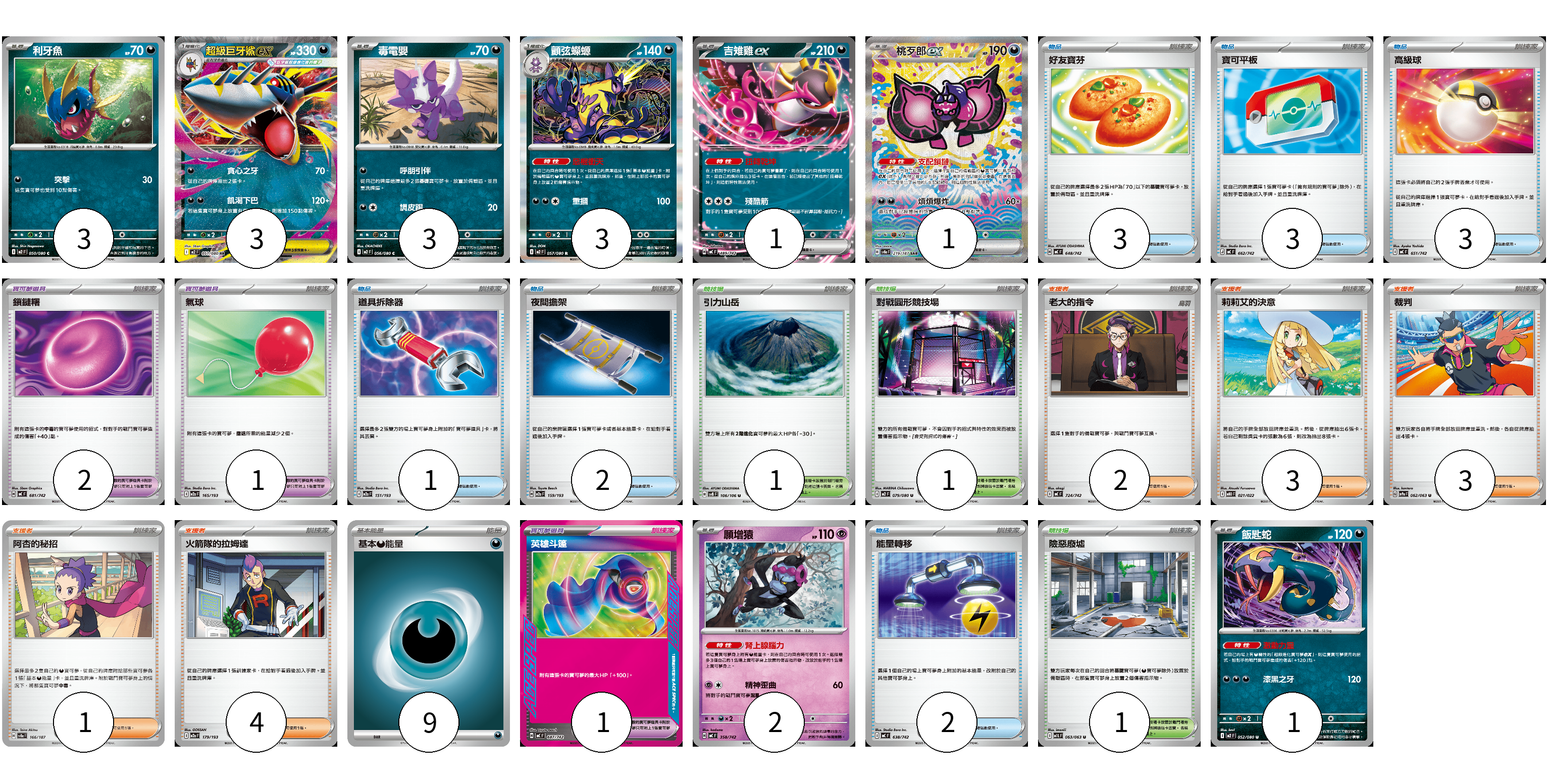 牌組構築方案 以此牌組為基礎新構築牌組 顯示卡面 顯示列表 寶可夢卡(17) 3 3 3 3 1 1 2 1 寶可夢道具(4) 2 1 1 物品卡(14) 3 3 3 1 2 2 支援者卡(13) 2 3 3 1 4 競技場卡(3) 1 1 1 能量卡(9) 9 寶可夢卡(17) 卡牌名稱 張數 卡牌名稱 張數 利牙魚 M2 050/080 03 超級巨牙鯊ex M2 051/080 03 毒電嬰 M2 056/080 03 顫弦蠑螈 M2 057/080 03 吉雉雞ex MC 489/742 01 桃歹郎ex SV8a 219/187 01 願增猿 MC 358/742 02 飯匙蛇 M2 052/080 01 寶可夢道具(4) 卡牌名稱 張數 卡牌名稱 張數 鎖鏈糬 MC 681/742 02 氣球 M2a 165/193 01 英雄斗篷 MC 687/742 01 物品卡(14) 卡牌名稱 張數 卡牌名稱 張數 好友寶芬 MC 648/742 03 寶可平板 MC 662/742 03 高級球 MC 651/742 03 道具拆除器 M2a 151/193 01 夜間擔架 M2a 159/193 02 能量轉移 MC 638/742 02 支援者卡(13) 卡牌名稱 張數 卡牌名稱 張數 老大的指令 MC 724/742 02 莉莉艾的決意 MBD 021/022 03 裁判 SV9a 062/063 03 阿杏的秘招 SV8a 166/187 01 火箭隊的拉姆達 M2a 179/193 04 競技場卡(3) 卡牌名稱 張數 卡牌名稱 張數 引力山岳 SV8 106/106 01 對戰圓形競技場 M2 079/080 01 險惡廢墟 M1L 063/063 01 能量卡(9) 卡牌名稱 張數 卡牌名稱 張數 基本惡能量 sv-p DAR 09 以此牌組為基礎新構築牌組 牌組編碼 JRndBB-stTRKP-HWpAcy copy 列印牌組單 牌組編碼已複製 分享至SNS