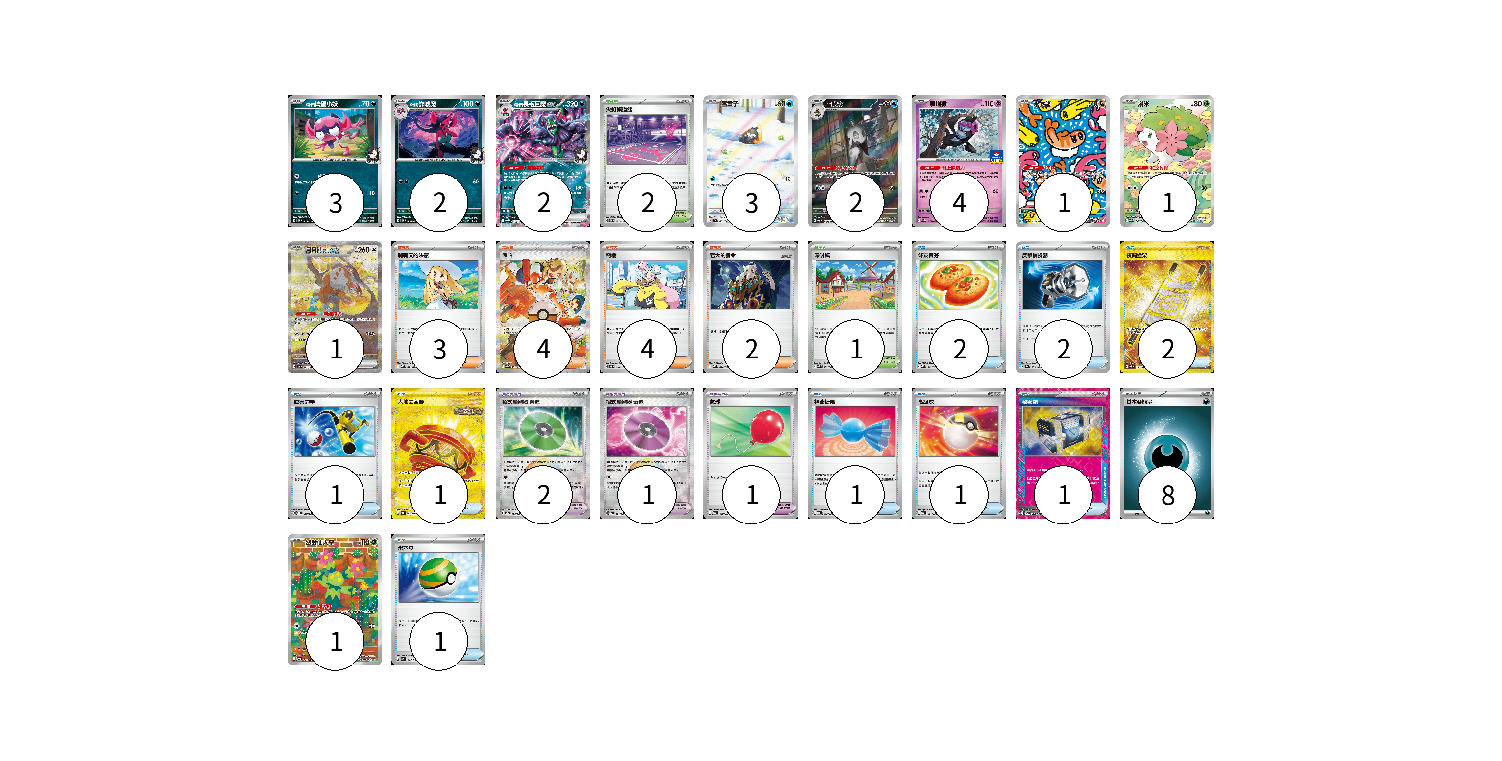 牌組構築方案 以此牌組為基礎新構築牌組 顯示卡面 顯示列表 寶可夢卡(20) 3 2 2 3 2 4 1 1 1 1 寶可夢道具(4) 2 1 1 物品卡(12) 2 2 2 1 1 1 1 1 1 支援者卡(13) 3 4 4 2 競技場卡(3) 2 1 能量卡(8) 8 寶可夢卡(20) 卡牌名稱 張數 卡牌名稱 張數 <瑪俐的>搗蛋小妖 SVOM 005/021 03 <瑪俐的>詐唬魔 SVOM 006/021 02 <瑪俐的>長毛巨魔ex SVOM 007/021 02 雪童子 SV3a 063/062 03 雪妖女 SV6 104/101 02 願增猿 M-P 014/M-P 04 米立龍 SV6 112/101 01 謝米 SV9a 066/063 01 月月熊 赫月 ex SV5a 091/066 01 沙鈴仙人掌 SV9 101/100 01 寶可夢道具(4) 卡牌名稱 張數 卡牌名稱 張數 招式學習器 演進 SV8a 160/187 02 招式學習器 衰退 SV8a 161/187 01 氣球 MBD 018/022 01 物品卡(12) 卡牌名稱 張數 卡牌名稱 張數 好友寶芬 MBD 013/022 02 反擊捕捉器 SV8a 139/187 02 夜間擔架 SV8 137/106 02 厲害釣竿 SVOD 010/020 01 大地之容器 SV6a 093/064 01 神奇糖果 MBG 013/022 01 高級球 MBD 014/022 01 秘密箱 SV6 092/101 01 巢穴球 SVM 133/175 01 支援者卡(13) 卡牌名稱 張數 卡牌名稱 張數 莉莉艾的決意 MBD 021/022 03 派帕 SV4a 353/190 04 奇樹 SVOD 016/020 04 老大的指令 MBD 020/022 02 競技場卡(3) 卡牌名稱 張數 卡牌名稱 張數 尖釘鎮道館 SVOM 021/021 02 深缽鎮 SVK 039/042 01 能量卡(8) 卡牌名稱 張數 卡牌名稱 張數 基本【惡】能量 MBG DAR 08 以此牌組為基礎新構築牌組 牌組編碼 JSTJkm-yZhEyd-yTZkIT copy 列印牌組單 牌組編碼已複製 分享至SNS