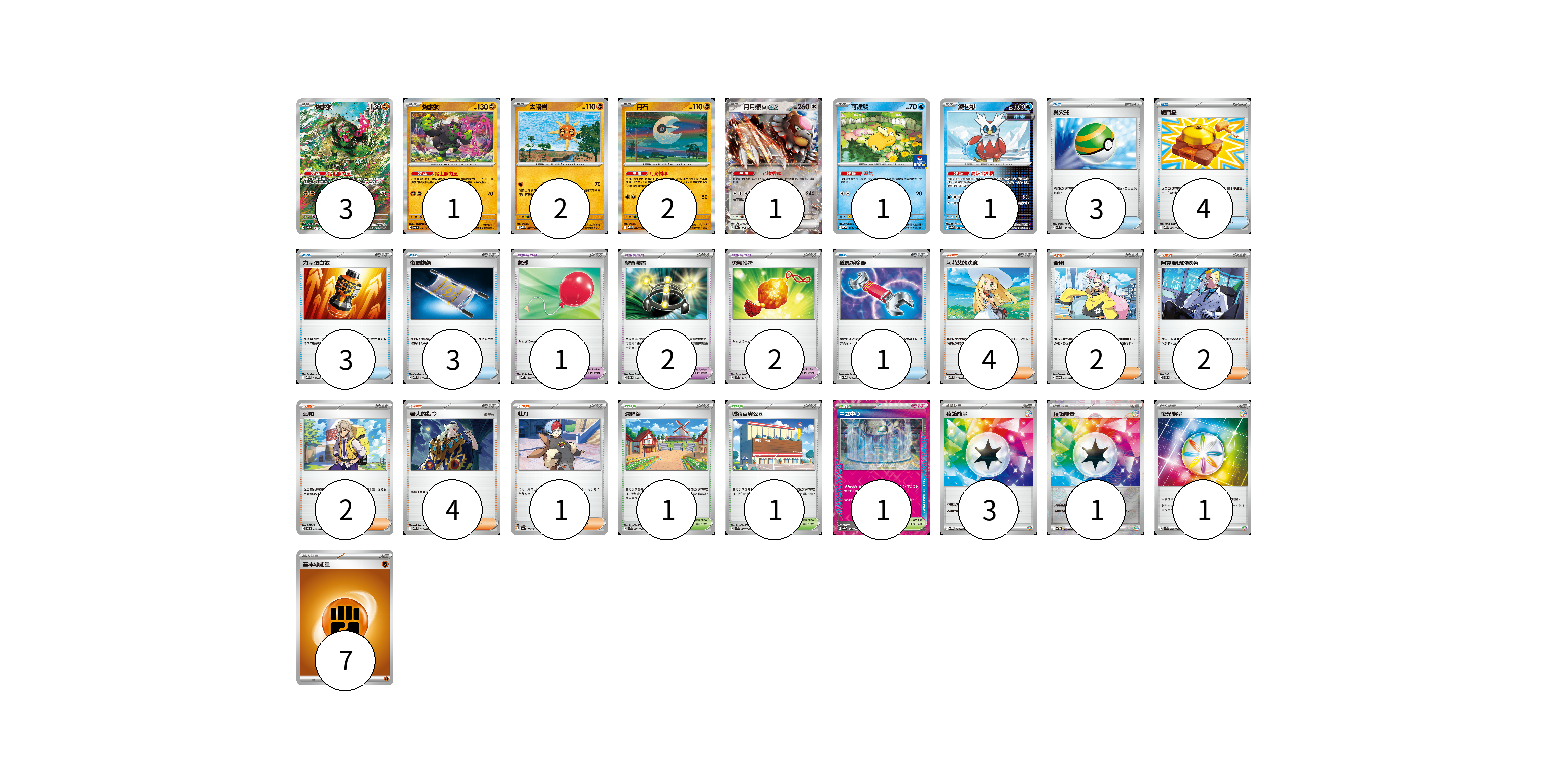 牌組構築方案 以此牌組為基礎新構築牌組 顯示卡面 顯示列表 寶可夢卡(11) 3 1 2 2 1 1 1 寶可夢道具(5) 1 2 2 物品卡(14) 3 4 3 3 1 支援者卡(15) 4 2 2 2 4 1 競技場卡(3) 1 1 1 能量卡(12) 3 1 1 7 寶可夢卡(11) 卡牌名稱 張數 卡牌名稱 張數 夠讚狗 SV6 110/101 03 夠讚狗 SV6 064/101 01 太陽岩 M1L 027/063 02 月石 M1L 026/063 02 月月熊 赫月ex SV8a 134/187 01 可達鴨 SV-P 220/SV-P 01 鐵包袱 SV8a 047/187 01 寶可夢道具(5) 卡牌名稱 張數 卡牌名稱 張數 氣球 MBD 018/022 01 學習裝置 SVTM 016/022 02 勇氣護符 SVM 142/175 02 物品卡(14) 卡牌名稱 張數 卡牌名稱 張數 巢穴球 SVM 133/175 03 戰鬥鑼 M1L 059/063 04 力量蛋白飲 M1L 058/063 03 夜間擔架 MBD 016/022 03 道具拆除器 SV11W 080/086 01 支援者卡(15) 卡牌名稱 張數 卡牌名稱 張數 莉莉艾的決意 MBD 021/022 04 奇樹 SVOD 016/020 02 阿克羅瑪的執著 SVOM 017/021 02 派帕 SVOD 018/020 02 老大的指令 MBD 020/022 04 牡丹 SV4a 182/190 01 競技場卡(3) 卡牌名稱 張數 卡牌名稱 張數 深缽鎮 SVK 039/042 01 城鎮百貨公司 SVK 037/042 01 中立中心 SV8a 184/187 01 能量卡(12) 卡牌名稱 張數 卡牌名稱 張數 稜鏡能量 SV11B 086/086 03 稜鏡能量 SV11B 086/086 01 夜光能量 SVK 042/042 01 基本鬥能量 sv-p FIG 07 以此牌組為基礎新構築牌組 牌組編碼 JSfxTV-zhfqfX-TFDuee copy 列印牌組單 牌組編碼已複製 分享至SNS