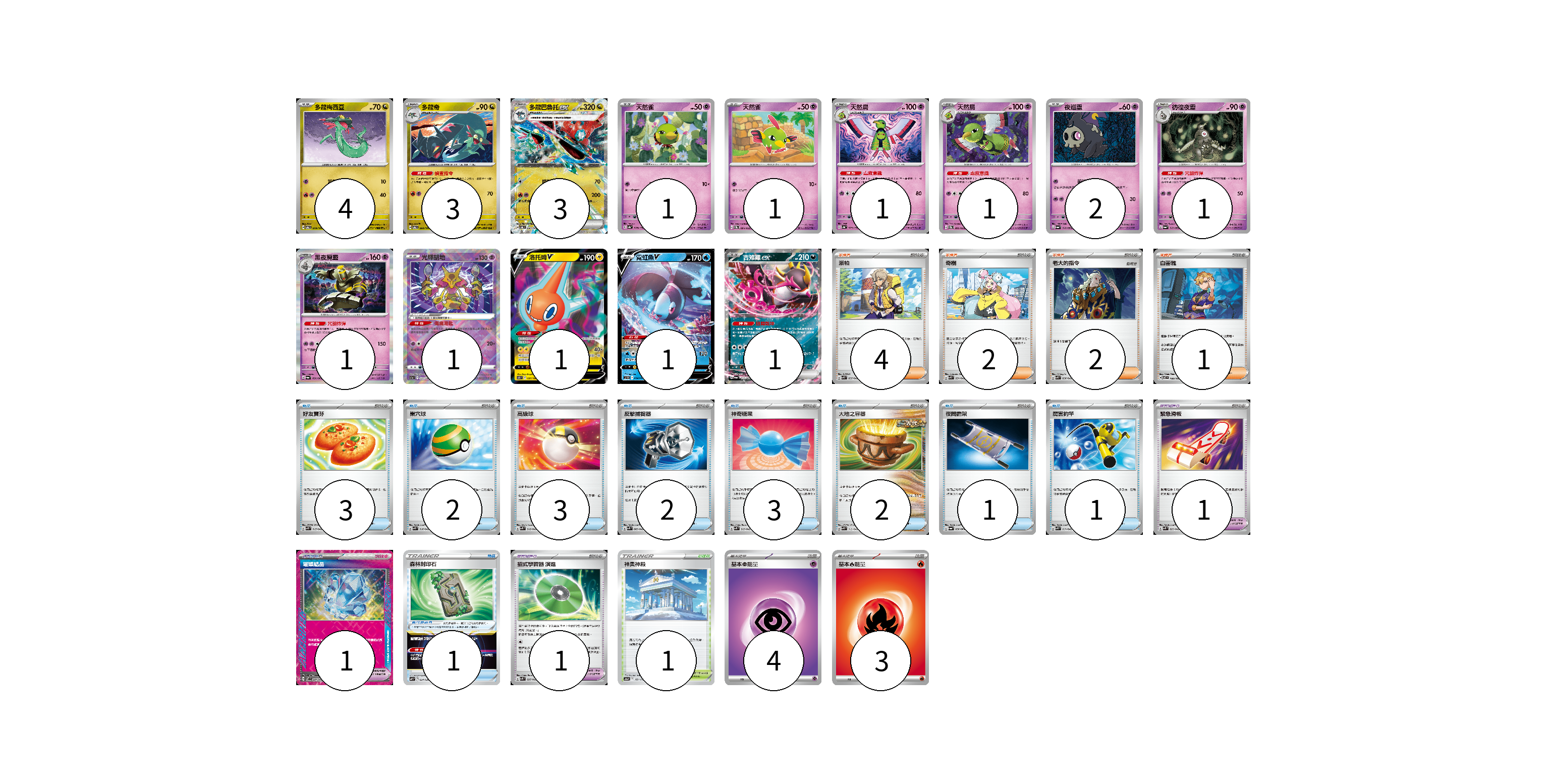 牌組構築方案 以此牌組為基礎新構築牌組 顯示卡面 顯示列表 寶可夢卡(22) 4 3 3 1 1 1 1 2 1 1 1 1 1 1 寶可夢道具(3) 1 1 1 物品卡(18) 3 2 3 2 3 2 1 1 1 支援者卡(9) 4 2 2 1 競技場卡(1) 1 能量卡(7) 4 3 寶可夢卡(22) 卡牌名稱 張數 卡牌名稱 張數 多龍梅西亞 SV6 079/101 04 多龍奇 SV6 080/101 03 多龍巴魯托ex SV6 081/101 03 天然雀 SV4a 078/190 01 天然雀 SVEM 004/020 01 天然鳥 SV4a 079/190 01 天然鳥 SVEM 005/020 01 夜巡靈 SV6a 018/064 02 彷徨夜靈 SV6a 019/064 01 黑夜魔靈 SV6a 020/064 01 光輝胡地 S11a 031/068 01 洛托姆V S11 037/100 01 霓虹魚V SVHK 004/022 01 吉雉雞ex SV6a 038/064 01 寶可夢道具(3) 卡牌名稱 張數 卡牌名稱 張數 緊急滑板 SVK 023/042 01 璀璨結晶 SV7 094/102 01 招式學習器 演進 SVK 025/042 01 物品卡(18) 卡牌名稱 張數 卡牌名稱 張數 好友寶芬 SVK 015/042 03 巢穴球 SVK 016/042 02 高級球 SVK 018/042 03 反擊捕捉器 SVK 009/042 02 神奇糖果 SVK 019/042 03 大地之容器 SVK 012/042 02 夜間擔架 SV6a 056/064 01 厲害釣竿 SVK 011/042 01 森林封印石 SVF 024/038 01 支援者卡(9) 卡牌名稱 張數 卡牌名稱 張數 派帕 SVK 035/042 04 奇樹 SVK 031/042 02 老大的指令 SVK 036/042 02 白蕾雅 SV7 100/102 01 競技場卡(1) 卡牌名稱 張數 卡牌名稱 張數 神奧神殿 S12a 169/172 01 能量卡(7) 卡牌名稱 張數 卡牌名稱 張數 基本【超】能量 SVTS PSY 04 基本【火】能量 SVTL FIR 03 以此牌組為基礎新構築牌組 牌組編碼 JUzCfl-uwFlSe-MwKVPR copy 列印牌組單 牌組編碼已複製 分享至SNS