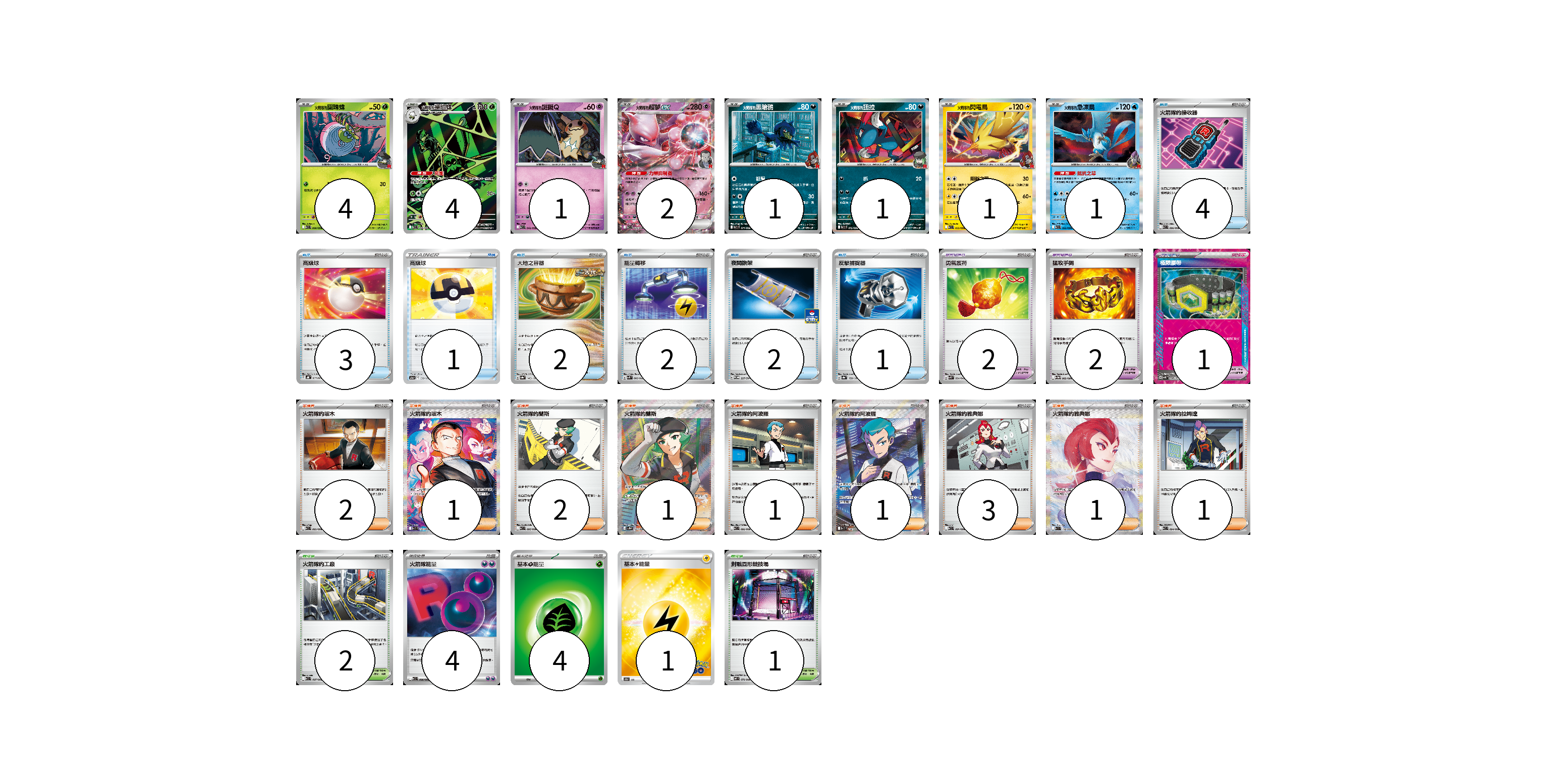 牌組構築方案 以此牌組為基礎新構築牌組 顯示卡面 顯示列表 寶可夢卡(15) 4 4 1 2 1 1 1 1 寶可夢道具(5) 2 2 1 物品卡(15) 4 3 1 2 2 2 1 支援者卡(13) 2 1 2 1 1 1 3 1 1 競技場卡(3) 2 1 能量卡(9) 4 4 1 寶可夢卡(15) 卡牌名稱 張數 卡牌名稱 張數 <火箭隊的>團珠蛛 SV10 008/098 04 <火箭隊的>操陷蛛 SV10 099/098 04 <火箭隊的>謎擬Q SV10 042/098 01 <火箭隊的>超夢ex SV10 039/098 02 <火箭隊的>黑暗鴉 SV10 071/098 01 <火箭隊的>狃拉 SV10 072/098 01 <火箭隊的>閃電鳥 SV10 033/098 01 <火箭隊的>急凍鳥 SV10 022/098 01 寶可夢道具(5) 卡牌名稱 張數 卡牌名稱 張數 勇氣護符 SVK 024/042 02 猛攻手鐲 SV11W 082/086 02 極限腰帶 SV5K 066/071 01 物品卡(15) 卡牌名稱 張數 卡牌名稱 張數 火箭隊的接收器 SV10 090/098 04 高級球 SVHK 013/022 03 高級球 S12a 138/172 01 大地之容器 SV8a 143/187 02 能量轉移 SVK 008/042 02 夜間擔架 SV-P 227/SV-P 02 反擊捕捉器 SV8a 139/187 01 支援者卡(13) 卡牌名稱 張數 卡牌名稱 張數 火箭隊的坂木 SV10 093/098 02 火箭隊的坂木 SV10 129/098 01 火箭隊的蘭斯 SV10 095/098 02 火箭隊的蘭斯 SV10 123/098 01 火箭隊的阿波羅 SV10 092/098 01 火箭隊的阿波羅 SV10 120/098 01 火箭隊的雅典娜 SV10 091/098 03 火箭隊的雅典娜 SV10 128/098 01 火箭隊的拉姆達 SV10 094/098 01 競技場卡(3) 卡牌名稱 張數 卡牌名稱 張數 火箭隊的工廠 SV10 097/098 02 對戰圓形競技場 M2 079/080 01 能量卡(9) 卡牌名稱 張數 卡牌名稱 張數 火箭隊能量 SV10 098/098 04 基本草能量 sv-p GRA 04 基本雷能量 S10b LIG 01 以此牌組為基礎新構築牌組 牌組編碼 JVLoBr-WLxGFO-WFeuHS copy 列印牌組單 牌組編碼已複製 分享至SNS