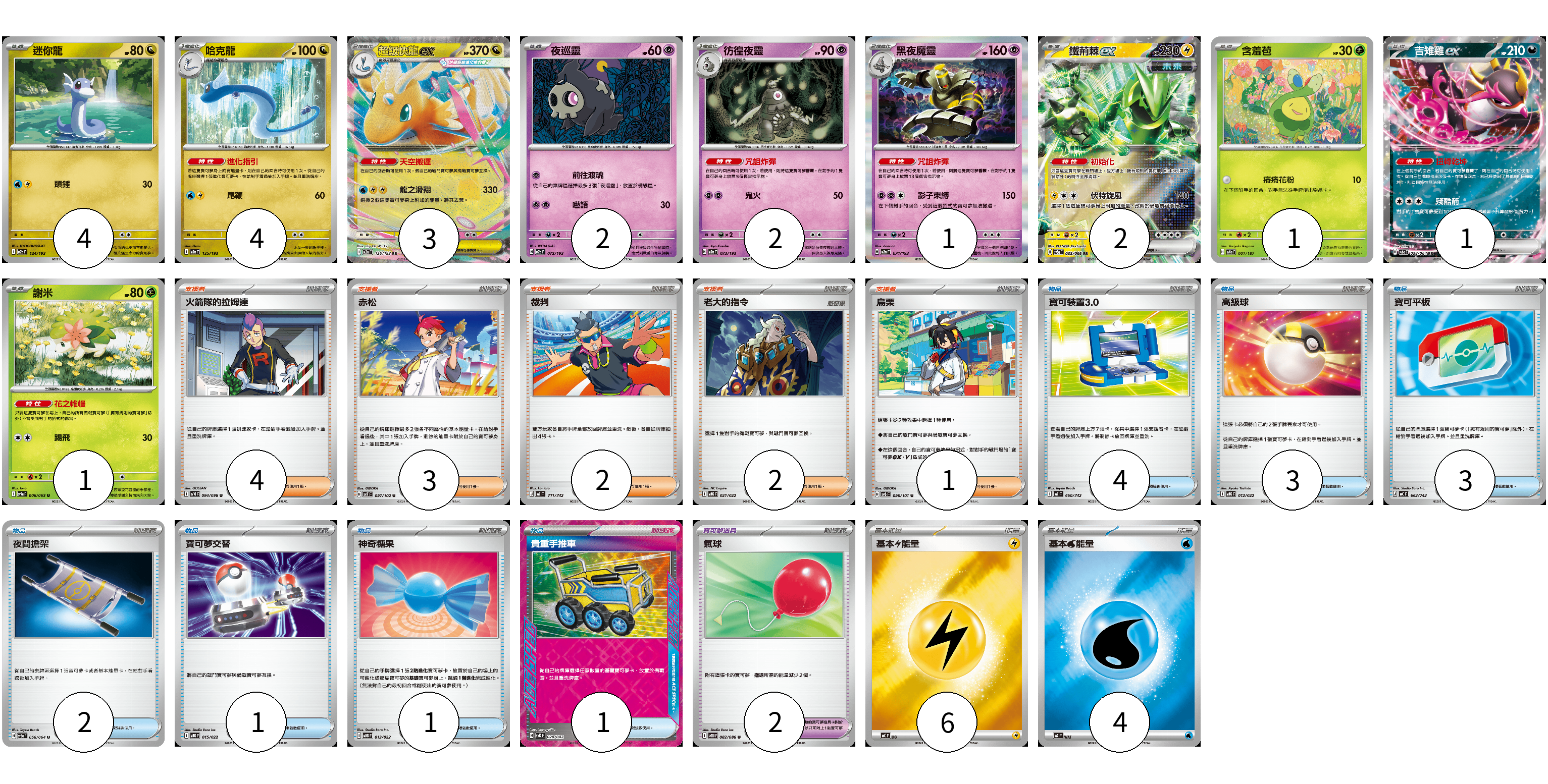 牌組構築方案 以此牌組為基礎新構築牌組 顯示卡面 顯示列表 寶可夢卡(21) 4 4 3 2 2 1 2 1 1 1 寶可夢道具(2) 2 物品卡(15) 4 3 3 2 1 1 1 支援者卡(12) 4 3 2 2 1 能量卡(10) 6 4 寶可夢卡(21) 卡牌名稱 張數 卡牌名稱 張數 迷你龍 M2a 124/193 04 哈克龍 M2a 125/193 04 超級快龍ex M2a 126/193 03 夜巡靈 M2a 072/193 02 彷徨夜靈 M2a 073/193 02 黑夜魔靈 M2a 074/193 01 鐵荊棘ex SV5a 033/066 02 含羞苞 SV8a 001/187 01 吉雉雞ex SV6a 038/064 01 謝米 SV9a 006/063 01 寶可夢道具(2) 卡牌名稱 張數 卡牌名稱 張數 氣球 SV11B 082/086 02 物品卡(15) 卡牌名稱 張數 卡牌名稱 張數 寶可裝置3.0 MC 660/742 04 高級球 MBG 012/022 03 寶可平板 MC 662/742 03 夜間擔架 SV6a 056/064 02 寶可夢交替 MBG 015/022 01 神奇糖果 MBG 013/022 01 貴重手推車 SVK 020/042 01 支援者卡(12) 卡牌名稱 張數 卡牌名稱 張數 火箭隊的拉姆達 SV10 094/098 04 赤松 SV7 097/102 03 裁判 MC 711/742 02 老大的指令 MBG 021/022 02 烏栗 SV6 096/101 01 能量卡(10) 卡牌名稱 張數 卡牌名稱 張數 基本【雷】能量 MC LIG 06 基本【水】能量 MC WAT 04 以此牌組為基礎新構築牌組 牌組編碼 JWoNPq-DjVPbs-uumtXm copy 列印牌組單 牌組編碼已複製 分享至SNS
