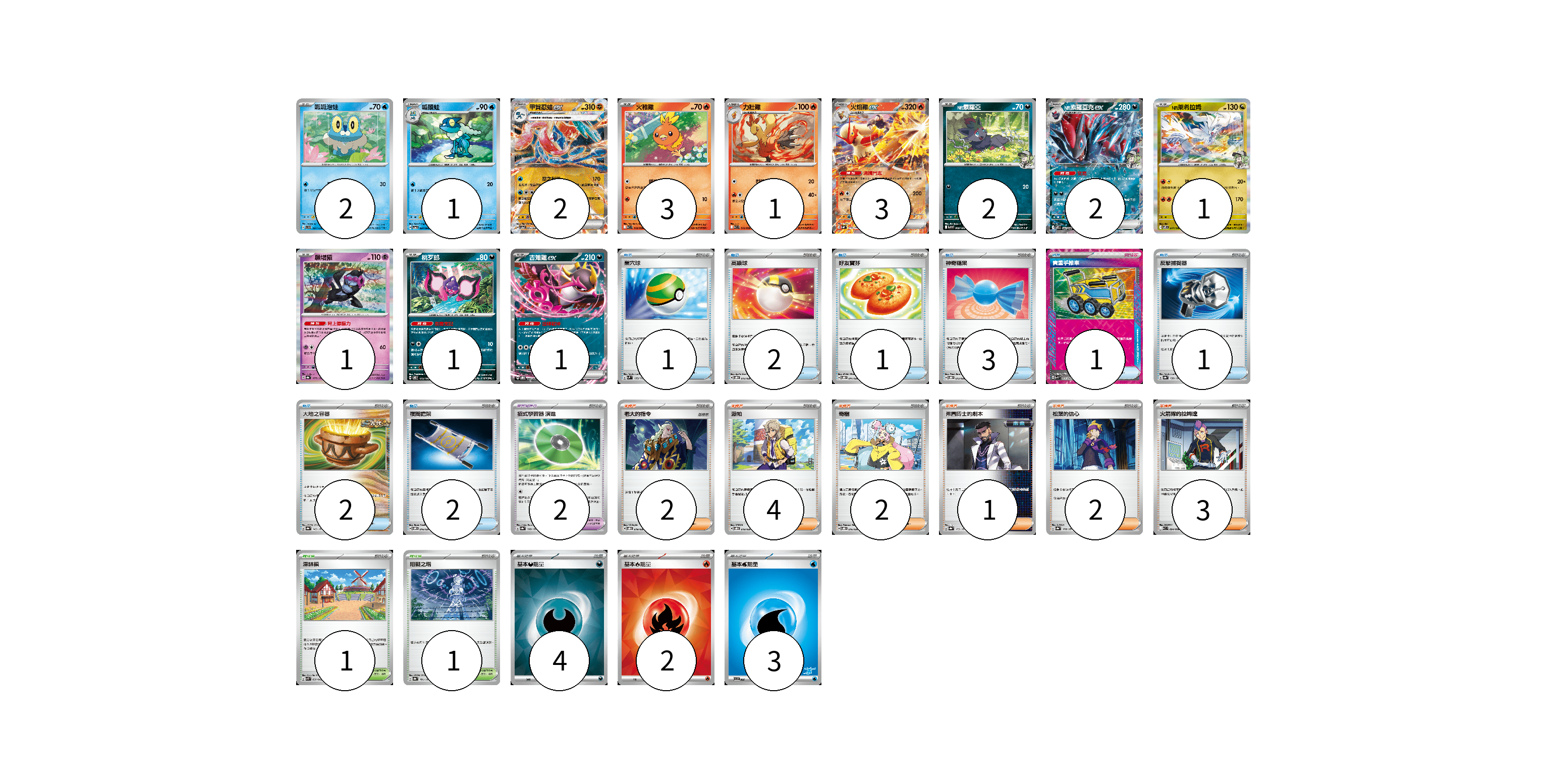 牌組構築方案 以此牌組為基礎新構築牌組 顯示卡面 顯示列表 寶可夢卡(20) 2 1 2 3 1 3 2 2 1 1 1 1 寶可夢道具(2) 2 物品卡(13) 1 2 1 3 1 1 2 2 支援者卡(14) 2 4 2 1 2 3 競技場卡(2) 1 1 能量卡(9) 4 2 3 寶可夢卡(20) 卡牌名稱 張數 卡牌名稱 張數 呱呱泡蛙 SVD 027/139 02 呱頭蛙 SV5a 024/066 01 甲賀忍蛙ex SV5a 045/066 02 火稚雞 SV10 018/098 03 力壯雞 SV10 019/098 01 火焰雞ex SVM 016/175 03 N的索羅亞 SV9 060/100 02 N的索羅亞克ex SV9 061/100 02 N的萊希拉姆 SV9 074/100 01 願增猿 SV8a 075/187 01 桃歹郎 SV8 075/106 01 吉雉雞ex SVOD 004/020 01 寶可夢道具(2) 卡牌名稱 張數 卡牌名稱 張數 招式學習器 演進 SV8a 160/187 02 物品卡(13) 卡牌名稱 張數 卡牌名稱 張數 巢穴球 SVM 133/175 01 高級球 SVOD 012/020 02 好友寶芬 SVOD 011/020 01 神奇糖果 SVOD 013/020 03 貴重手推車 SVK 020/042 01 反擊捕捉器 SV8a 139/187 01 大地之容器 SV8a 143/187 02 夜間擔架 SVOM 016/021 02 支援者卡(14) 卡牌名稱 張數 卡牌名稱 張數 老大的指令 SVOD 019/020 02 派帕 SVOD 018/020 04 奇樹 SVOD 016/020 02 弗圖博士的劇本 SV8a 175/187 01 松葉的信心 SV8a 178/187 02 火箭隊的拉姆達 SV10 094/098 03 競技場卡(2) 卡牌名稱 張數 卡牌名稱 張數 深缽鎮 SVK 039/042 01 阻礙之塔 SV8a 181/187 01 能量卡(9) 卡牌名稱 張數 卡牌名稱 張數 基本【惡】能量 SVOM DAR 04 基本【火】能量 SVK FIR 02 基本【水】能量 SVI WAT 03 以此牌組為基礎新構築牌組 牌組編碼 JXyDEv-Luadum-WadWTe copy 列印牌組單 牌組編碼已複製 分享至SNS