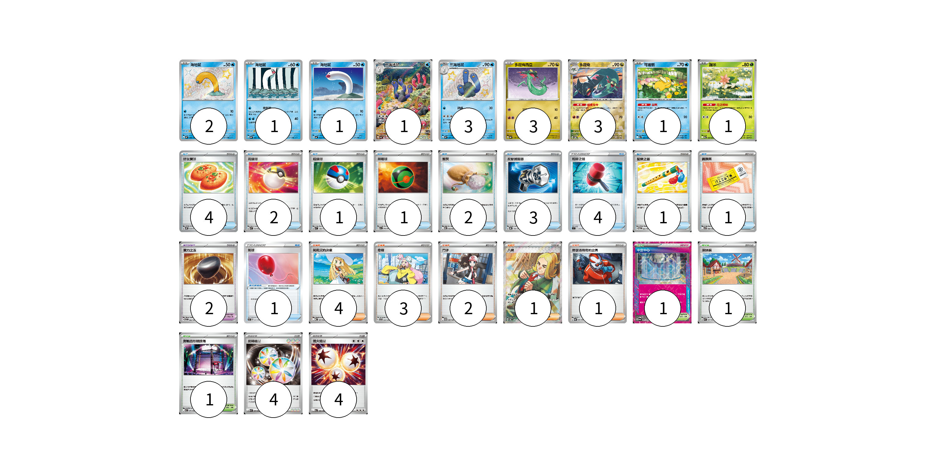 牌組構築方案 以此牌組為基礎新構築牌組 顯示卡面 顯示列表 寶可夢卡(16) 2 1 1 1 3 3 3 1 1 寶可夢道具(3) 2 1 物品卡(19) 4 2 1 1 2 3 4 1 1 支援者卡(11) 4 3 2 1 1 競技場卡(3) 1 1 1 能量卡(8) 4 4 寶可夢卡(16) 卡牌名稱 張數 卡牌名稱 張數 海地鼠 SV4a 226/190 02 海地鼠 SV8a 042/187 01 海地鼠 SV4a 044/190 01 三海地鼠 SV4a 338/190 01 三海地鼠 SV4a 227/190 03 多龍梅西亞 SV8a 118/187 03 多龍奇 SV8a 119/187 03 可達鴨 M2a 032/193 01 謝米 SV9a 006/063 01 寶可夢道具(3) 卡牌名稱 張數 卡牌名稱 張數 重力之玉 SV7 095/102 02 氣球 SK 021/030 01 物品卡(19) 卡牌名稱 張數 卡牌名稱 張數 好友寶芬 SV5K 063/071 04 高級球 SVK 018/042 02 超級球 SVM 132/175 01 黑暗球 SV7a 054/064 01 聖灰 SV9a 056/063 02 反擊捕捉器 SV8a 139/187 03 粉碎之錘 SI 372/414 04 配樂之笛 SV6 091/101 01 調換票 SV9 090/100 01 支援者卡(11) 卡牌名稱 張數 卡牌名稱 張數 莉莉艾的決意 MBD 021/022 04 奇樹 SVF 029/038 03 鬥子 SV11W 085/086 02 八朔 SV6 124/101 01 庫瑟洛斯奇的企圖 SV6a 062/064 01 競技場卡(3) 卡牌名稱 張數 卡牌名稱 張數 中立中心 SV6a 063/064 01 深缽鎮 SVK 039/042 01 對戰圓形競技場 M2 079/080 01 能量卡(8) 卡牌名稱 張數 卡牌名稱 張數 反轉能量 SVK 041/042 04 燃火能量 M2a 191/193 04 以此牌組為基礎新構築牌組 牌組編碼 JYNScp-JTGgHb-lhecCE copy 列印牌組單 牌組編碼已複製 分享至SNS