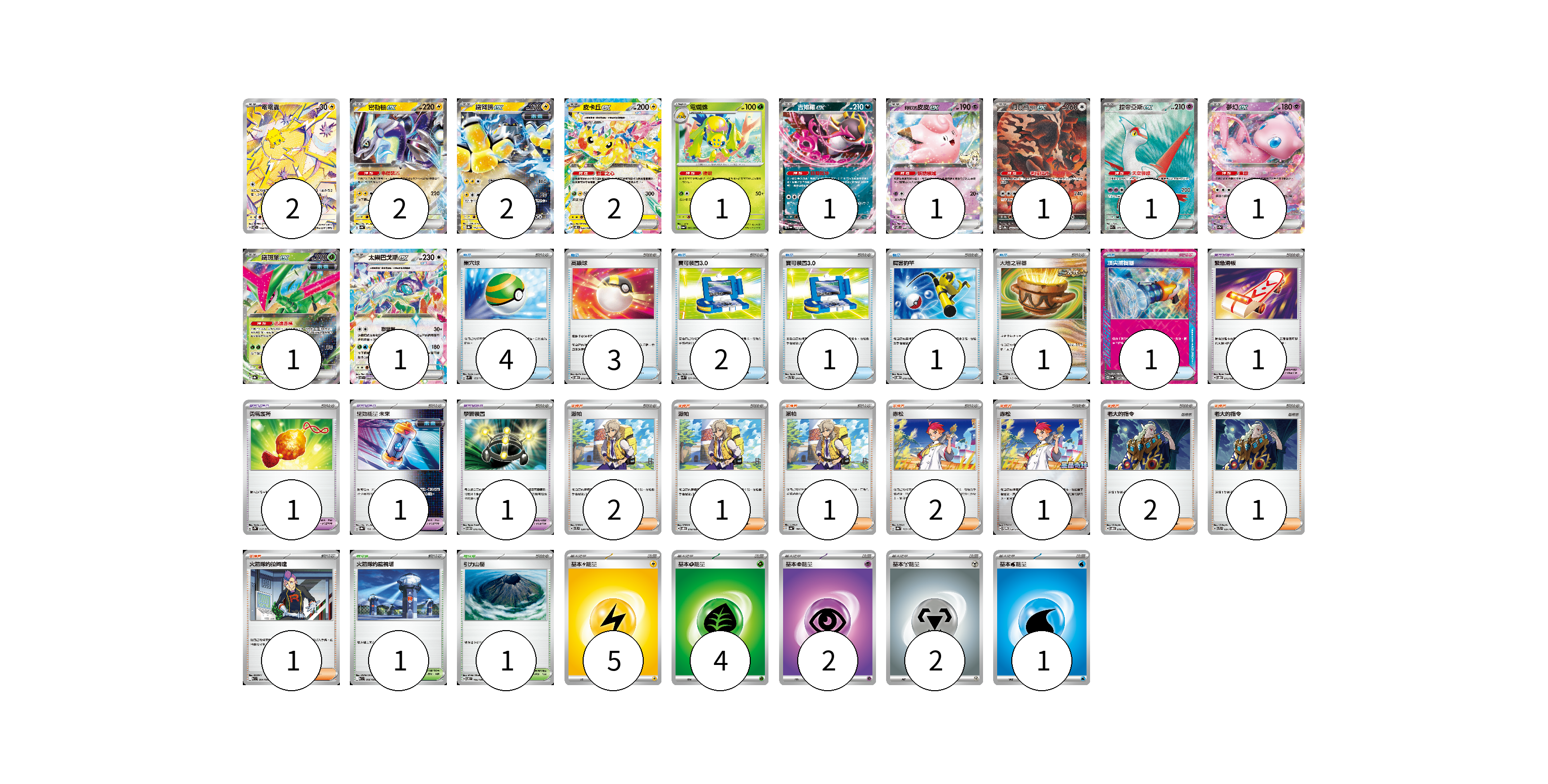 牌組構築方案 以此牌組為基礎新構築牌組 顯示卡面 顯示列表 寶可夢卡(16) 2 2 2 2 1 1 1 1 1 1 1 1 寶可夢道具(4) 1 1 1 1 物品卡(13) 4 3 2 1 1 1 1 支援者卡(11) 2 1 1 2 1 2 1 1 競技場卡(2) 1 1 能量卡(14) 5 4 2 2 1 寶可夢卡(16) 卡牌名稱 張數 卡牌名稱 張數 電電蟲 SV7 108/102 02 密勒頓ex SV4a 071/190 02 鐵臂膀ex SV8a 054/187 02 皮卡丘ex SV8 033/106 02 電蜘蛛 SV6a 002/064 01 吉雉雞ex SV6a 038/064 01 莉莉艾的皮皮ex SV9 033/100 01 月月熊 赫月ex SV8a 225/187 01 拉帝亞斯ex SV7a 078/064 01 夢幻ex SV2a 151/165 01 鐵斑葉ex SV8a 016/187 01 太樂巴戈斯ex SV7 088/102 01 寶可夢道具(4) 卡牌名稱 張數 卡牌名稱 張數 緊急滑板 SVOD 015/020 01 勇氣護符 SV2D 067/071 01 驅勁能量 未來 SV8a 158/187 01 學習裝置 SVTM 016/022 01 物品卡(13) 卡牌名稱 張數 卡牌名稱 張數 巢穴球 SVM 133/175 04 高級球 SVOD 012/020 03 寶可裝置3.0 SVK 021/042 02 寶可裝置3.0 SVTL 014/021 01 厲害釣竿 SVOD 010/020 01 大地之容器 SVK 012/042 01 頂尖捕捉器 SV8a 148/187 01 支援者卡(11) 卡牌名稱 張數 卡牌名稱 張數 派帕 SVTL 020/021 02 派帕 SVOD 018/020 01 派帕 SV4a 180/190 01 赤松 SV8a 163/187 02 赤松 SV-P 150/SV-P 01 老大的指令 SVOD 019/020 02 老大的指令 SVTL 021/021 01 火箭隊的拉姆達 SV10 094/098 01 競技場卡(2) 卡牌名稱 張數 卡牌名稱 張數 火箭隊的監視塔 SV10 096/098 01 引力山岳 SV8 106/106 01 能量卡(14) 卡牌名稱 張數 卡牌名稱 張數 基本雷能量 sv-p LIG 05 基本草能量 sv-p GRA 04 基本超能量 sv-p PSY 02 基本鋼能量 sv-p MET 02 基本水能量 sv-p WAT 01 以此牌組為基礎新構築牌組 牌組編碼 JYlVKX-UlwpLP-WTvwxz copy 列印牌組單 牌組編碼已複製 分享至SNS