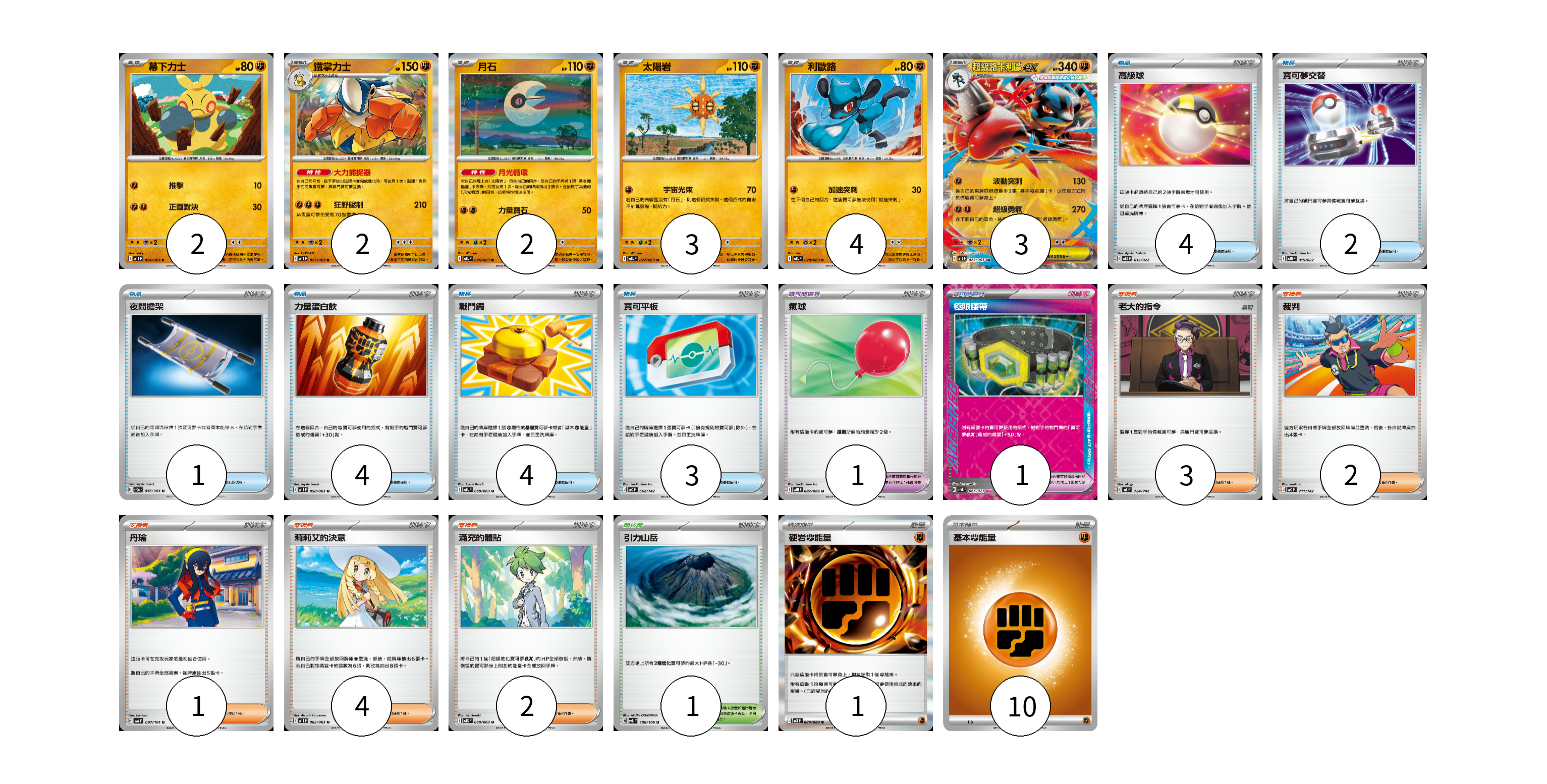 牌組構築方案 以此牌組為基礎新構築牌組 顯示卡面 顯示列表 寶可夢卡(16) 2 2 2 3 4 3 寶可夢道具(2) 1 1 物品卡(18) 4 2 1 4 4 3 支援者卡(12) 3 2 1 4 2 競技場卡(1) 1 能量卡(11) 1 10 寶可夢卡(16) 卡牌名稱 張數 卡牌名稱 張數 幕下力士 M1L 024/063 02 鐵掌力士 M1L 025/063 02 月石 M1L 026/063 02 太陽岩 M1L 027/063 03 利歐路 M1L 028/063 04 超級路卡利歐ex M1L 029/063 03 寶可夢道具(2) 卡牌名稱 張數 卡牌名稱 張數 氣球 SV11B 082/086 01 極限腰帶 SV5K 066/071 01 物品卡(18) 卡牌名稱 張數 卡牌名稱 張數 高級球 MBG 012/022 04 寶可夢交替 MBG 015/022 02 夜間擔架 SV6a 056/064 01 力量蛋白飲 M1L 058/063 04 戰鬥鑼 M1L 059/063 04 寶可平板 MC 662/742 03 支援者卡(12) 卡牌名稱 張數 卡牌名稱 張數 老大的指令 MC 724/742 03 裁判 MC 711/742 02 丹瑜 SV6 097/101 01 莉莉艾的決意 M1L 062/063 04 滿充的體貼 M1S 060/063 02 競技場卡(1) 卡牌名稱 張數 卡牌名稱 張數 引力山岳 SV8 106/106 01 能量卡(11) 卡牌名稱 張數 卡牌名稱 張數 硬岩【鬥】能量 M3 080/080 01 基本【鬥】能量 M-P FIG 10 以此牌組為基礎新構築牌組 牌組編碼 JYtiiA-BPHxPf-qqlrWo copy 列印牌組單 牌組編碼已複製 分享至SNS