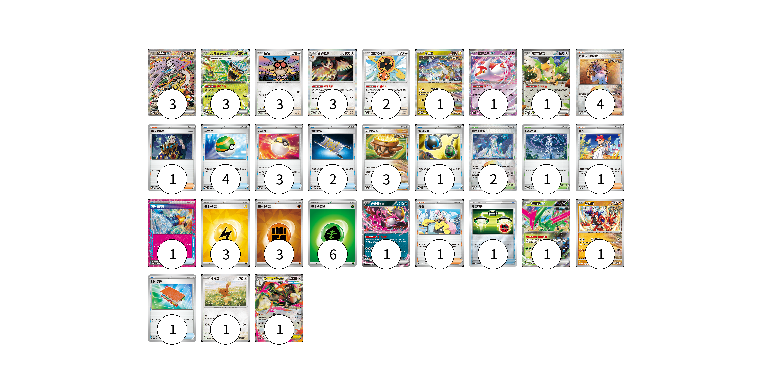 牌組構築方案 以此牌組為基礎新構築牌組 顯示卡面 顯示列表 寶可夢卡(22) 3 3 3 3 2 1 1 1 1 1 1 1 1 物品卡(16) 4 3 2 3 1 1 1 1 支援者卡(7) 4 1 1 1 競技場卡(3) 2 1 能量卡(12) 3 3 6 寶可夢卡(22) 卡牌名稱 張數 卡牌名稱 張數 猛雷鼓ex SV8a 222/187 03 厄鬼椪 碧草面具ex SV8a 020/187 03 咕咕 SV7 076/102 03 貓頭夜鷹 SV8a 128/187 03 旋轉洛托姆 SV8a 131/187 02 猛雷鼓 SV7 075/102 01 拉帝亞斯ex SV7a 019/064 01 怒鸚哥ex SVK 006/042 01 吉雉雞ex SVOD 004/020 01 鐵斑葉ex SV8a 016/187 01 故勒頓 SV8 069/106 01 捲捲耳 M2 071/080 01 超級長耳兔ex M2 072/080 01 物品卡(16) 卡牌名稱 張數 卡牌名稱 張數 巢穴球 SVM 133/175 04 高級球 SVOD 012/020 03 夜間擔架 SVOM 016/021 02 大地之容器 SV8a 143/187 03 能量回收 SVM 125/175 01 頂尖捕捉器 SV8a 148/187 01 能量轉移 SO 017/030 01 朋友手冊 SV1S 069/078 01 支援者卡(7) 卡牌名稱 張數 卡牌名稱 張數 奧琳博士的氣魄 SV8a 167/187 04 老大的指令 SVOD 019/020 01 赤松 SV7 097/102 01 奇樹 SVOD 016/020 01 競技場卡(3) 卡牌名稱 張數 卡牌名稱 張數 零之大空洞 SV8a 182/187 02 阻礙之塔 SV8a 181/187 01 能量卡(12) 卡牌名稱 張數 卡牌名稱 張數 基本【雷】能量 SVK LIG 03 基本【鬥】能量 SVK FIG 03 基本【草】能量 SVD GRA 06 以此牌組為基礎新構築牌組 牌組編碼 JZOOpz-mKzClX-jvHohL copy 列印牌組單 牌組編碼已複製 分享至SNS