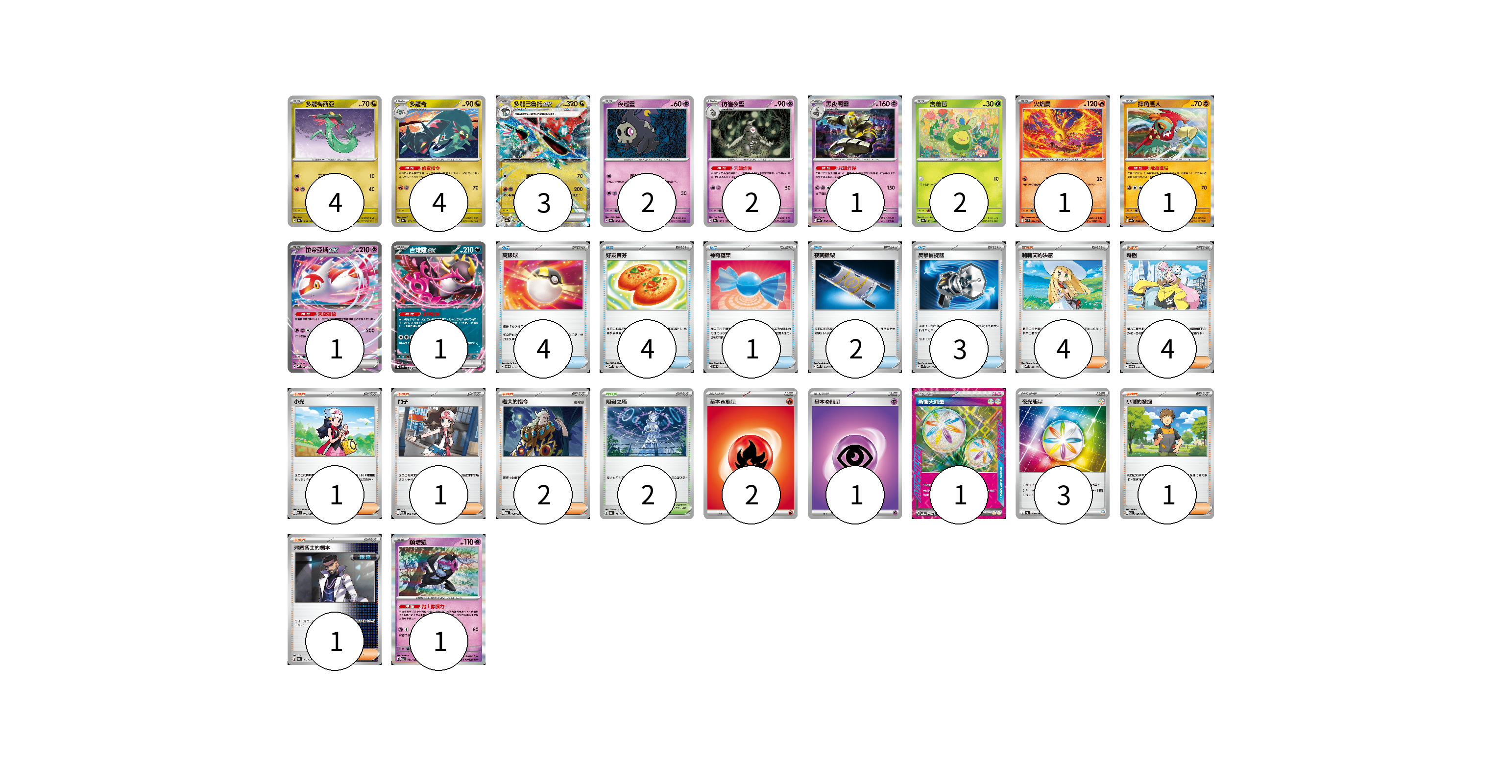 牌組構築方案 以此牌組為基礎新構築牌組 顯示卡面 顯示列表 寶可夢卡(23) 4 4 3 2 2 1 2 1 1 1 1 1 物品卡(14) 4 4 1 2 3 支援者卡(14) 4 4 1 1 2 1 1 競技場卡(2) 2 能量卡(7) 2 1 1 3 寶可夢卡(23) 卡牌名稱 張數 卡牌名稱 張數 多龍梅西亞 SV8a 118/187 04 多龍奇 SV8a 119/187 04 多龍巴魯托ex SV8a 120/187 03 夜巡靈 SV8a 064/187 02 彷徨夜靈 SV8a 065/187 02 黑夜魔靈 SV8a 066/187 01 含羞苞 SV8a 001/187 02 火焰鳥 M2 014/080 01 摔角鷹人 SV8a 084/187 01 拉帝亞斯ex MBD 003/022 01 吉雉雞ex SVOD 004/020 01 願增猿 M2a 081/193 01 物品卡(14) 卡牌名稱 張數 卡牌名稱 張數 高級球 SVOD 012/020 04 好友寶芬 MBD 013/022 04 神奇糖果 SVOD 013/020 01 夜間擔架 MBD 016/022 02 反擊捕捉器 SVK 009/042 03 支援者卡(14) 卡牌名稱 張數 卡牌名稱 張數 莉莉艾的決意 MBD 021/022 04 奇樹 SVOD 016/020 04 小光 M2 077/080 01 鬥子 SV11W 085/086 01 老大的指令 MBD 020/022 02 小剛的發掘 SV9 096/100 01 弗圖博士的劇本 SV8a 175/187 01 競技場卡(2) 卡牌名稱 張數 卡牌名稱 張數 阻礙之塔 SV8a 181/187 02 能量卡(7) 卡牌名稱 張數 卡牌名稱 張數 基本火能量 sv-p FIR 02 基本超能量 sv-p PSY 01 新衝天能量 SV5K 071/071 01 夜光能量 SV4a 190/190 03 以此牌組為基礎新構築牌組 牌組編碼 JZmDxM-uHQMlM-qdNYPZ copy 列印牌組單 牌組編碼已複製 分享至SNS