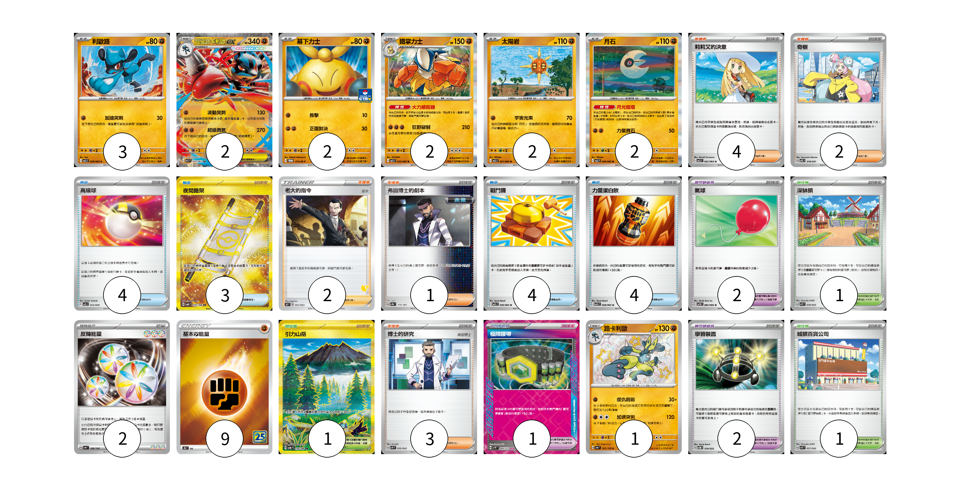 牌組構築方案 以此牌組為基礎新構築牌組 顯示卡面 顯示列表 寶可夢卡(14) 3 2 2 2 2 2 1 寶可夢道具(7) 2 2 1 2 物品卡(15) 4 3 4 4 支援者卡(10) 4 2 1 3 競技場卡(3) 1 1 1 能量卡(11) 2 9 寶可夢卡(14) 卡牌名稱 張數 卡牌名稱 張數 利歐路 M1L 028/063 03 超級路卡利歐ex M1L 029/063 02 幕下力士 M-P 015/M-P 02 鐵掌力士 M1L 025/063 02 太陽岩 M1L 027/063 02 月石 M1L 026/063 02 路卡利歐 SV4a 281/190 01 寶可夢道具(7) 卡牌名稱 張數 卡牌名稱 張數 奇樹 SVTL 018/021 02 氣球 SV11B 082/086 02 極限腰帶 SV5K 066/071 01 學習裝置 SVTM 016/022 02 物品卡(15) 卡牌名稱 張數 卡牌名稱 張數 高級球 SVEL 012/020 04 夜間擔架 SV8 137/106 03 戰鬥鑼 M1L 059/063 04 力量蛋白飲 M1L 058/063 04 支援者卡(10) 卡牌名稱 張數 卡牌名稱 張數 莉莉艾的決意 M1L 062/063 04 老大的指令(坂木) SH 051/053 02 弗圖博士的劇本 SV8a 175/187 01 博士的研究 SVK 033/042 03 競技場卡(3) 卡牌名稱 張數 卡牌名稱 張數 深缽鎮 SVK 039/042 01 引力山岳 SV8 138/106 01 城鎮百貨公司 SVK 037/042 01 能量卡(11) 卡牌名稱 張數 卡牌名稱 張數 反轉能量 SV4a 189/190 02 基本鬥能量 S8a FIG 09 以此牌組為基礎新構築牌組 牌組編碼 JbawBG-GuHFep-efCmMp copy 列印牌組單 牌組編碼已複製 分享至SNS