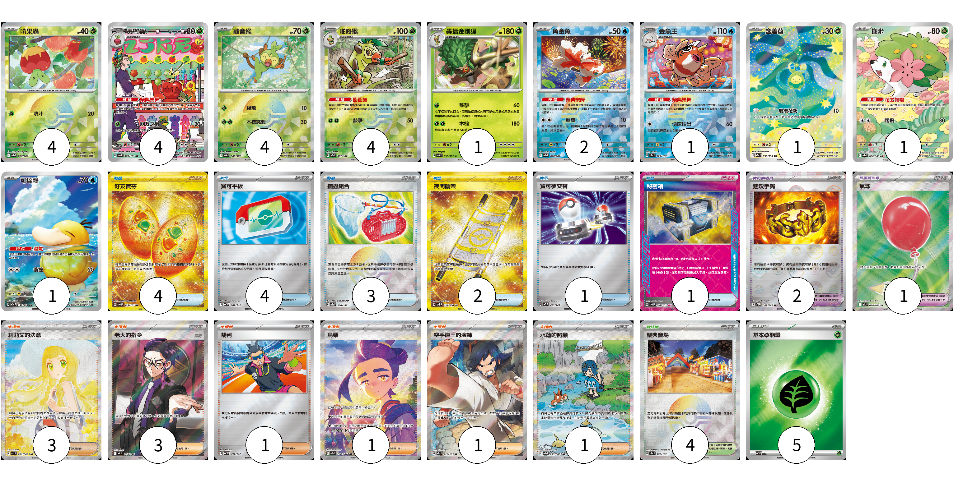 牌組構築方案 以此牌組為基礎新構築牌組 顯示卡面 顯示列表 寶可夢卡(23) 4 4 4 4 1 2 1 1 1 1 寶可夢道具(3) 2 1 物品卡(15) 4 4 3 2 1 1 支援者卡(10) 3 3 1 1 1 1 競技場卡(4) 4 能量卡(5) 5 寶可夢卡(23) 卡牌名稱 張數 卡牌名稱 張數 啃果蟲 SV8a 008/187 04 裹蜜蟲 SV6 103/101 04 敲音猴 SV8a 006/187 04 啪咚猴 SV8a 007/187 04 轟擂金剛猩 SV6 010/101 01 角金魚 SV8a 028/187 02 金魚王 SV8a 029/187 01 含羞苞 M2a 196/193 01 謝米 SV9a 066/063 01 可達鴨 M2a 199/193 01 寶可夢道具(3) 卡牌名稱 張數 卡牌名稱 張數 猛攻手鐲 SV11W 082/086 02 氣球 M1L 084/063 01 物品卡(15) 卡牌名稱 張數 卡牌名稱 張數 好友寶芬 SV6 133/101 04 寶可平板 MC 662/742 04 捕蟲組合 SV8a 150/187 03 夜間擔架 SV8 137/106 02 寶可夢交替 MC 663/742 01 秘密箱 SV6 092/101 01 支援者卡(10) 卡牌名稱 張數 卡牌名稱 張數 莉莉艾的決意 M1L 091/063 03 老大的指令(烏羽) MC 760/742 03 裁判 MC 711/742 01 烏栗 SV8a 230/187 01 空手道王的演練 M2a 220/193 01 水蓮的照顧 SV5a 093/066 01 競技場卡(4) 卡牌名稱 張數 卡牌名稱 張數 祭典會場 SV8a 180/187 04 能量卡(5) 卡牌名稱 張數 卡牌名稱 張數 基本【草】能量 MC GRA 05 以此牌組為基礎新構築牌組 牌組編碼 JcJeez-ybYXiV-KjBCTd copy 列印牌組單 牌組編碼已複製 分享至SNS