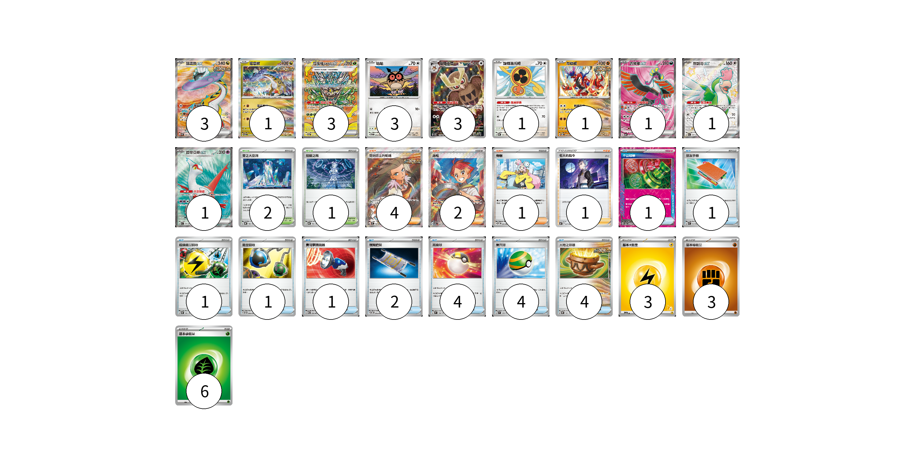 牌組構築方案 以此牌組為基礎新構築牌組 顯示卡面 顯示列表 寶可夢卡(18) 3 1 3 3 3 1 1 1 1 1 物品卡(19) 1 1 1 1 1 2 4 4 4 支援者卡(8) 4 2 1 1 競技場卡(3) 2 1 能量卡(12) 3 3 6 寶可夢卡(18) 卡牌名稱 張數 卡牌名稱 張數 猛雷鼓ex SV5K 089/071 03 猛雷鼓 SV7 075/102 01 厄鬼椪 碧草面具ex SV8a 201/187 03 咕咕 SV7 076/102 03 貓頭夜鷹 SV7 114/102 03 旋轉洛托姆 SV8a 131/187 01 故勒頓 SV8 069/106 01 吉雉雞ex SV6a 081/064 01 怒鸚哥ex SV4a 337/190 01 拉帝亞斯ex SV7a 078/064 01 物品卡(19) 卡牌名稱 張數 卡牌名稱 張數 不公印章 SV5a 053/066 01 朋友手冊 SVK 014/042 01 超級能量回收 SV8a 141/187 01 能量回收 SVTM 009/022 01 寶可夢捕捉器 SV9a 059/063 01 夜間擔架 SVOM 016/021 02 高級球 SVM 134/175 04 巢穴球 SVM 133/175 04 大地之容器 SV8a 143/187 04 支援者卡(8) 卡牌名稱 張數 卡牌名稱 張數 奧琳博士的氣魄 SV4K 085/066 04 赤松 SV7 123/102 02 奇樹 SVOD 016/020 01 老大的指令(赤日) SVB 024/028 01 競技場卡(3) 卡牌名稱 張數 卡牌名稱 張數 零之大空洞 SV8a 182/187 02 阻礙之塔 SV8a 181/187 01 能量卡(12) 卡牌名稱 張數 卡牌名稱 張數 基本【雷】能量 SVI LIG 03 基本【鬥】能量 SVHK FIG 03 基本【草】能量 SVF GRA 06 以此牌組為基礎新構築牌組 牌組編碼 JceTbL-FrQWMK-jJJeln copy 列印牌組單 牌組編碼已複製 分享至SNS