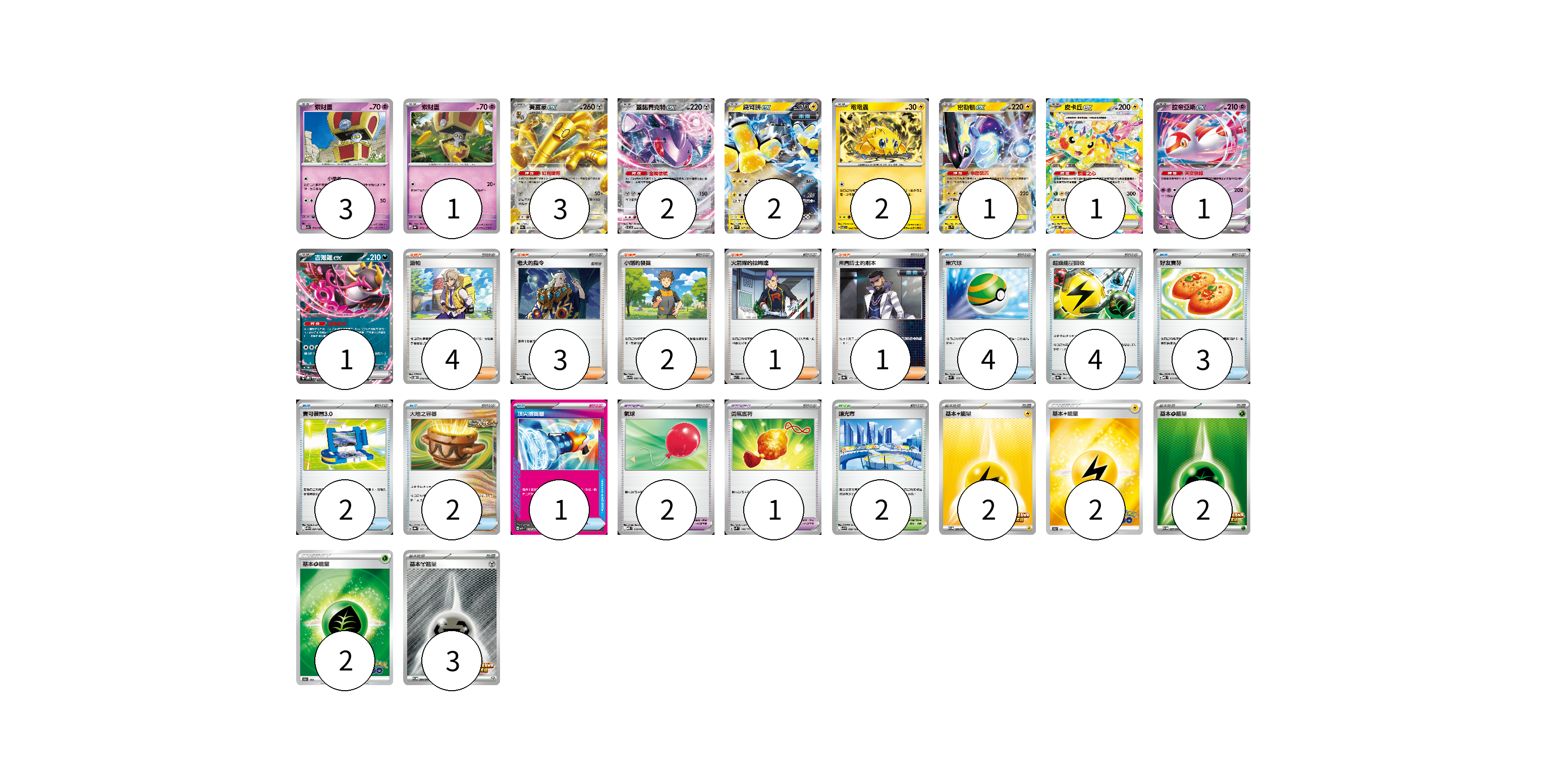 牌組構築方案 以此牌組為基礎新構築牌組 顯示卡面 顯示列表 寶可夢卡(17) 3 1 3 2 2 2 1 1 1 1 寶可夢道具(3) 2 1 物品卡(16) 4 4 3 2 2 1 支援者卡(11) 4 3 2 1 1 競技場卡(2) 2 能量卡(11) 2 2 2 2 3 寶可夢卡(17) 卡牌名稱 張數 卡牌名稱 張數 索財靈 SV7a 024/064 03 索財靈 SV8a 073/187 01 賽富豪ex SV3a 050/062 03 蓋諾賽克特ex SV11B 069/086 02 鐵臂膀ex SV4M 027/066 02 電電蟲 SV7 032/102 02 密勒頓ex SV1V 037/078 01 皮卡丘ex SV8 033/106 01 拉帝亞斯ex MBD 003/022 01 吉雉雞ex SVOD 004/020 01 寶可夢道具(3) 卡牌名稱 張數 卡牌名稱 張數 氣球 MBD 018/022 02 勇氣護符 SVM 142/175 01 物品卡(16) 卡牌名稱 張數 卡牌名稱 張數 巢穴球 SVM 133/175 04 超級能量回收 SV8a 141/187 04 好友寶芬 MBD 013/022 03 寶可裝置3.0 SV11B 081/086 02 大地之容器 SV8a 143/187 02 頂尖捕捉器 MBG 014/022 01 支援者卡(11) 卡牌名稱 張數 卡牌名稱 張數 派帕 SVOD 018/020 04 老大的指令 MBD 020/022 03 小剛的發掘 SV9 096/100 02 火箭隊的拉姆達 SV10 094/098 01 弗圖博士的劇本 SV8a 175/187 01 競技場卡(2) 卡牌名稱 張數 卡牌名稱 張數 釀光市 SV9 098/100 02 能量卡(11) 卡牌名稱 張數 卡牌名稱 張數 基本【雷】能量 SV-P 260/SV-P 02 基本雷能量 S10b LIG 02 基本【草】能量 SV-P 257/SV-P 02 基本草能量 S10b GRA 02 基本【鋼】能量 SV-P 264/SV-P 03 以此牌組為基礎新構築牌組 牌組編碼 Jikvqu-utSyjI-pyyfFp copy 列印牌組單 牌組編碼已複製 分享至SNS
