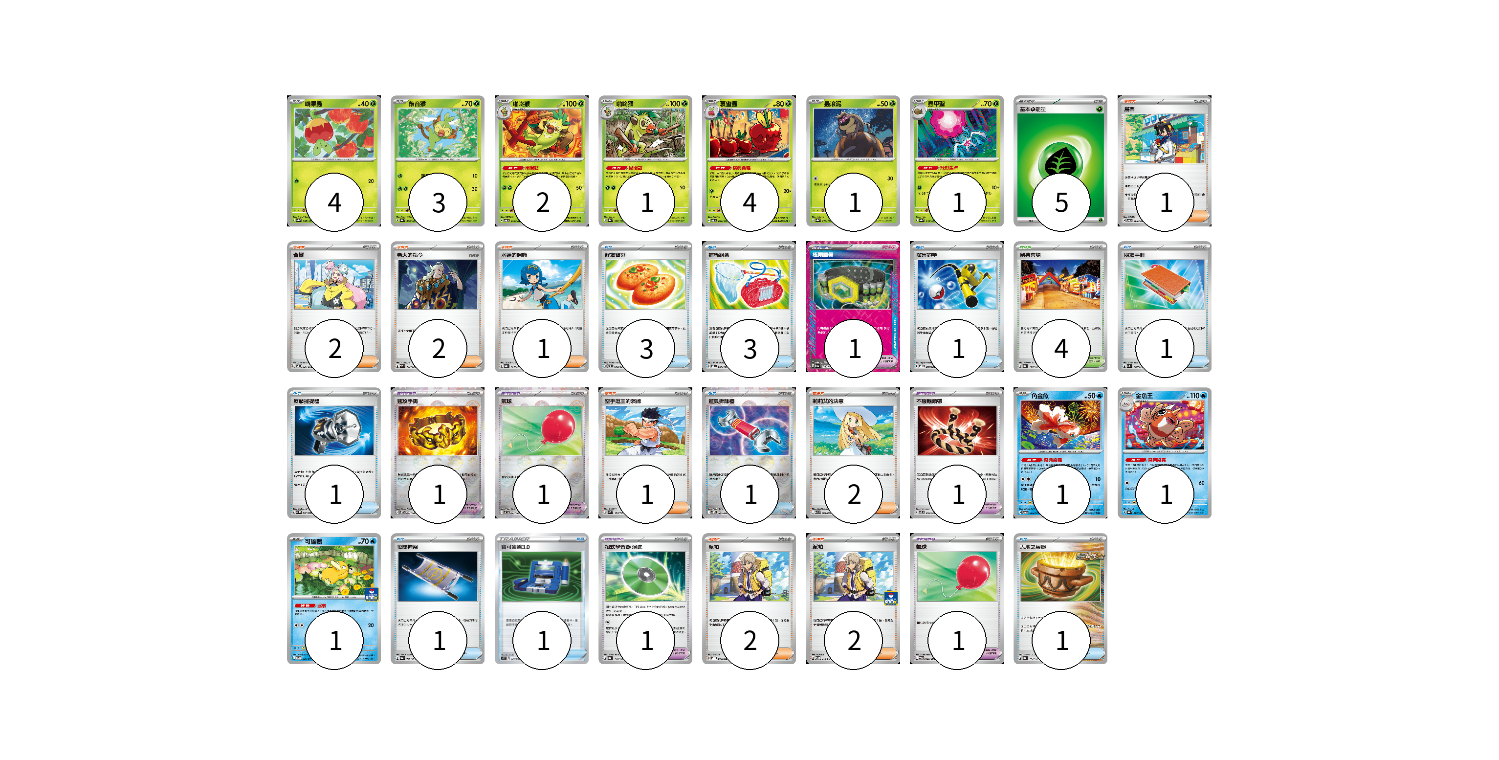 牌組構築方案 以此牌組為基礎新構築牌組 顯示卡面 顯示列表 寶可夢卡(19) 4 3 2 1 4 1 1 1 1 1 寶可夢道具(6) 1 1 1 1 1 1 物品卡(13) 3 3 1 1 1 1 1 1 1 支援者卡(13) 1 2 2 1 1 2 2 2 競技場卡(4) 4 能量卡(5) 5 寶可夢卡(19) 卡牌名稱 張數 卡牌名稱 張數 啃果蟲 SV8a 008/187 04 敲音猴 SV8a 006/187 03 啪咚猴 SV6 009/101 02 啪咚猴 SV8a 007/187 01 裹蜜蟲 SV6 012/101 04 蟲滾泥 SV8a 013/187 01 蟲甲聖 SV8a 014/187 01 角金魚 SV6 026/101 01 金魚王 SV8a 029/187 01 可達鴨 SV-P 220/SV-P 01 寶可夢道具(6) 卡牌名稱 張數 卡牌名稱 張數 極限腰帶 SV5K 066/071 01 猛攻手鐲 SV11W 082/086 01 氣球 SV11B 082/086 01 不服輸頭帶 SVTL 016/021 01 招式學習器 演進 SV8a 160/187 01 氣球 SV11B 082/086 01 物品卡(13) 卡牌名稱 張數 卡牌名稱 張數 好友寶芬 SVTL 010/021 03 捕蟲組合 SV6 094/101 03 厲害釣竿 SVOD 010/020 01 朋友手冊 SV1S 069/078 01 反擊捕捉器 SV4M 059/066 01 道具拆除器 SV11W 080/086 01 夜間擔架 SV6a 056/064 01 寶可齒輪3.0 SJ 021/028 01 大地之容器 SV8a 143/187 01 支援者卡(13) 卡牌名稱 張數 卡牌名稱 張數 烏栗 SV6 096/101 01 奇樹 SVF 029/038 02 老大的指令 SVHM 022/022 02 水蓮的照顧 SV8a 168/187 01 空手道王的演練 SVM 144/175 01 莉莉艾的決意 M1L 062/063 02 派帕 SVOD 018/020 02 派帕 SV-P 213/SV-P 02 競技場卡(4) 卡牌名稱 張數 卡牌名稱 張數 祭典會場 SV8a 180/187 04 能量卡(5) 卡牌名稱 張數 卡牌名稱 張數 基本草能量 sv-p GRA 05 以此牌組為基礎新構築牌組 牌組編碼 Jkqmzs-qcuInT-AeomVh copy 列印牌組單 牌組編碼已複製 分享至SNS