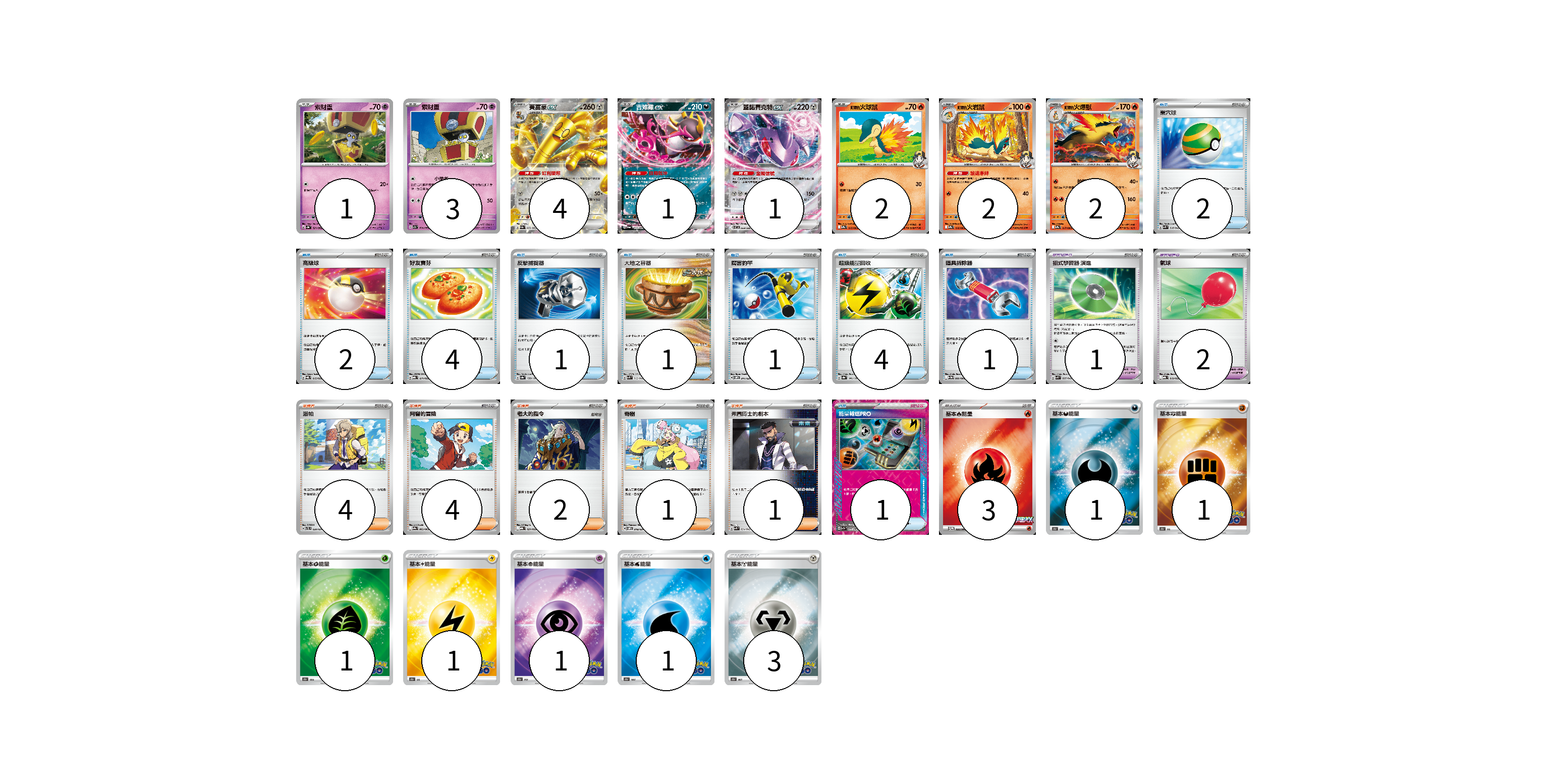 牌組構築方案 以此牌組為基礎新構築牌組 顯示卡面 顯示列表 寶可夢卡(16) 1 3 4 1 1 2 2 2 寶可夢道具(3) 1 2 物品卡(17) 2 2 4 1 1 1 4 1 1 支援者卡(12) 4 4 2 1 1 能量卡(12) 3 1 1 1 1 1 1 3 寶可夢卡(16) 卡牌名稱 張數 卡牌名稱 張數 索財靈 SV3a 021/062 01 索財靈 SV7a 024/064 03 賽富豪ex SV3a 050/062 04 吉雉雞ex SV6a 038/064 01 蓋諾賽克特ex SV11B 069/086 01 <阿響的>火球鼠 SV9a 015/063 02 <阿響的>火岩鼠 SV9a 016/063 02 <阿響的>火爆獸 SV9a 017/063 02 寶可夢道具(3) 卡牌名稱 張數 卡牌名稱 張數 招式學習器 演進 SVK 025/042 01 氣球 MBG 019/022 02 物品卡(17) 卡牌名稱 張數 卡牌名稱 張數 巢穴球 SVK 016/042 02 高級球 SVQL 015/022 02 好友寶芬 MBG 011/022 04 反擊捕捉器 SV8a 139/187 01 大地之容器 SVK 012/042 01 厲害釣竿 SVOM 011/021 01 超級能量回收 SV8a 141/187 04 道具拆除器 SV11W 080/086 01 能量輸送PRO SV7a 052/064 01 支援者卡(12) 卡牌名稱 張數 卡牌名稱 張數 派帕 SVTL 020/021 04 阿響的冒險 SV9a 063/063 04 老大的指令 MBG 021/022 02 奇樹 SVOM 018/021 01 弗圖博士的劇本 SVK 034/042 01 能量卡(12) 卡牌名稱 張數 卡牌名稱 張數 基本【火】能量 M-P 032/M-P 03 基本惡能量 S10b DAR 01 基本鬥能量 S10b FIG 01 基本草能量 S10b GRA 01 基本雷能量 S10b LIG 01 基本超能量 S10b PSY 01 基本水能量 S10b WAT 01 基本鋼能量 S10b MET 03 以此牌組為基礎新構築牌組 牌組編碼 JlPLCQ-MORzpl-laqnYy copy 列印牌組單 牌組編碼已複製 分享至SNS