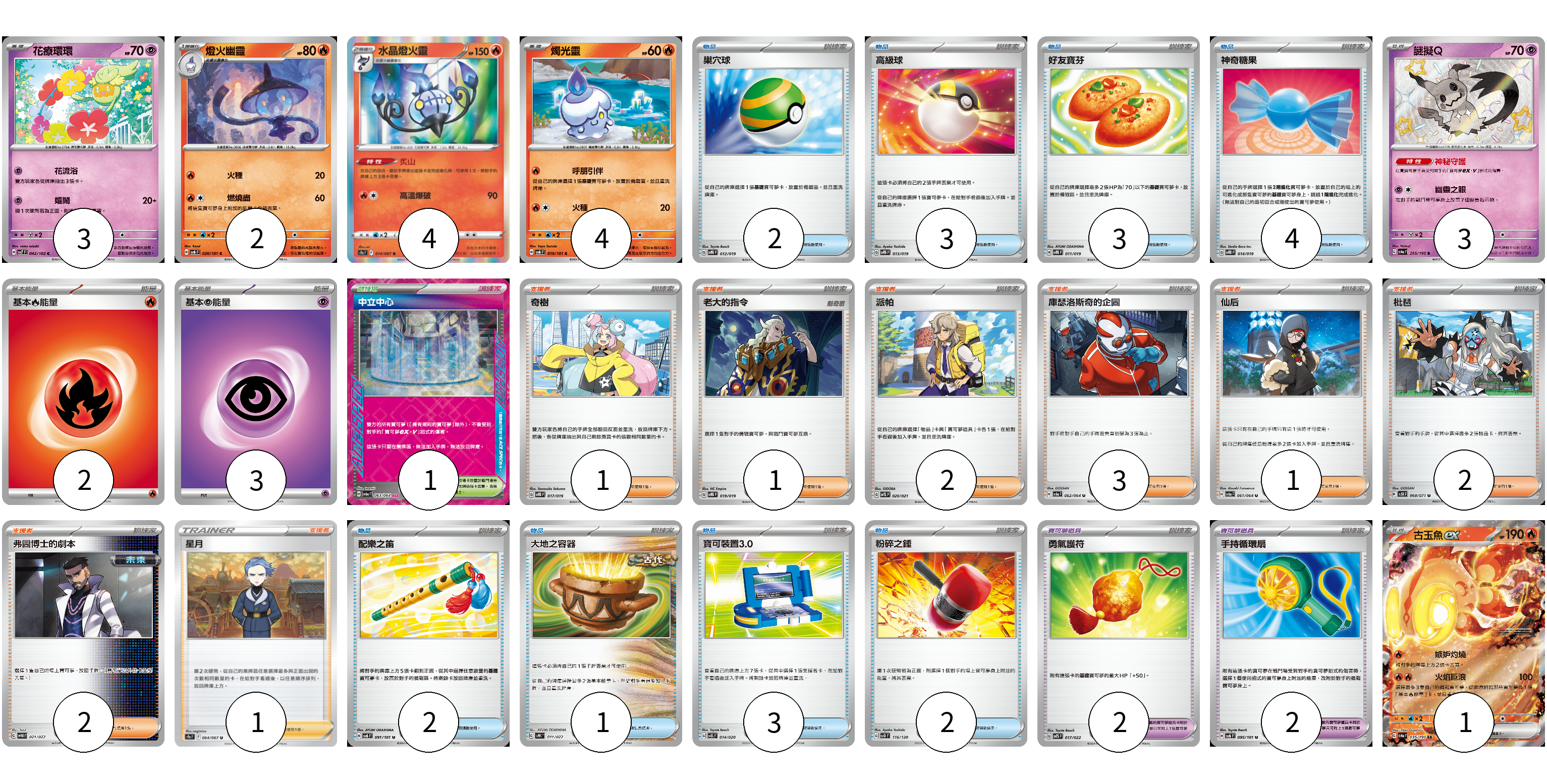 牌組構築方案 以此牌組為基礎新構築牌組 顯示卡面 顯示列表 寶可夢卡(17) 3 2 4 4 3 1 寶可夢道具(4) 2 2 物品卡(20) 2 3 3 4 2 1 3 2 支援者卡(13) 1 1 2 3 1 2 2 1 競技場卡(1) 1 能量卡(5) 2 3 寶可夢卡(17) 卡牌名稱 張數 卡牌名稱 張數 花療環環 SV7 042/102 03 燈火幽靈 SV6 020/101 02 水晶燈火靈 S9a 014/067 04 燭光靈 SV6 019/101 04 謎擬Q SV4a 265/190 03 古玉魚ex SV4a 035/190 01 寶可夢道具(4) 卡牌名稱 張數 卡牌名稱 張數 勇氣護符 SVTS 017/022 02 手持循環扇 SV6 095/101 02 物品卡(20) 卡牌名稱 張數 卡牌名稱 張數 巢穴球 SVTG 012/019 02 高級球 SVTG 013/019 03 好友寶芬 SVTG 011/019 03 神奇糖果 SVTG 014/019 04 配樂之笛 SV6 091/101 02 大地之容器 SVHK 011/022 01 寶可裝置3.0 SVEL 014/020 03 粉碎之錘 SVD 116/139 02 支援者卡(13) 卡牌名稱 張數 卡牌名稱 張數 奇樹 SVTG 017/019 01 老大的指令 SVTG 019/019 01 派帕 SVTL 020/021 02 庫瑟洛斯奇的企圖 SV6a 062/064 03 仙后 SV6a 061/064 01 枇琶 SV5K 068/071 02 弗圖博士的劇本 SVHM 021/022 02 星月 S9a 064/067 01 競技場卡(1) 卡牌名稱 張數 卡牌名稱 張數 中立中心 SV6a 063/064 01 能量卡(5) 卡牌名稱 張數 卡牌名稱 張數 基本【火】能量 SVTL FIR 02 基本【超】能量 SVTS PSY 03 以此牌組為基礎新構築牌組 牌組編碼 JlZote-doeAQE-XhSfPo copy 列印牌組單 牌組編碼已複製 分享至SNS