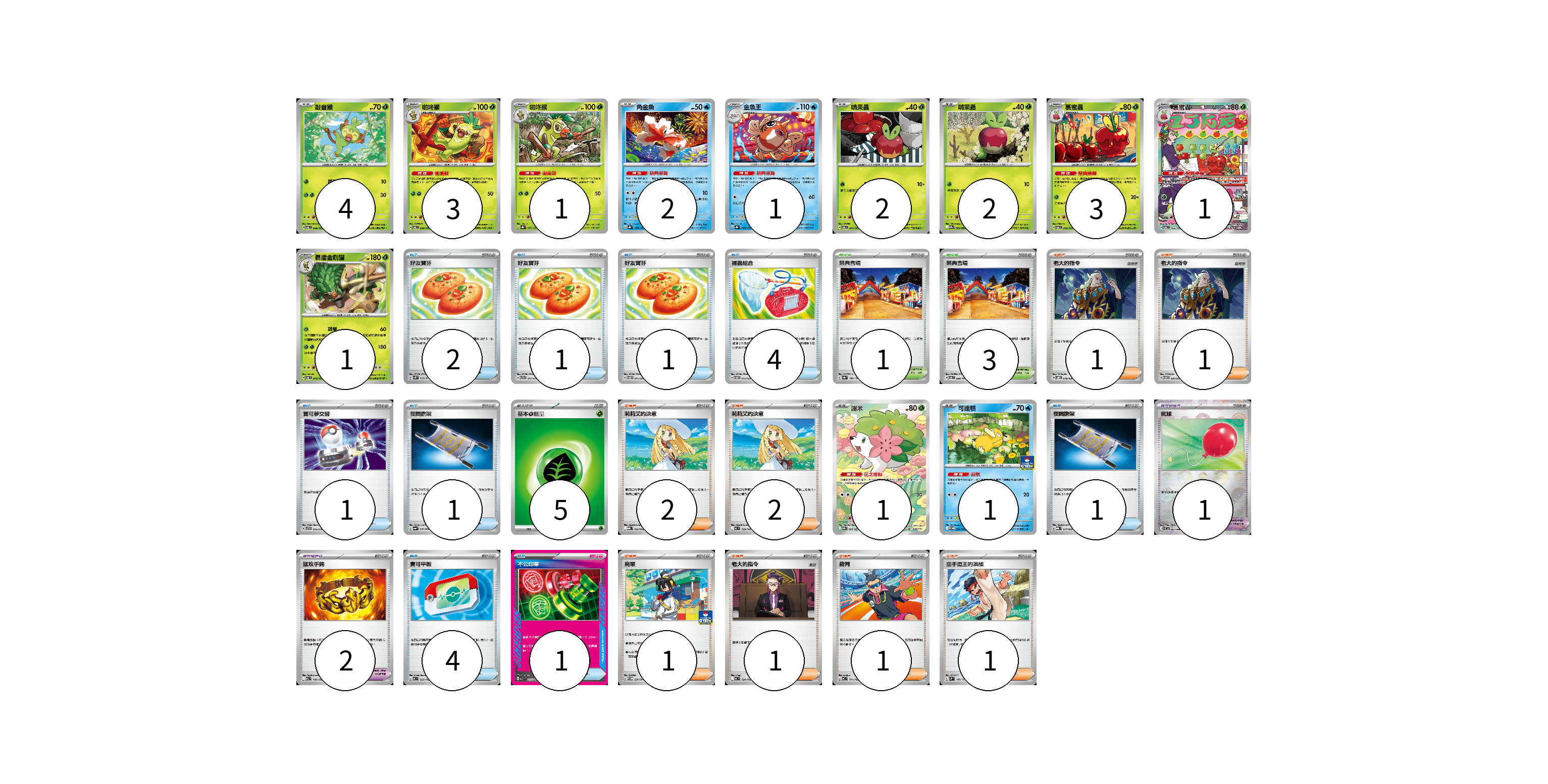 牌組構築方案 以此牌組為基礎新構築牌組 顯示卡面 顯示列表 寶可夢卡(22) 4 3 1 2 1 2 2 3 1 1 1 1 寶可夢道具(3) 1 2 物品卡(16) 2 1 1 4 1 1 1 4 1 支援者卡(10) 1 1 2 2 1 1 1 1 競技場卡(4) 1 3 能量卡(5) 5 寶可夢卡(22) 卡牌名稱 張數 卡牌名稱 張數 敲音猴 SV6 008/101 04 啪咚猴 SV6 009/101 03 啪咚猴 SV8a 007/187 01 角金魚 SV8a 028/187 02 金魚王 SV8a 029/187 01 啃果蟲 SV6 011/101 02 啃果蟲 SV9a 009/063 02 裹蜜蟲 SV6 012/101 03 裹蜜蟲 SV6 103/101 01 轟擂金剛猩 SV6 010/101 01 謝米 SV9a 066/063 01 可達鴨 SV-P 220/SV-P 01 寶可夢道具(3) 卡牌名稱 張數 卡牌名稱 張數 氣球 SV11B 082/086 01 猛攻手鐲 M2a 166/193 02 物品卡(16) 卡牌名稱 張數 卡牌名稱 張數 好友寶芬 SV5K 063/071 02 好友寶芬 SVTG 011/019 01 好友寶芬 SVTM 011/022 01 捕蟲組合 SVTM 015/022 04 寶可夢交替 SVTH 012/018 01 夜間擔架 SV6a 056/064 01 夜間擔架 MBG 017/022 01 寶可平板 MC 662/742 04 不公印章 MBD 011/022 01 支援者卡(10) 卡牌名稱 張數 卡牌名稱 張數 老大的指令 SVOD 019/020 01 老大的指令 SVTM 020/022 01 莉莉艾的決意 MBG 022/022 02 莉莉艾的決意 MC 729/742 02 烏栗 SV-P 229/SV-P 01 老大的指令 MC 724/742 01 裁判 MC 711/742 01 空手道王的演練 SVM 145/175 01 競技場卡(4) 卡牌名稱 張數 卡牌名稱 張數 祭典會場 SV8a 180/187 01 祭典會場 SV6 099/101 03 能量卡(5) 卡牌名稱 張數 卡牌名稱 張數 基本草能量 sv-p GRA 05 以此牌組為基礎新構築牌組 牌組編碼 JpCjWB-usnPYJ-xymmBV copy 列印牌組單 牌組編碼已複製 分享至SNS
