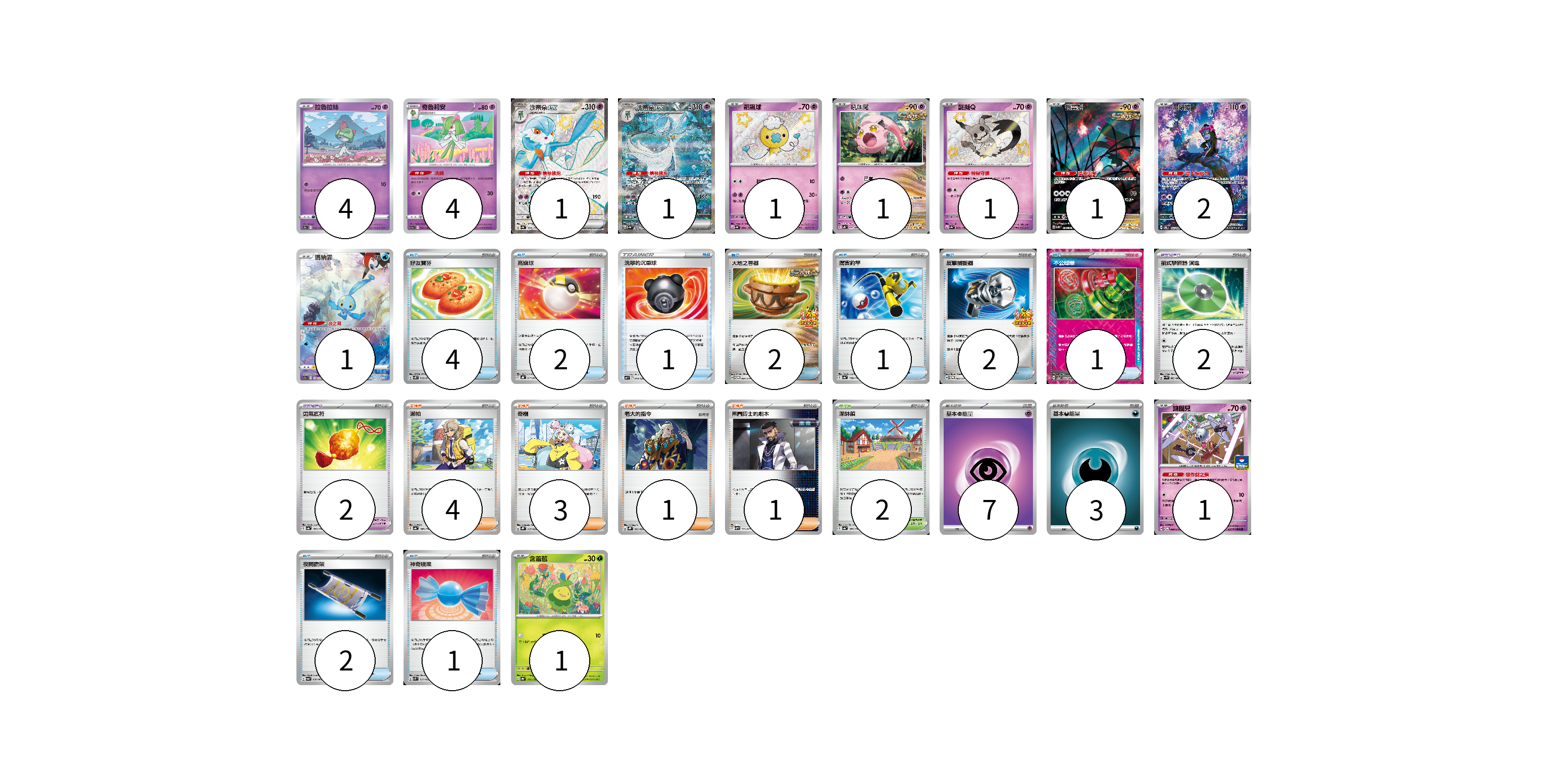 牌組構築方案 以此牌組為基礎新構築牌組 顯示卡面 顯示列表 寶可夢卡(19) 4 4 1 1 1 1 1 1 2 1 1 1 寶可夢道具(4) 2 2 物品卡(16) 4 2 1 2 1 2 1 2 1 支援者卡(9) 4 3 1 1 競技場卡(2) 2 能量卡(10) 7 3 寶可夢卡(19) 卡牌名稱 張數 卡牌名稱 張數 拉魯拉絲 S9a 032/067 04 奇魯莉安 S11a 037/068 04 沙奈朵ex SV4a 328/190 01 沙奈朵ex SV4a 348/190 01 飄飄球 SV4a 260/190 01 吼叫尾 SV4K 032/066 01 謎擬Q SV4a 265/190 01 振翼髮 SV5K 076/071 01 願增猿 SV6 107/101 02 瑪納霏 S12a 178/172 01 鑰圈兒 SV-P 089/SV-P 01 含羞苞 SV8a 001/187 01 寶可夢道具(4) 卡牌名稱 張數 卡牌名稱 張數 招式學習器 演進 SV4M 063/066 02 勇氣護符 SV4a 169/190 02 物品卡(16) 卡牌名稱 張數 卡牌名稱 張數 好友寶芬 SV5K 063/071 04 高級球 SVHK 013/022 02 洗翠的沉重球 SVF 019/038 01 大地之容器 SV-P 084/SV-P 02 厲害釣竿 SV4a 158/190 01 反擊捕捉器 SV-P 083/SV-P 02 不公印章 SV5a 053/066 01 夜間擔架 SV6a 056/064 02 神奇糖果 SVK 019/042 01 支援者卡(9) 卡牌名稱 張數 卡牌名稱 張數 派帕 SV4a 180/190 04 奇樹 SVHK 019/022 03 老大的指令 SVHK 022/022 01 弗圖博士的劇本 SVHM 021/022 01 競技場卡(2) 卡牌名稱 張數 卡牌名稱 張數 深缽鎮 SV4a 185/190 02 能量卡(10) 卡牌名稱 張數 卡牌名稱 張數 基本【超】能量 SVHM PSY 07 基本【惡】能量 SVF DAR 03 以此牌組為基礎新構築牌組 牌組編碼 JpdddC-vWddkj-AZBDte copy 列印牌組單 牌組編碼已複製 分享至SNS