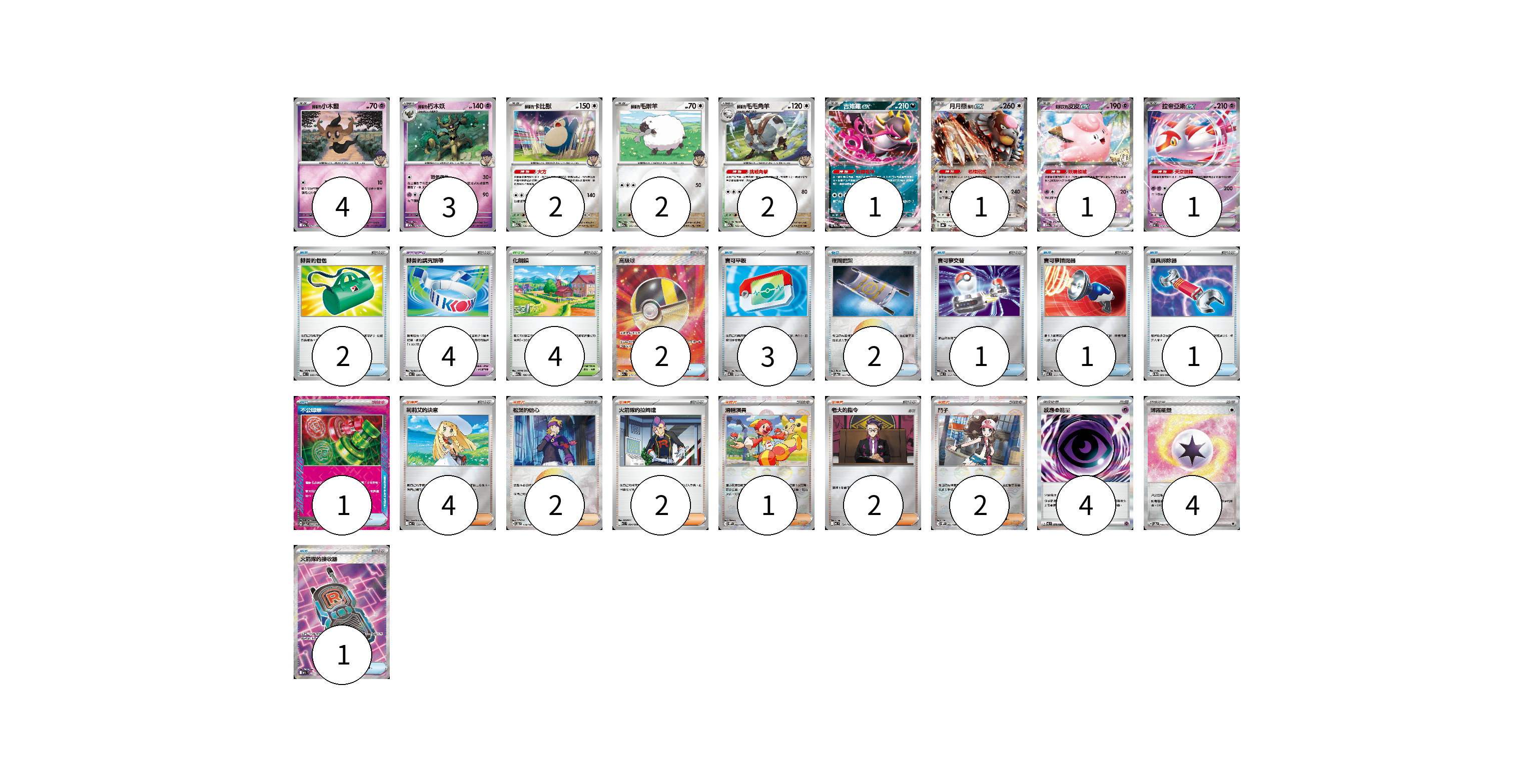 牌組構築方案 以此牌組為基礎新構築牌組 顯示卡面 顯示列表 寶可夢卡(17) 4 3 2 2 2 1 1 1 1 寶可夢道具(4) 4 物品卡(14) 2 2 3 2 1 1 1 1 1 支援者卡(13) 4 2 2 1 2 2 競技場卡(4) 4 能量卡(8) 4 4 寶可夢卡(17) 卡牌名稱 張數 卡牌名稱 張數 赫普的小木靈 M2a 077/193 04 赫普的朽木妖 M2a 078/193 03 赫普的卡比獸 M2a 136/193 02 赫普的毛辮羊 M2a 141/193 02 赫普的毛毛角羊 M2a 142/193 02 吉雉雞ex M2a 114/193 01 月月熊 赫月ex SV8a 134/187 01 莉莉艾的皮皮ex M2a 060/193 01 拉帝亞斯ex MC 312/742 01 寶可夢道具(4) 卡牌名稱 張數 卡牌名稱 張數 赫普的講究頭帶 MC 690/742 04 物品卡(14) 卡牌名稱 張數 卡牌名稱 張數 赫普的包包 MC 666/742 02 高級球 M2a 216/193 02 寶可平板 MC 662/742 03 夜間擔架 SV8a 151/187 02 寶可夢交替 MC 663/742 01 寶可夢捕捉器 MC 665/742 01 道具拆除器 SV11W 080/086 01 不公印章 SV5a 053/066 01 火箭隊的接收器 M2a 217/193 01 支援者卡(13) 卡牌名稱 張數 卡牌名稱 張數 莉莉艾的決意 MC 729/742 04 松葉的信心 SV8a 178/187 02 火箭隊的拉姆達 SV10 094/098 02 滑稽演員 SV11W 083/086 01 老大的指令 MC 724/742 02 鬥子 SV11W 085/086 02 競技場卡(4) 卡牌名稱 張數 卡牌名稱 張數 化朗鎮 M2a 186/193 04 能量卡(8) 卡牌名稱 張數 卡牌名稱 張數 感應【超】能量 M3 079/080 04 薄霧能量 SV8a 186/187 04 以此牌組為基礎新構築牌組 牌組編碼 JrLdjo-bkcmrf-MgDEOh copy 列印牌組單 牌組編碼已複製 分享至SNS