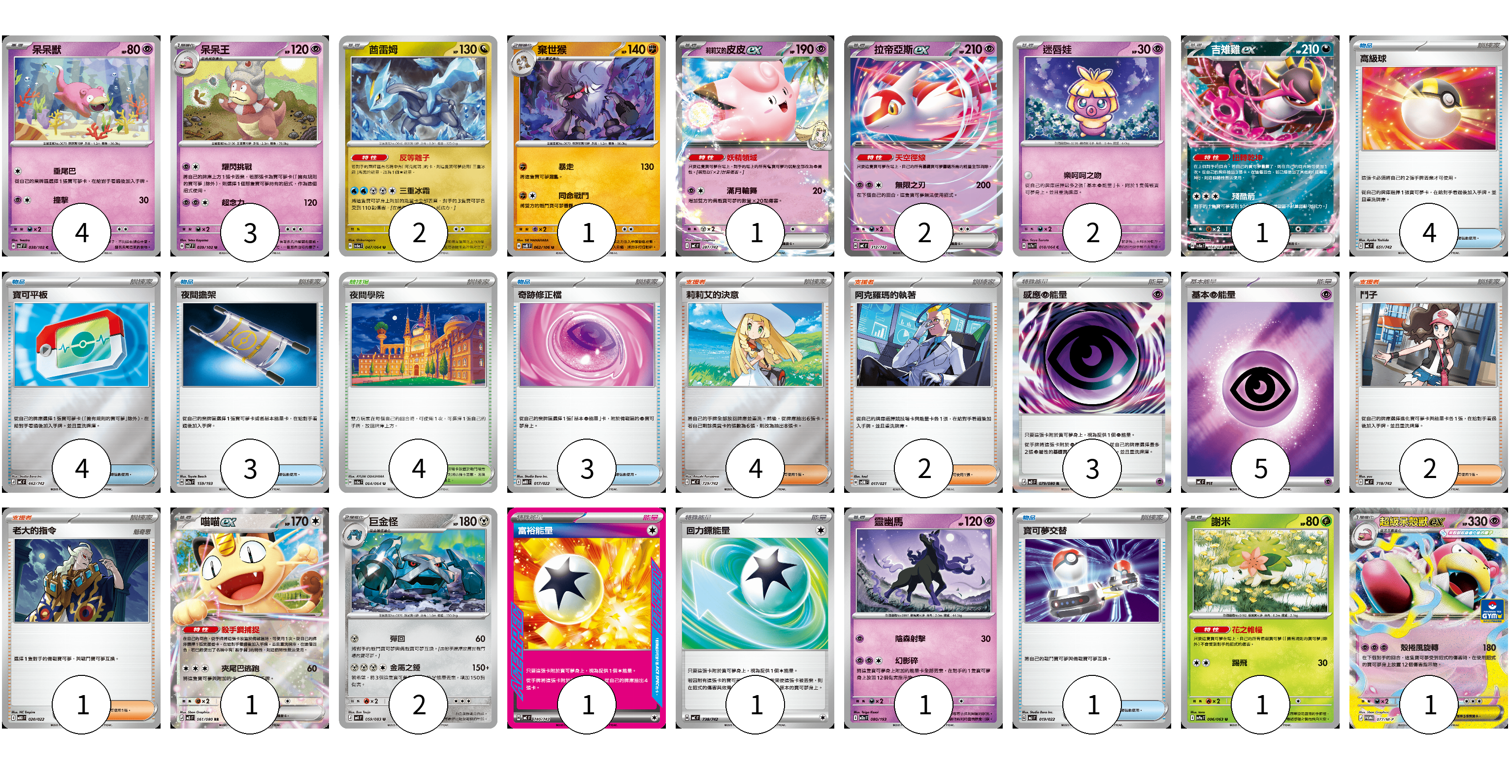 牌組構築方案 以此牌組為基礎新構築牌組 顯示卡面 顯示列表 寶可夢卡(22) 4 3 2 1 1 2 2 1 1 2 1 1 1 物品卡(15) 4 4 3 3 1 支援者卡(9) 4 2 2 1 競技場卡(4) 4 能量卡(10) 3 5 1 1 寶可夢卡(22) 卡牌名稱 張數 卡牌名稱 張數 呆呆獸 SV7 038/102 04 呆呆王 SV7 039/102 03 酋雷姆 SV6a 047/064 02 棄世猴 SV8 062/106 01 <莉莉艾的>皮皮ex MC 287/742 01 拉帝亞斯ex MC 312/742 02 迷唇娃 SV7a 018/064 02 吉雉雞ex SV8a 104/187 01 喵喵ex M3 061/080 01 巨金怪 M4 059/083 02 靈幽馬 M2a 080/193 01 謝米 SV9a 006/063 01 超級呆殼獸ex M-P 077/M-P 01 物品卡(15) 卡牌名稱 張數 卡牌名稱 張數 高級球 MC 651/742 04 寶可平板 MC 662/742 04 夜間擔架 M2a 159/193 03 奇跡修正檔 MBD 017/022 03 寶可夢交替 MJ 019/022 01 支援者卡(9) 卡牌名稱 張數 卡牌名稱 張數 莉莉艾的決意 MC 729/742 04 阿克羅瑪的執著 SVOM 017/021 02 鬥子 MC 718/742 02 老大的指令 MBD 020/022 01 競技場卡(4) 卡牌名稱 張數 卡牌名稱 張數 夜間學院 SV6a 064/064 04 能量卡(10) 卡牌名稱 張數 卡牌名稱 張數 感應【超】能量 M3 079/080 03 基本【超】能量 MC PSY 05 富裕能量 MC 740/742 01 回力鏢能量 MC 738/742 01 以此牌組為基礎新構築牌組 牌組編碼 Jrhncu-pDnykg-DhnSdY copy 列印牌組單 牌組編碼已複製 分享至SNS
