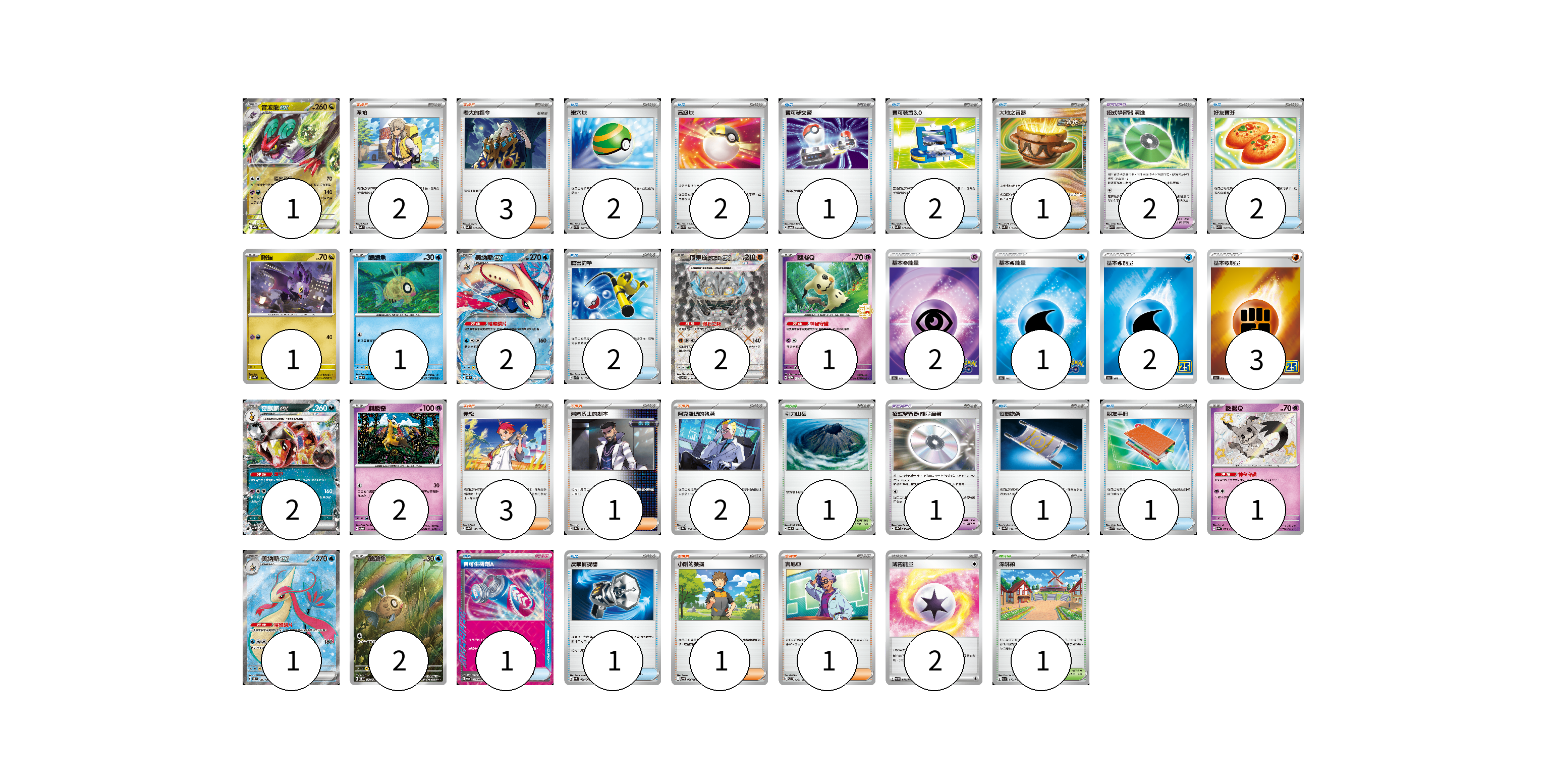牌組構築方案 以此牌組為基礎新構築牌組 顯示卡面 顯示列表 寶可夢卡(16) 1 1 1 2 2 1 2 2 1 1 2 寶可夢道具(3) 2 1 物品卡(16) 2 2 1 2 1 2 2 1 1 1 1 支援者卡(13) 2 3 3 1 2 1 1 競技場卡(2) 1 1 能量卡(10) 2 1 2 3 2 寶可夢卡(16) 卡牌名稱 張數 卡牌名稱 張數 音波龍ex SV4a 135/190 01 嗡蝠 SV4a 134/190 01 醜醜魚 SV8 025/106 01 美納斯ex SV8 026/106 02 厄鬼椪 礎石面具ex SV6 119/101 02 謎擬Q SV-P 170/SV-P 01 奇麒麟ex SV5M 042/071 02 麒麟奇 SV5a 034/066 02 謎擬Q SV4a 265/190 01 美納斯ex SV8 121/106 01 醜醜魚 SV8 110/106 02 寶可夢道具(3) 卡牌名稱 張數 卡牌名稱 張數 招式學習器 演進 SVK 025/042 02 招式學習器 能量渦輪 SV3a 056/062 01 物品卡(16) 卡牌名稱 張數 卡牌名稱 張數 巢穴球 SVK 016/042 02 高級球 SVK 018/042 02 寶可夢交替 SV5a 056/066 01 寶可裝置3.0 SVK 021/042 02 大地之容器 SVK 012/042 01 好友寶芬 SVK 015/042 02 厲害釣竿 SVK 011/042 02 夜間擔架 SV8a 151/187 01 朋友手冊 SVK 014/042 01 寶可生機劑A SV6a 055/064 01 反擊捕捉器 SV4M 059/066 01 支援者卡(13) 卡牌名稱 張數 卡牌名稱 張數 派帕 SVK 035/042 02 老大的指令 SVK 036/042 03 赤松 SV8a 163/187 03 弗圖博士的劇本 SV8a 175/187 01 阿克羅瑪的執著 SV8a 164/187 02 小剛的發掘 SV9 096/100 01 吉尼亞 SVD 129/139 01 競技場卡(2) 卡牌名稱 張數 卡牌名稱 張數 引力山岳 SV8 106/106 01 深缽鎮 SV1a 070/073 01 能量卡(10) 卡牌名稱 張數 卡牌名稱 張數 基本超能量 S10b PSY 02 基本水能量 S10b WAT 01 基本水能量 S8a WAT 02 基本鬥能量 S8a FIG 03 薄霧能量 SV5M 071/071 02 以此牌組為基礎新構築牌組 牌組編碼 JsKnvm-jhdguv-NmqUIE copy 列印牌組單 牌組編碼已複製 分享至SNS