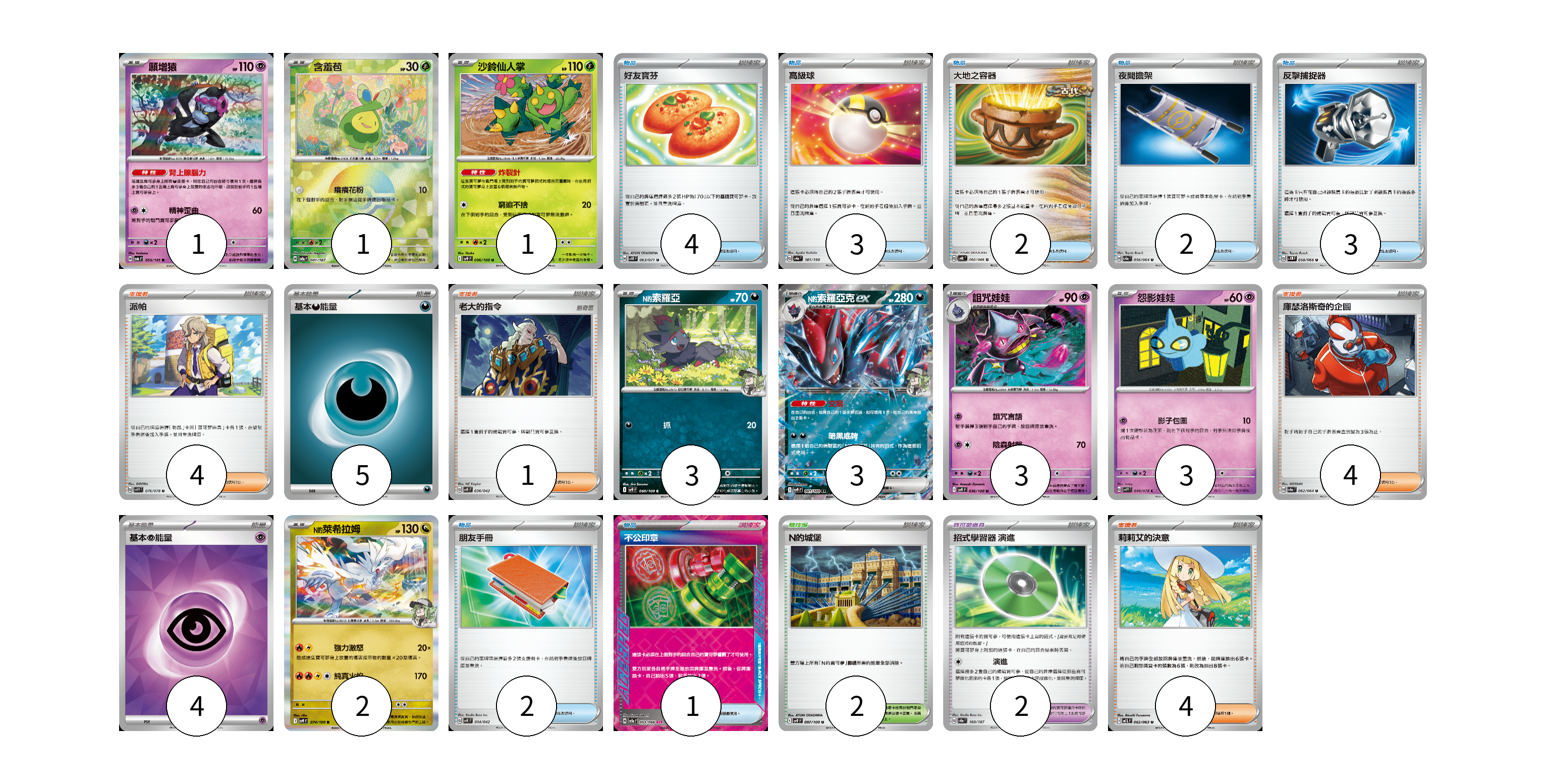 牌組構築方案 以此牌組為基礎新構築牌組 顯示卡面 顯示列表 寶可夢卡(17) 1 1 1 3 3 3 3 2 寶可夢道具(2) 2 物品卡(17) 4 3 2 2 3 2 1 支援者卡(13) 4 1 4 4 競技場卡(2) 2 能量卡(9) 5 4 寶可夢卡(17) 卡牌名稱 張數 卡牌名稱 張數 願增猿 SV6 055/101 01 含羞苞 SV8a 001/187 01 沙鈴仙人掌 SV9 006/100 01 N的索羅亞 SV9 060/100 03 N的索羅亞克ex SV9 061/100 03 詛咒娃娃 SV9 036/100 03 怨影娃娃 SV1V 040/078 03 N的萊希拉姆 SV9 074/100 02 寶可夢道具(2) 卡牌名稱 張數 卡牌名稱 張數 招式學習器 演進 SV8a 160/187 02 物品卡(17) 卡牌名稱 張數 卡牌名稱 張數 好友寶芬 SV5K 063/071 04 高級球 SV4a 161/190 03 大地之容器 SV4K 060/066 02 夜間擔架 SV6a 056/064 02 反擊捕捉器 SV4M 059/066 03 朋友手冊 SVK 014/042 02 不公印章 SV5a 053/066 01 支援者卡(13) 卡牌名稱 張數 卡牌名稱 張數 派帕 SV1V 076/078 04 老大的指令 SVK 036/042 01 庫瑟洛斯奇的企圖 SV6a 062/064 04 莉莉艾的決意 M1L 062/063 04 競技場卡(2) 卡牌名稱 張數 卡牌名稱 張數 N的城堡 SV9 097/100 02 能量卡(9) 卡牌名稱 張數 卡牌名稱 張數 基本惡能量 sv-p DAR 05 基本【超】能量 SVOD PSY 04 以此牌組為基礎新構築牌組 牌組編碼 JtTmSv-gNMBVG-yHdxiX copy 列印牌組單 牌組編碼已複製 分享至SNS