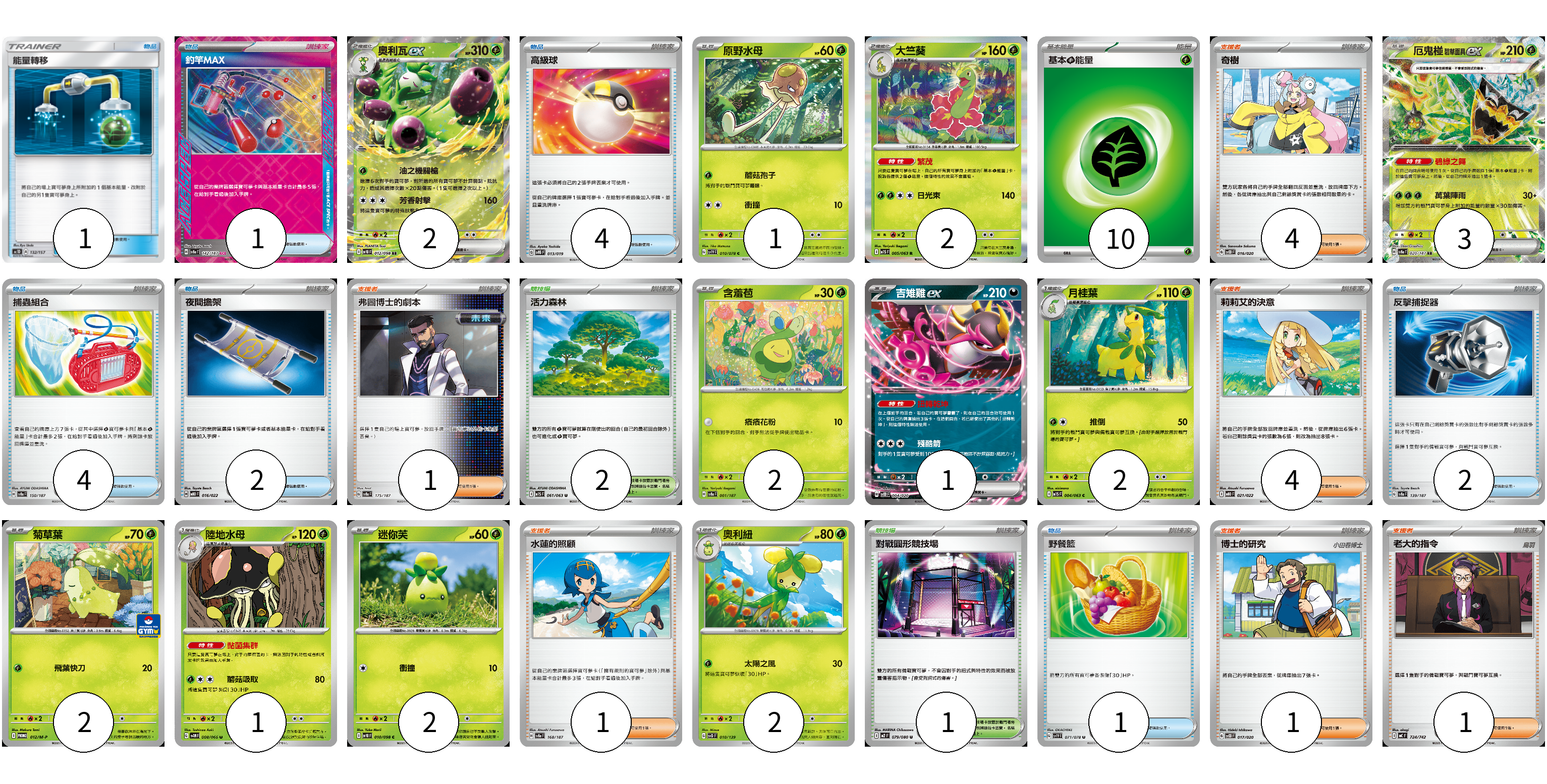 牌組構築方案 以此牌組為基礎新構築牌組 顯示卡面 顯示列表 寶可夢卡(20) 2 1 2 3 2 1 2 2 1 2 2 物品卡(15) 1 1 4 4 2 2 1 支援者卡(12) 4 1 4 1 1 1 競技場卡(3) 2 1 能量卡(10) 10 寶可夢卡(20) 卡牌名稱 張數 卡牌名稱 張數 奧利瓦ex SV10 012/098 02 原野水母 SV1V 010/078 01 大竺葵 M1S 005/063 02 厄鬼椪 碧草面具ex SV8a 020/187 03 含羞苞 SV8a 001/187 02 吉雉雞ex SVOD 004/020 01 月桂葉 M1S 004/063 02 菊草葉 M-P 012/M-P 02 陸地水母 SV4M 008/066 01 迷你芙 SV10 010/098 02 奧利紐 SVD 010/139 02 物品卡(15) 卡牌名稱 張數 卡牌名稱 張數 能量轉移 AC1D 132/157 01 釣竿MAX SV8a 142/187 01 高級球 SVTG 013/019 04 捕蟲組合 SV8a 150/187 04 夜間擔架 MBD 016/022 02 反擊捕捉器 SV8a 139/187 02 野餐籃 SV1V 071/078 01 支援者卡(12) 卡牌名稱 張數 卡牌名稱 張數 奇樹 SVOD 016/020 04 弗圖博士的劇本 SV8a 175/187 01 莉莉艾的決意 MBD 021/022 04 水蓮的照顧 SV8a 168/187 01 博士的研究 SVOD 017/020 01 老大的指令 MC 724/742 01 競技場卡(3) 卡牌名稱 張數 卡牌名稱 張數 活力森林 M1S 061/063 02 對戰圓形競技場 M2 079/080 01 能量卡(10) 卡牌名稱 張數 卡牌名稱 張數 基本草能量 sv-p GRA 10 以此牌組為基礎新構築牌組 牌組編碼 JwDebd-QuMCTn-IfqShy copy 列印牌組單 牌組編碼已複製 分享至SNS