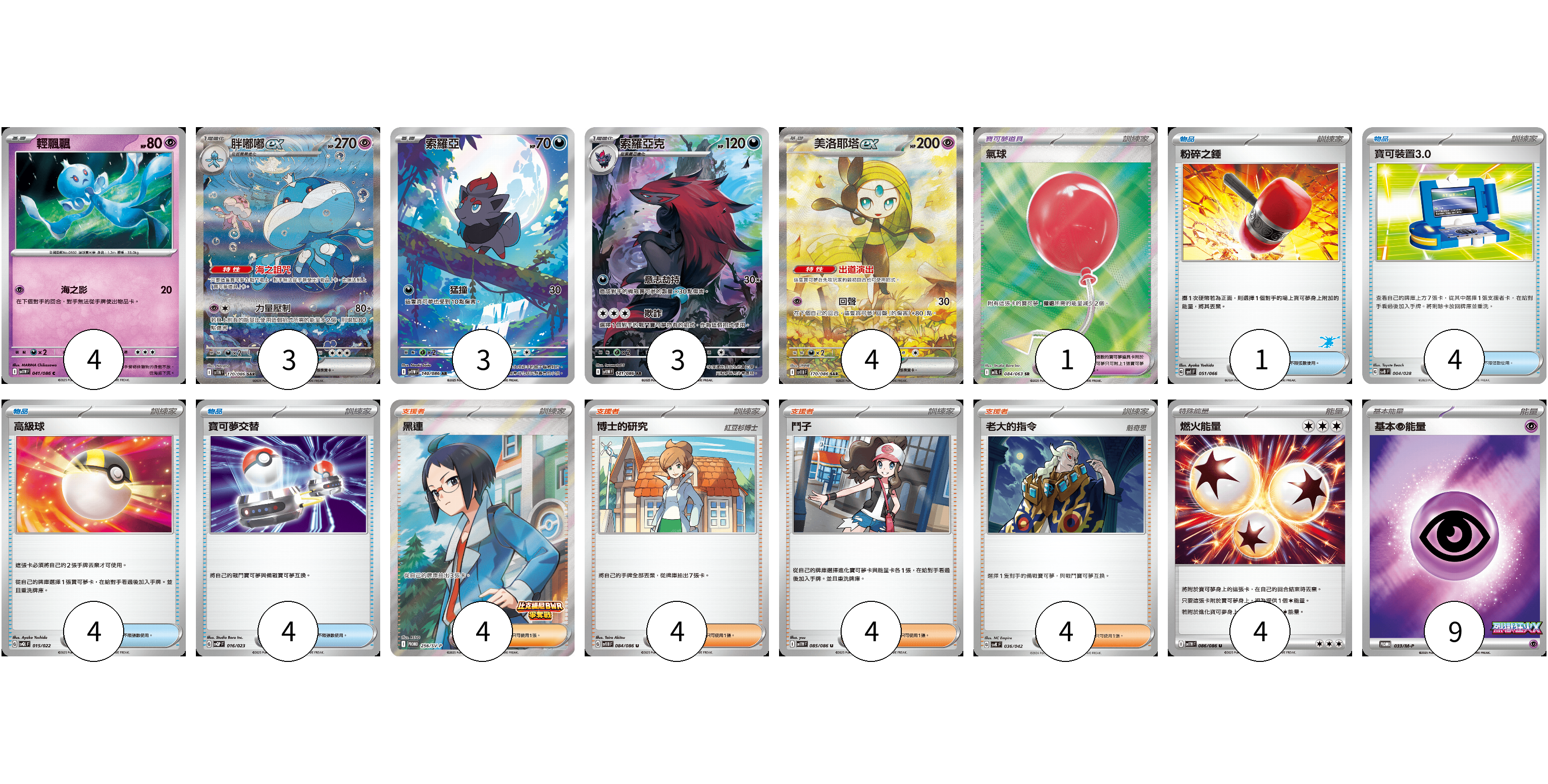 牌組構築方案 以此牌組為基礎新構築牌組 顯示卡面 顯示列表 寶可夢卡(17) 4 3 3 3 4 寶可夢道具(1) 1 物品卡(13) 1 4 4 4 支援者卡(16) 4 4 4 4 能量卡(13) 4 9 寶可夢卡(17) 卡牌名稱 張數 卡牌名稱 張數 輕飄飄 SV11W 041/086 04 胖嘟嘟ex SV11W 170/086 03 索羅亞 SV11W 140/086 03 索羅亞克 SV11W 141/086 03 美洛耶塔ex SV11B 170/086 04 寶可夢道具(1) 卡牌名稱 張數 卡牌名稱 張數 氣球 M1L 084/063 01 物品卡(13) 卡牌名稱 張數 卡牌名稱 張數 粉碎之錘 SVI 051/066 01 寶可裝置3.0 SVB 004/028 04 高級球 SVQL 015/022 04 寶可夢交替 SVQP 016/023 04 支援者卡(16) 卡牌名稱 張數 卡牌名稱 張數 黑連 SV-P 256/SV-P 04 博士的研究 SV11B 084/086 04 鬥子 SV11W 085/086 04 老大的指令 SVK 036/042 04 能量卡(13) 卡牌名稱 張數 卡牌名稱 張數 燃火能量 SV11W 086/086 04 基本【超】能量 M-P 033/M-P 09 以此牌組為基礎新構築牌組 牌組編碼 JxkGgQ-LnsgcM-WpnUbU copy 列印牌組單 牌組編碼已複製 分享至SNS
