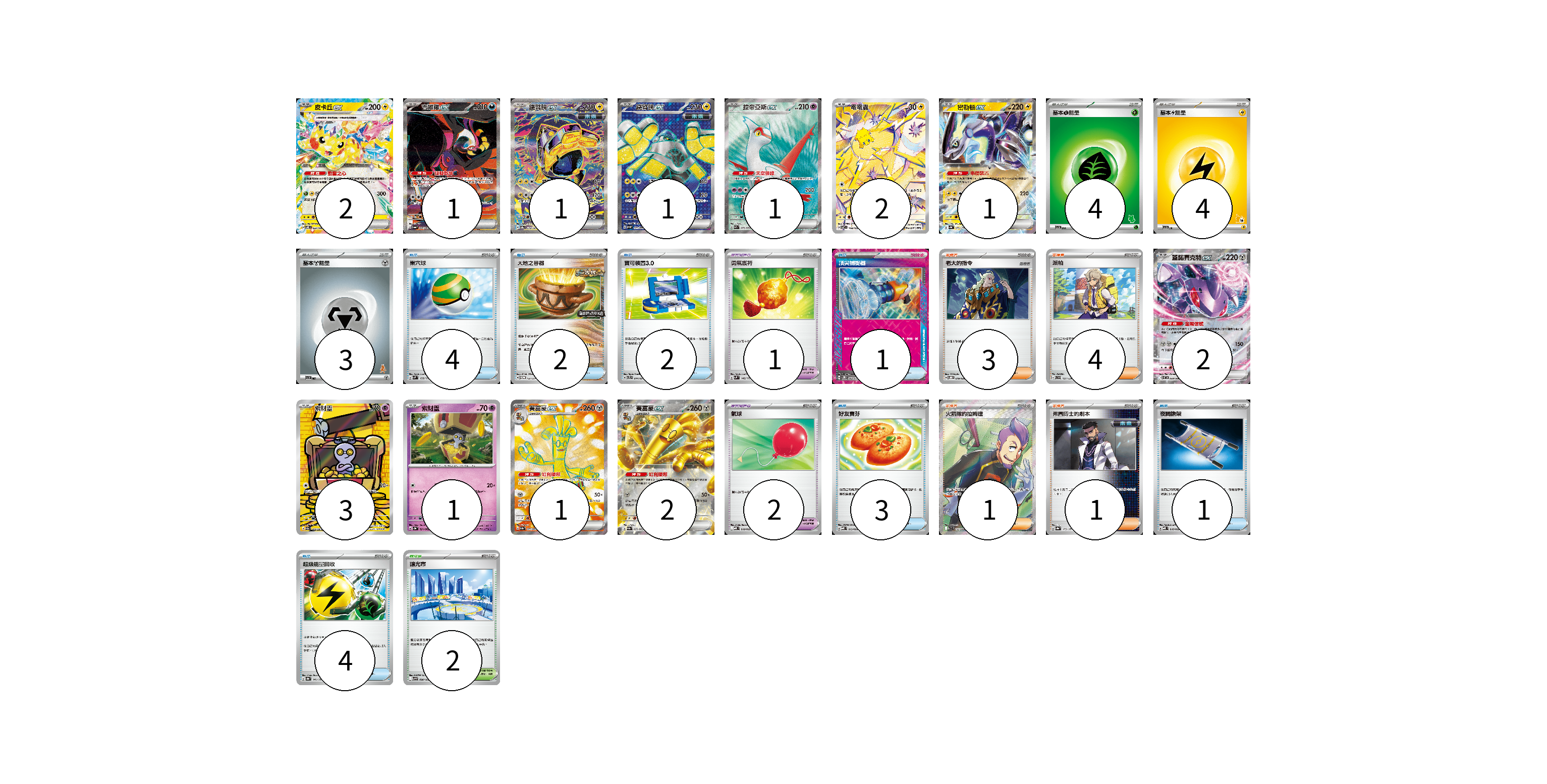 牌組構築方案 以此牌組為基礎新構築牌組 顯示卡面 顯示列表 寶可夢卡(18) 2 1 1 1 1 2 1 2 3 1 1 2 寶可夢道具(3) 1 2 物品卡(17) 4 2 2 1 3 1 4 支援者卡(9) 3 4 1 1 競技場卡(2) 2 能量卡(11) 4 4 3 寶可夢卡(18) 卡牌名稱 張數 卡牌名稱 張數 皮卡丘ex SV8 033/106 02 吉雉雞ex SV6a 089/064 01 鐵臂膀ex SV8a 210/187 01 鐵臂膀ex SV4M 079/066 01 拉帝亞斯ex SV7a 078/064 01 電電蟲 SV7 108/102 02 密勒頓ex SV4a 071/190 01 蓋諾賽克特ex SV11B 069/086 02 索財靈 SV3a 068/062 03 索財靈 SV3a 021/062 01 賽富豪ex SV3a 079/062 01 賽富豪ex SV3a 050/062 02 寶可夢道具(3) 卡牌名稱 張數 卡牌名稱 張數 勇氣護符 SVM 142/175 01 氣球 MBD 018/022 02 物品卡(17) 卡牌名稱 張數 卡牌名稱 張數 巢穴球 SVM 133/175 04 大地之容器 SV-P 137/SV-P 02 寶可裝置3.0 SVTL 014/021 02 頂尖捕捉器 SV5M 062/071 01 好友寶芬 MBD 013/022 03 夜間擔架 MBD 016/022 01 超級能量回收 SV8a 141/187 04 支援者卡(9) 卡牌名稱 張數 卡牌名稱 張數 老大的指令 SVOD 019/020 03 派帕 SVD 137/139 04 火箭隊的拉姆達 SV10 122/098 01 弗圖博士的劇本 SV8a 175/187 01 競技場卡(2) 卡牌名稱 張數 卡牌名稱 張數 釀光市 SV9 098/100 02 能量卡(11) 卡牌名稱 張數 卡牌名稱 張數 基本【草】能量 SVI GRA 04 基本【雷】能量 SVI LIG 04 基本【鋼】能量 SVI MET 03 以此牌組為基礎新構築牌組 牌組編碼 JyJooQ-SABYMd-xzFbul copy 列印牌組單 牌組編碼已複製 分享至SNS
