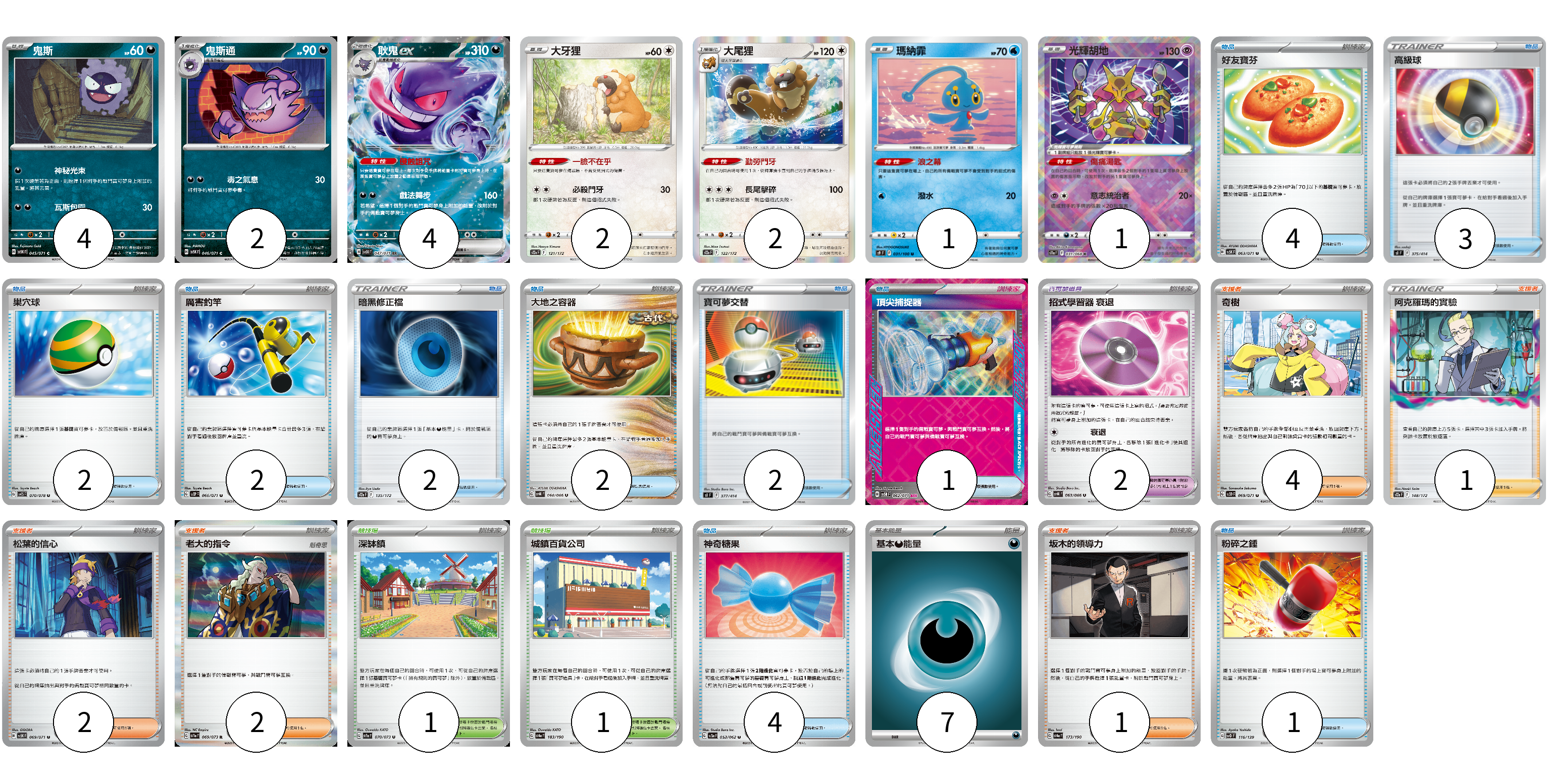 牌組構築方案 以此牌組為基礎新構築牌組 顯示卡面 顯示列表 寶可夢卡(16) 4 2 4 2 2 1 1 寶可夢道具(2) 2 物品卡(23) 4 3 2 2 2 2 2 1 4 1 支援者卡(10) 4 1 2 2 1 競技場卡(2) 1 1 能量卡(7) 7 寶可夢卡(16) 卡牌名稱 張數 卡牌名稱 張數 鬼斯 SV5K 045/071 04 鬼斯通 SV5K 046/071 02 耿鬼ex SV5K 047/071 04 大牙狸 S12a 121/172 02 大尾狸 S12a 122/172 02 瑪納霏 S9 031/100 01 光輝胡地 S11a 031/068 01 寶可夢道具(2) 卡牌名稱 張數 卡牌名稱 張數 招式學習器 衰退 SV4K 063/066 02 物品卡(23) 卡牌名稱 張數 卡牌名稱 張數 好友寶芬 SV5K 063/071 04 高級球 SI 375/414 03 巢穴球 SV1S 070/078 02 厲害釣竿 SV2P 066/071 02 暗黑修正檔 S12a 135/172 02 大地之容器 SV4K 060/066 02 寶可夢交替 SI 377/414 02 頂尖捕捉器 SV5M 062/071 01 神奇糖果 SV3a 053/062 04 粉碎之錘 SVD 116/139 01 支援者卡(10) 卡牌名稱 張數 卡牌名稱 張數 奇樹 SV2D 069/071 04 阿克羅瑪的實驗 S12a 148/172 01 松葉的信心 SV5K 069/071 02 老大的指令 SV1a 069/073 02 坂木的領導力 SV4a 173/190 01 競技場卡(2) 卡牌名稱 張數 卡牌名稱 張數 深缽鎮 SV1a 070/073 01 城鎮百貨公司 SV4a 183/190 01 能量卡(7) 卡牌名稱 張數 卡牌名稱 張數 基本惡能量 sv-p DAR 07 以此牌組為基礎新構築牌組 牌組編碼 JzIkMJ-WcGNGY-ogJLQN copy 列印牌組單 牌組編碼已複製 分享至SNS