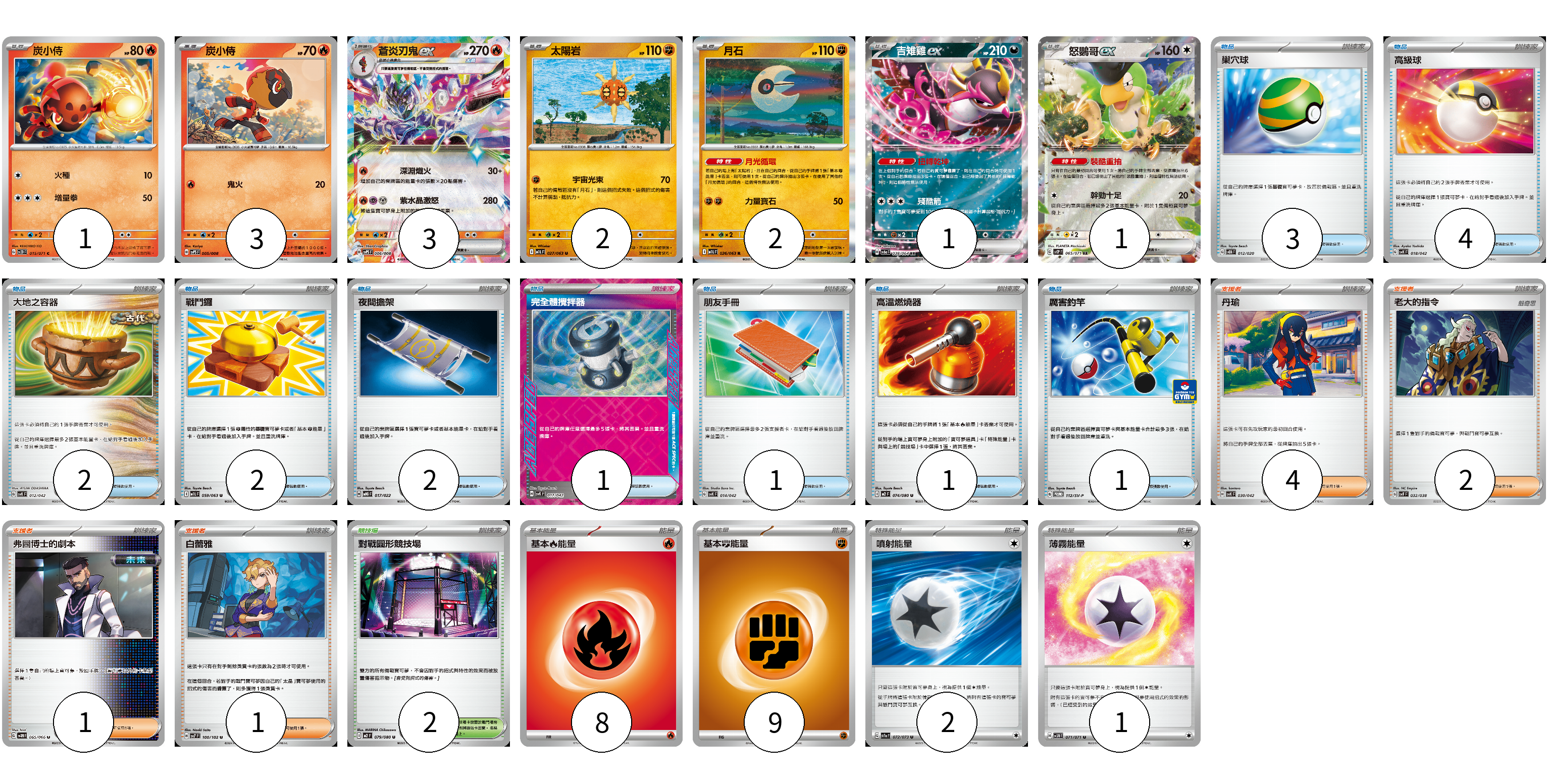 牌組構築方案 以此牌組為基礎新構築牌組 顯示卡面 顯示列表 寶可夢卡(13) 1 3 3 2 2 1 1 物品卡(17) 3 4 2 2 2 1 1 1 1 支援者卡(8) 4 2 1 1 競技場卡(2) 2 能量卡(20) 8 9 2 1 寶可夢卡(13) 卡牌名稱 張數 卡牌名稱 張數 炭小侍 SV2D 015/071 01 炭小侍 SVPS 005/008 03 蒼炎刃鬼ex SVPS 006/008 03 太陽岩 M1L 027/063 02 月石 M1L 026/063 02 吉雉雞ex SV6a 038/064 01 怒鸚哥ex SV2P 065/071 01 物品卡(17) 卡牌名稱 張數 卡牌名稱 張數 巢穴球 SVEM 012/020 03 高級球 SVK 018/042 04 大地之容器 SVK 012/042 02 戰鬥鑼 M1L 059/063 02 夜間擔架 MBG 017/022 02 完全體攪拌器 SVK 017/042 01 朋友手冊 SVK 014/042 01 高溫燃燒器 M2 074/080 01 厲害釣竿 SV-P 112/SV-P 01 支援者卡(8) 卡牌名稱 張數 卡牌名稱 張數 丹瑜 SVK 030/042 04 老大的指令 SVF 032/038 02 弗圖博士的劇本 SV4M 065/066 01 白蕾雅 SV7 100/102 01 競技場卡(2) 卡牌名稱 張數 卡牌名稱 張數 對戰圓形競技場 M2 079/080 02 能量卡(20) 卡牌名稱 張數 卡牌名稱 張數 基本火能量 sv-p FIR 08 基本【鬥】能量 SVAM FIG 09 噴射能量 SV1a 072/073 02 薄霧能量 SV5M 071/071 01 以此牌組為基礎新構築牌組 牌組編碼 KAMdTp-udeHuS-eBsAYL copy 列印牌組單 牌組編碼已複製 分享至SNS