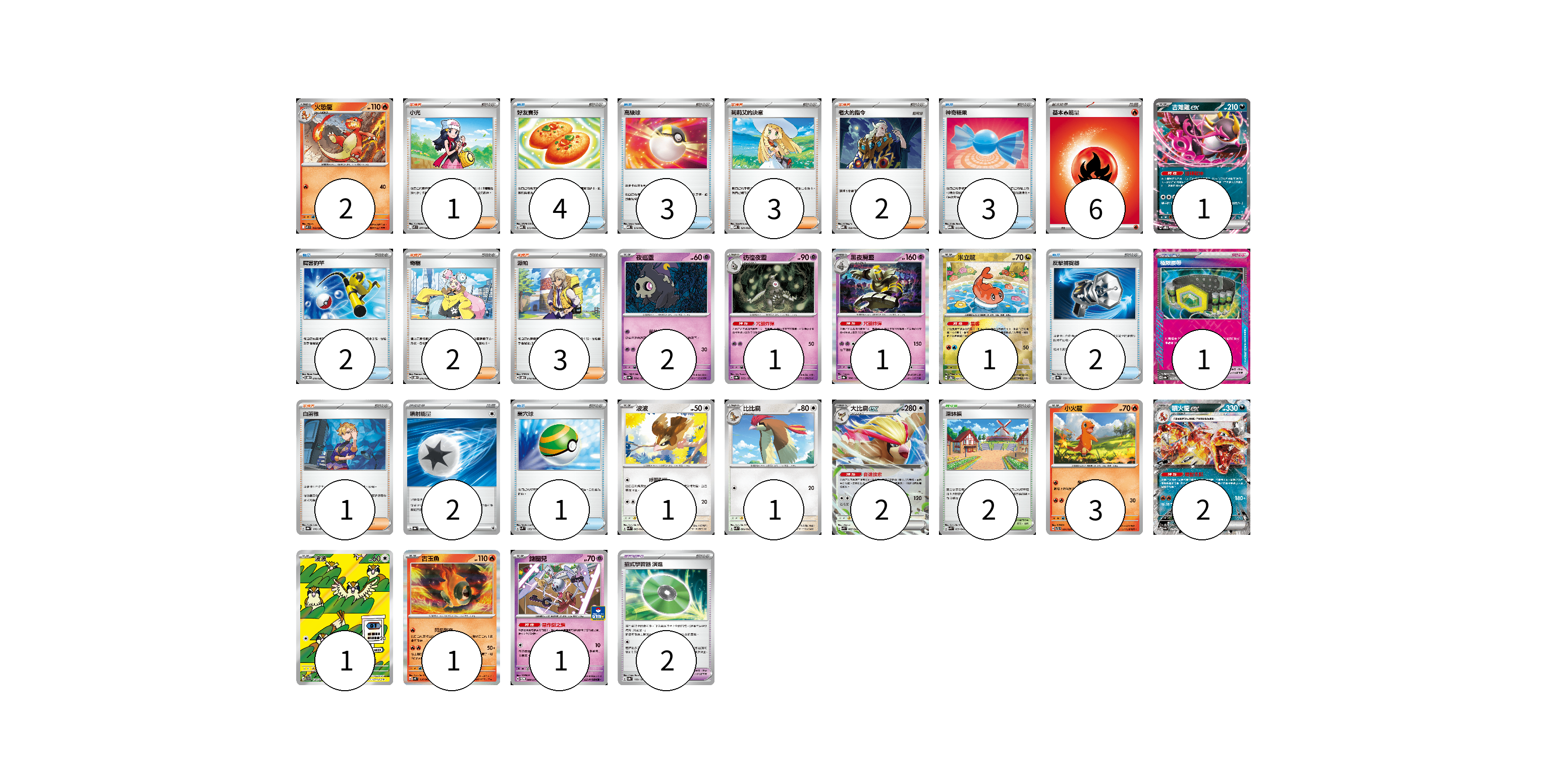 牌組構築方案 以此牌組為基礎新構築牌組 顯示卡面 顯示列表 寶可夢卡(20) 2 1 2 1 1 1 1 1 2 3 2 1 1 1 寶可夢道具(3) 1 2 物品卡(15) 4 3 3 2 2 1 支援者卡(12) 1 3 2 2 3 1 競技場卡(2) 2 能量卡(8) 6 2 寶可夢卡(20) 卡牌名稱 張數 卡牌名稱 張數 火恐龍 M2 012/080 02 吉雉雞ex SVOD 004/020 01 夜巡靈 SV8a 064/187 02 彷徨夜靈 SV8a 065/187 01 黑夜魔靈 SV8a 066/187 01 米立龍 SV8a 121/187 01 波波 SVK 003/042 01 比比鳥 SVK 004/042 01 大比鳥ex SVK 005/042 02 小火龍 SVTL 001/021 03 噴火龍ex SV4a 115/190 02 波波 SV3 118/108 01 古玉魚 SV4K 016/066 01 鑰圈兒 SV-P 089/SV-P 01 寶可夢道具(3) 卡牌名稱 張數 卡牌名稱 張數 極限腰帶 SV8a 159/187 01 招式學習器 演進 SV8a 160/187 02 物品卡(15) 卡牌名稱 張數 卡牌名稱 張數 好友寶芬 MBD 013/022 04 高級球 MBD 014/022 03 神奇糖果 MBG 013/022 03 厲害釣竿 SVOD 010/020 02 反擊捕捉器 SV8a 139/187 02 巢穴球 SVM 133/175 01 支援者卡(12) 卡牌名稱 張數 卡牌名稱 張數 小光 M2 077/080 01 莉莉艾的決意 MBD 021/022 03 老大的指令 MBD 020/022 02 奇樹 SVOD 016/020 02 派帕 SVOD 018/020 03 白蕾雅 SV8a 176/187 01 競技場卡(2) 卡牌名稱 張數 卡牌名稱 張數 深缽鎮 SVK 039/042 02 能量卡(8) 卡牌名稱 張數 卡牌名稱 張數 基本【火】能量 M-P FIR 06 噴射能量 SV8a 185/187 02 以此牌組為基礎新構築牌組 牌組編碼 KBLghs-NOdcYr-ayPloi copy 列印牌組單 牌組編碼已複製 分享至SNS