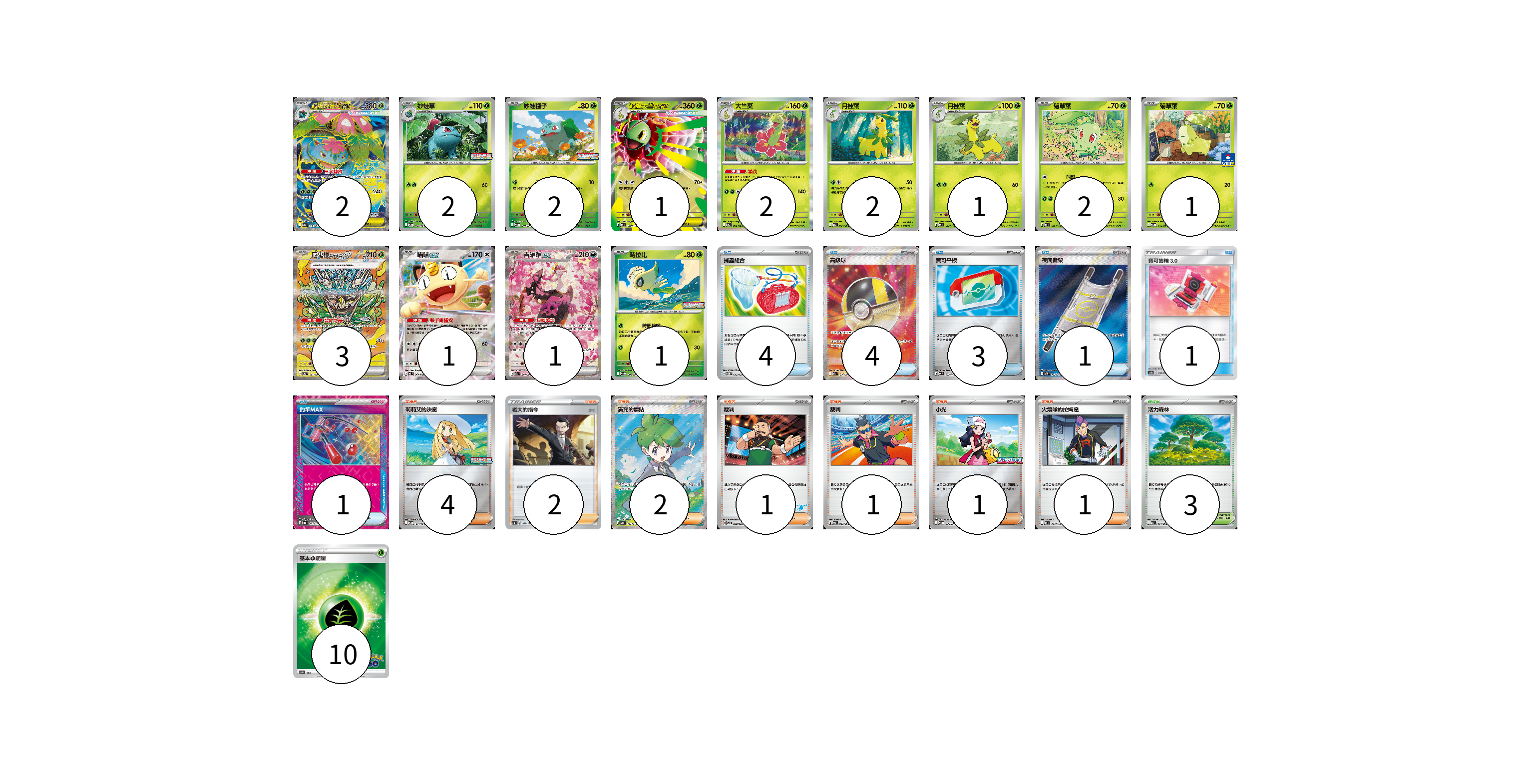 牌組構築方案 以此牌組為基礎新構築牌組 顯示卡面 顯示列表 寶可夢卡(21) 2 2 2 1 2 2 1 2 1 3 1 1 1 物品卡(14) 4 4 3 1 1 1 支援者卡(12) 4 2 2 1 1 1 1 競技場卡(3) 3 能量卡(10) 10 寶可夢卡(21) 卡牌名稱 張數 卡牌名稱 張數 超級妙蛙花ex M1L 076/063 02 妙蛙草 M-P 002/M-P 02 妙蛙種子 M-P 001/M-P 02 超級大竺葵ex MC 018/742 01 大竺葵 M1S 005/063 02 月桂葉 M1S 004/063 02 月桂葉 MC 017/742 01 菊草葉 MC 016/742 02 菊草葉 M-P 012/M-P 01 厄鬼椪 碧草面具ex SV8a 201/187 03 喵喵ex M3 061/080 01 吉雉雞ex M2a 244/193 01 時拉比 M-P 003/M-P 01 物品卡(14) 卡牌名稱 張數 卡牌名稱 張數 捕蟲組合 SVTM 015/022 04 高級球 M2a 216/193 04 寶可平板 MC 662/742 03 夜間擔架 M1L 083/063 01 寶可齒輪3.0 AS6b 190/194 01 釣竿MAX SV8a 142/187 01 支援者卡(12) 卡牌名稱 張數 卡牌名稱 張數 莉莉艾的決意 M-P 011/M-P 04 老大的指令(坂木) SC1D 161/164 02 滿充的體貼 M1S 085/063 02 裁判 SVI 059/066 01 裁判 SV9a 062/063 01 小光 M-P 028/M-P 01 火箭隊的拉姆達 MC 734/742 01 競技場卡(3) 卡牌名稱 張數 卡牌名稱 張數 活力森林 M1S 061/063 03 能量卡(10) 卡牌名稱 張數 卡牌名稱 張數 基本草能量 S10b GRA 10 以此牌組為基礎新構築牌組 牌組編碼 KCDGPd-PxoPtJ-NFCdcd copy 列印牌組單 牌組編碼已複製 分享至SNS