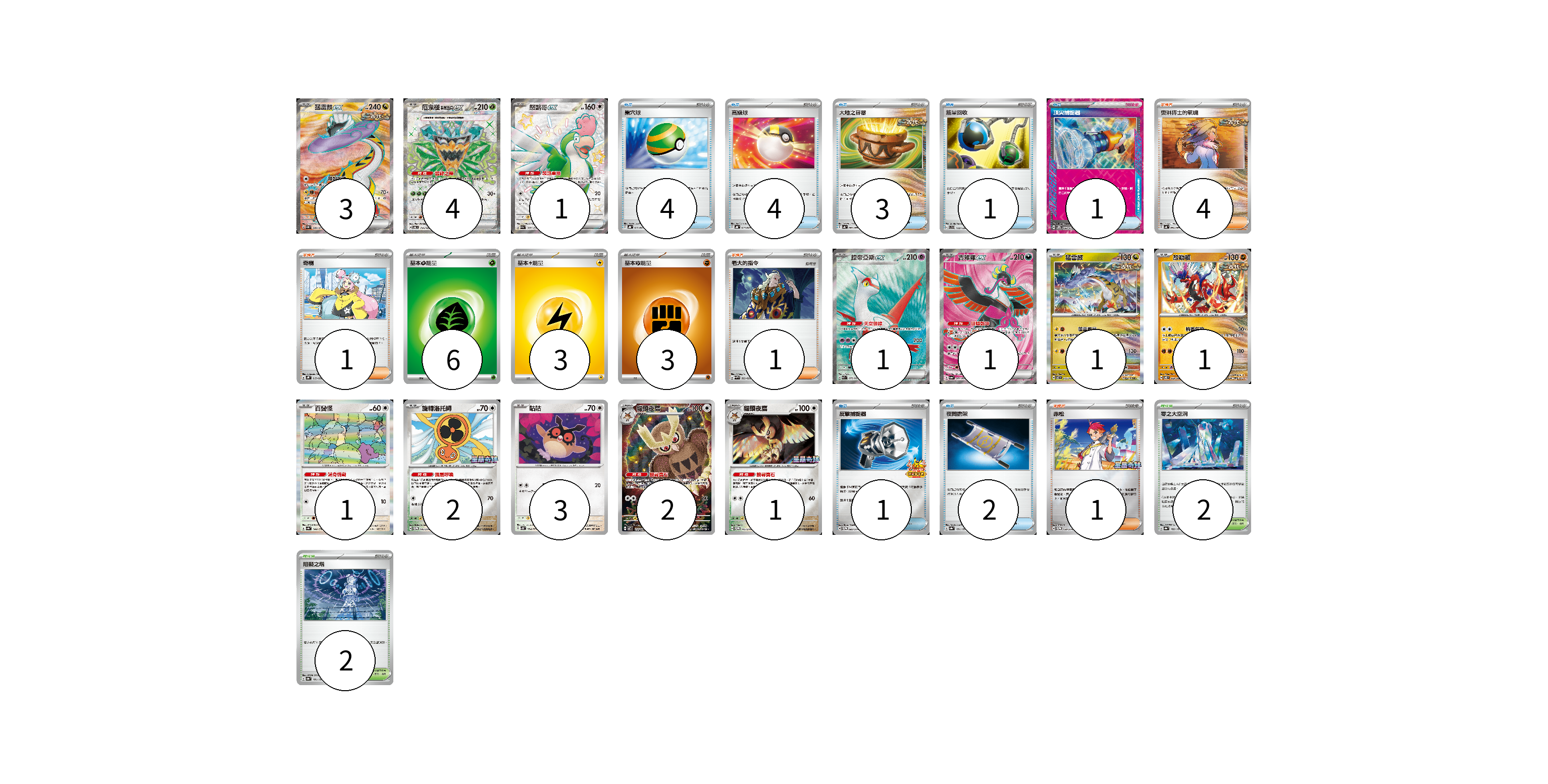 牌組構築方案 以此牌組為基礎新構築牌組 顯示卡面 顯示列表 寶可夢卡(21) 3 4 1 1 1 1 1 1 2 3 2 1 物品卡(16) 4 4 3 1 1 1 2 支援者卡(7) 4 1 1 1 競技場卡(4) 2 2 能量卡(12) 6 3 3 寶可夢卡(21) 卡牌名稱 張數 卡牌名稱 張數 猛雷鼓ex SV5K 089/071 03 厄鬼椪 碧草面具ex SV6 114/101 04 怒鸚哥ex SV4a 337/190 01 拉帝亞斯ex SV7a 078/064 01 吉雉雞ex SV6a 081/064 01 猛雷鼓 SV7 075/102 01 故勒頓 SV8 069/106 01 百變怪 SV4a 144/190 01 旋轉洛托姆 SV-P 146/SV-P 02 咕咕 SV5K 054/071 03 貓頭夜鷹 SV7 114/102 02 貓頭夜鷹 SV-P 145/SV-P 01 物品卡(16) 卡牌名稱 張數 卡牌名稱 張數 巢穴球 SVHK 012/022 04 高級球 SVHK 013/022 04 大地之容器 SV4K 060/066 03 能量回收 SVD 110/139 01 頂尖捕捉器 SV5M 062/071 01 反擊捕捉器 SV-P 083/SV-P 01 夜間擔架 SV8a 151/187 02 支援者卡(7) 卡牌名稱 張數 卡牌名稱 張數 奧琳博士的氣魄 SV4K 064/066 04 奇樹 SVHK 019/022 01 老大的指令 SVHM 022/022 01 赤松 SV-P 150/SV-P 01 競技場卡(4) 卡牌名稱 張數 卡牌名稱 張數 零之大空洞 SV8a 182/187 02 阻礙之塔 SV8a 181/187 02 能量卡(12) 卡牌名稱 張數 卡牌名稱 張數 基本草能量 sv-p GRA 06 基本雷能量 sv-p LIG 03 基本鬥能量 sv-p FIG 03 以此牌組為基礎新構築牌組 牌組編碼 KDttan-MOKEmG-aVsRJI copy 列印牌組單 牌組編碼已複製 分享至SNS