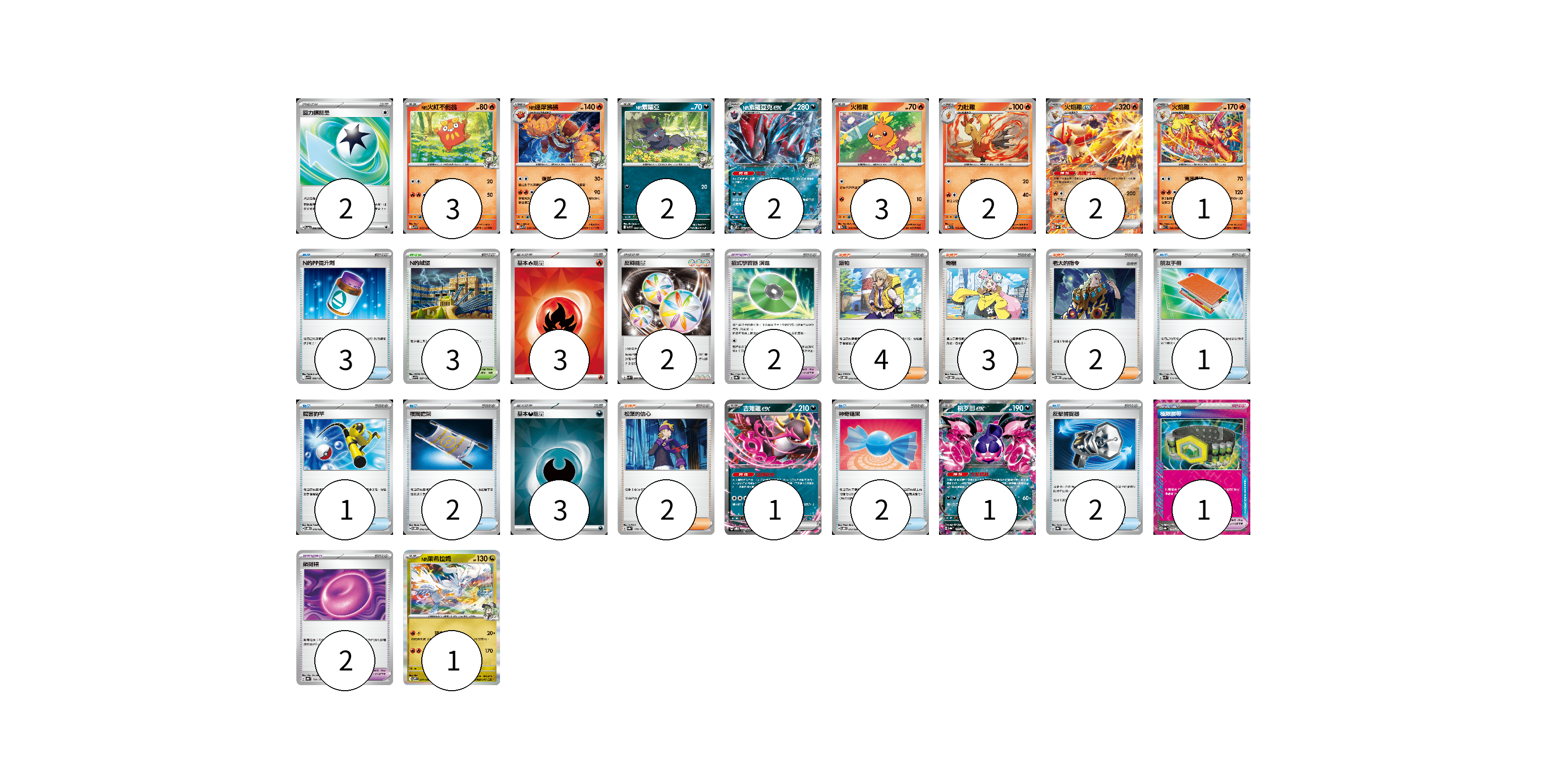 牌組構築方案 以此牌組為基礎新構築牌組 顯示卡面 顯示列表 寶可夢卡(20) 3 2 2 2 3 2 2 1 1 1 1 寶可夢道具(5) 2 1 2 物品卡(11) 3 1 1 2 2 2 支援者卡(11) 4 3 2 2 競技場卡(3) 3 能量卡(10) 2 3 2 3 寶可夢卡(20) 卡牌名稱 張數 卡牌名稱 張數 N的火紅不倒翁 SV9 015/100 03 N的達摩狒狒 SV9 016/100 02 N的索羅亞 SV9 060/100 02 N的索羅亞克ex SV9 061/100 02 火稚雞 SV10 018/098 03 力壯雞 SV10 019/098 02 火焰雞ex SVM 016/175 02 火焰雞 SV10 020/098 01 吉雉雞ex SVOD 004/020 01 桃歹郎ex SV8a 105/187 01 N的萊希拉姆 SV9 074/100 01 寶可夢道具(5) 卡牌名稱 張數 卡牌名稱 張數 招式學習器 演進 SV8a 160/187 02 極限腰帶 SV8a 159/187 01 鎖鏈糬 SV8a 154/187 02 物品卡(11) 卡牌名稱 張數 卡牌名稱 張數 N的PP提升劑 SV9 089/100 03 朋友手冊 SVK 014/042 01 厲害釣竿 SVOD 010/020 01 夜間擔架 SVOM 016/021 02 神奇糖果 SVOD 013/020 02 反擊捕捉器 SV8a 139/187 02 支援者卡(11) 卡牌名稱 張數 卡牌名稱 張數 派帕 SVOD 018/020 04 奇樹 SVOD 016/020 03 老大的指令 SVOD 019/020 02 松葉的信心 SV8a 178/187 02 競技場卡(3) 卡牌名稱 張數 卡牌名稱 張數 N的城堡 SV9 097/100 03 能量卡(10) 卡牌名稱 張數 卡牌名稱 張數 回力鏢能量 SV5a 066/066 02 基本【火】能量 SVK FIR 03 反轉能量 SVK 041/042 02 基本【惡】能量 SVOM DAR 03 以此牌組為基礎新構築牌組 牌組編碼 KFpQOX-qBZDcO-hvuCWk copy 列印牌組單 牌組編碼已複製 分享至SNS