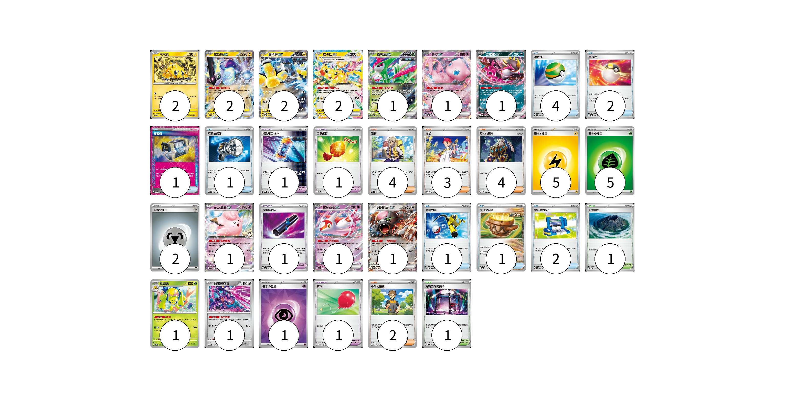 牌組構築方案 以此牌組為基礎新構築牌組 顯示卡面 顯示列表 寶可夢卡(16) 2 2 2 2 1 1 1 1 1 1 1 1 寶可夢道具(4) 1 1 1 1 物品卡(12) 4 2 1 1 1 1 2 支援者卡(13) 4 3 4 2 競技場卡(2) 1 1 能量卡(13) 5 5 2 1 寶可夢卡(16) 卡牌名稱 張數 卡牌名稱 張數 電電蟲 SV7 032/102 02 密勒頓ex SV1V 037/078 02 鐵臂膀ex SV4M 027/066 02 皮卡丘ex SV8 033/106 02 鐵斑葉ex SV5M 016/071 01 夢幻ex SV4a 076/190 01 吉雉雞ex SV6a 038/064 01 莉莉艾的皮皮ex SV9 033/100 01 拉帝亞斯ex SV7a 019/064 01 月月熊 赫月 ex SV5a 052/066 01 電蜘蛛 SV6a 002/064 01 蓋諾賽克特 SV6a 040/064 01 寶可夢道具(4) 卡牌名稱 張數 卡牌名稱 張數 驅勁能量 未來 SV4M 062/066 01 勇氣護符 SV4a 169/190 01 沉重接力棒 SV5M 066/071 01 氣球 MBD 018/022 01 物品卡(12) 卡牌名稱 張數 卡牌名稱 張數 巢穴球 SV1S 070/078 04 高級球 SV4a 161/190 02 秘密箱 SV6 092/101 01 反擊捕捉器 SV4M 059/066 01 厲害釣竿 SVOD 010/020 01 大地之容器 SV8a 143/187 01 寶可裝置3.0 SVK 021/042 02 支援者卡(13) 卡牌名稱 張數 卡牌名稱 張數 派帕 SV1V 076/078 04 赤松 SV7 097/102 03 老大的指令 SVEM 020/020 04 小剛的發掘 SV9 096/100 02 競技場卡(2) 卡牌名稱 張數 卡牌名稱 張數 引力山岳 SV8 106/106 01 對戰圓形競技場 M2 079/080 01 能量卡(13) 卡牌名稱 張數 卡牌名稱 張數 基本雷能量 sv-p LIG 05 基本草能量 sv-p GRA 05 基本鋼能量 sv-p MET 02 基本【超】能量 SVOD PSY 01 以此牌組為基礎新構築牌組 牌組編碼 KJNKwW-NeyxbR-UlTYfP copy 列印牌組單 牌組編碼已複製 分享至SNS