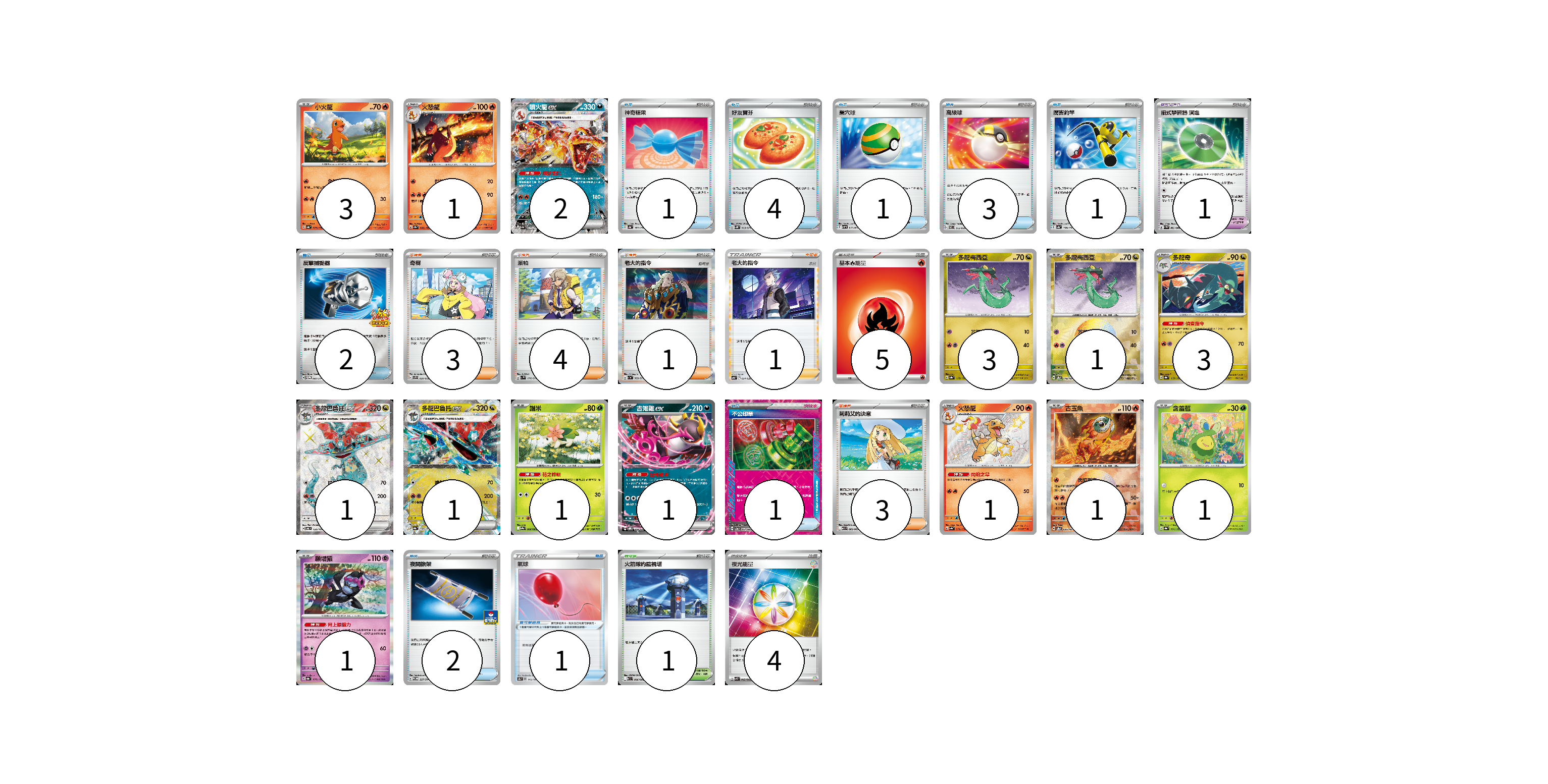 牌組構築方案 以此牌組為基礎新構築牌組 顯示卡面 顯示列表 寶可夢卡(21) 3 1 2 3 1 3 1 1 1 1 1 1 1 1 寶可夢道具(2) 1 1 物品卡(15) 1 4 1 3 1 2 1 2 支援者卡(12) 3 4 1 1 3 競技場卡(1) 1 能量卡(9) 5 4 寶可夢卡(21) 卡牌名稱 張數 卡牌名稱 張數 小火龍 SV4a 025/190 03 火恐龍 SV2a 005/165 01 噴火龍ex SV4a 115/190 02 多龍梅西亞 SV8a 118/187 03 多龍梅西亞 SV8a 118/187 01 多龍奇 SV8a 119/187 03 多龍巴魯托ex SV6 120/101 01 多龍巴魯托ex SV8a 120/187 01 謝米 SV9a 006/063 01 吉雉雞ex SVOM 009/021 01 火恐龍 SV4a 211/190 01 古玉魚 SV8a 025/187 01 含羞苞 SV8a 001/187 01 願增猿 SV8a 075/187 01 寶可夢道具(2) 卡牌名稱 張數 卡牌名稱 張數 招式學習器 演進 SV4M 063/066 01 氣球 S8b 145/184 01 物品卡(15) 卡牌名稱 張數 卡牌名稱 張數 神奇糖果 SV4a 163/190 01 好友寶芬 SV5K 063/071 04 巢穴球 SVHM 012/022 01 高級球 SVEL 012/020 03 厲害釣竿 SV4a 158/190 01 反擊捕捉器 SV-P 083/SV-P 02 不公印章 SV5a 053/066 01 夜間擔架 SV-P 227/SV-P 02 支援者卡(12) 卡牌名稱 張數 卡牌名稱 張數 奇樹 SVF 029/038 03 派帕 SV1V 076/078 04 老大的指令 SV1a 069/073 01 老大的指令(赤日) SVB 024/028 01 莉莉艾的決意 M1L 062/063 03 競技場卡(1) 卡牌名稱 張數 卡牌名稱 張數 火箭隊的監視塔 SV10 096/098 01 能量卡(9) 卡牌名稱 張數 卡牌名稱 張數 基本火能量 sv-p FIR 05 夜光能量 SVK 042/042 04 以此牌組為基礎新構築牌組 牌組編碼 KKDGxI-rucGpm-ChpbWC copy 列印牌組單 牌組編碼已複製 分享至SNS