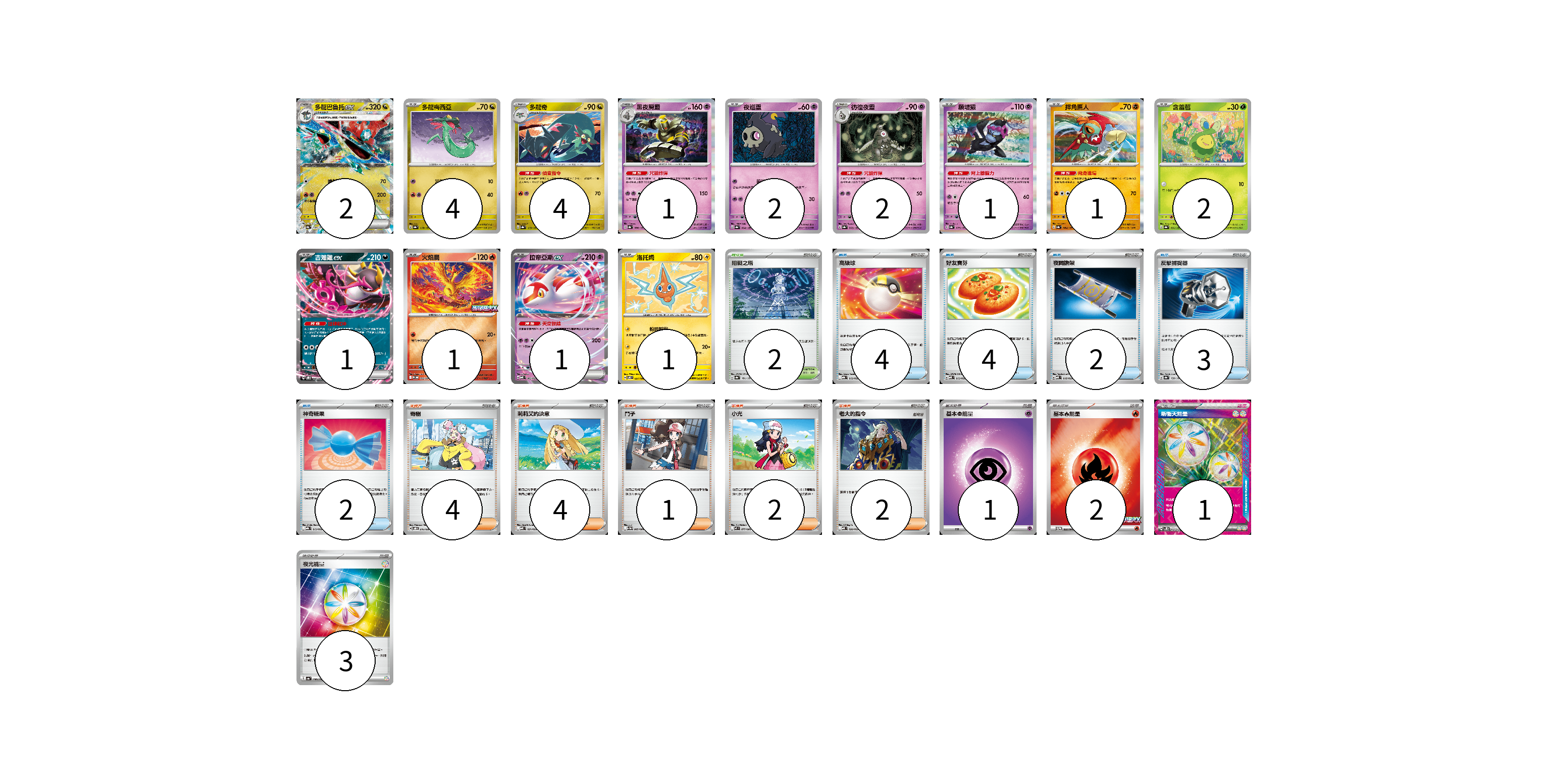 牌組構築方案 以此牌組為基礎新構築牌組 顯示卡面 顯示列表 寶可夢卡(23) 2 4 4 1 2 2 1 1 2 1 1 1 1 物品卡(15) 4 4 2 3 2 支援者卡(13) 4 4 1 2 2 競技場卡(2) 2 能量卡(7) 1 2 1 3 寶可夢卡(23) 卡牌名稱 張數 卡牌名稱 張數 多龍巴魯托ex SV8a 120/187 02 多龍梅西亞 SV8a 118/187 04 多龍奇 SV8a 119/187 04 黑夜魔靈 SV8a 066/187 01 夜巡靈 SV8a 064/187 02 彷徨夜靈 SV8a 065/187 02 願增猿 SV8a 075/187 01 摔角鷹人 SV8a 084/187 01 含羞苞 SV8a 001/187 02 吉雉雞ex SVOD 004/020 01 火焰鳥 M-P 022/M-P 01 拉帝亞斯ex MBD 003/022 01 洛托姆 SV8 037/106 01 物品卡(15) 卡牌名稱 張數 卡牌名稱 張數 高級球 MBG 012/022 04 好友寶芬 MBD 013/022 04 夜間擔架 MBD 016/022 02 反擊捕捉器 SV8a 139/187 03 神奇糖果 MBG 013/022 02 支援者卡(13) 卡牌名稱 張數 卡牌名稱 張數 奇樹 SVOD 016/020 04 莉莉艾的決意 MBD 021/022 04 鬥子 SV11W 085/086 01 小光 M2 077/080 02 老大的指令 MBD 020/022 02 競技場卡(2) 卡牌名稱 張數 卡牌名稱 張數 阻礙之塔 SV8a 181/187 02 能量卡(7) 卡牌名稱 張數 卡牌名稱 張數 基本【超】能量 MBD PSY 01 基本【火】能量 M-P 032/M-P 02 新衝天能量 SV5K 071/071 01 夜光能量 SV4a 190/190 03 以此牌組為基礎新構築牌組 牌組編碼 KKiumY-dseCLx-HsWFmP copy 列印牌組單 牌組編碼已複製 分享至SNS