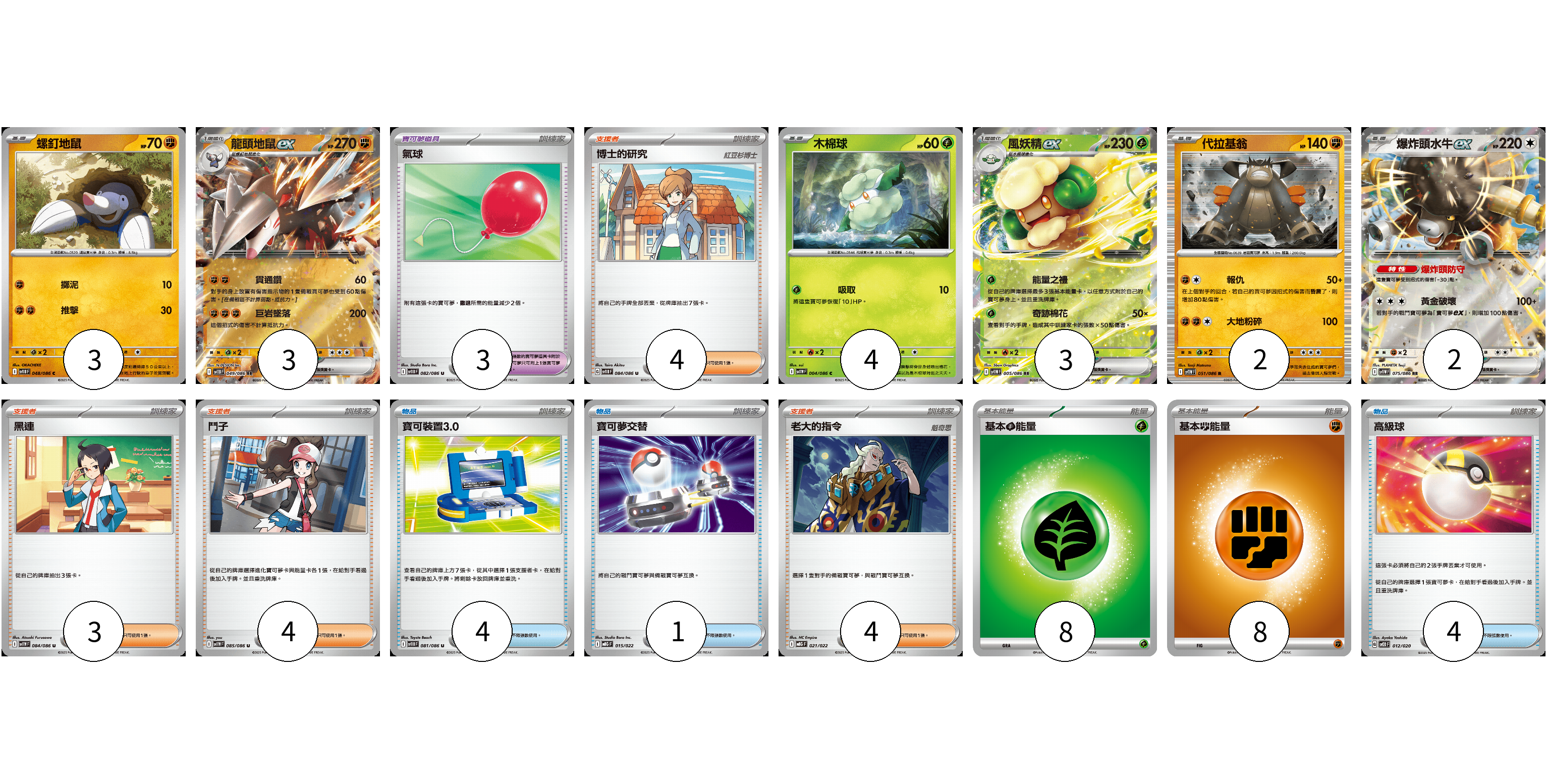 牌組構築方案 以此牌組為基礎新構築牌組 顯示卡面 顯示列表 寶可夢卡(17) 3 3 4 3 2 2 寶可夢道具(3) 3 物品卡(9) 4 1 4 支援者卡(15) 4 3 4 4 能量卡(16) 8 8 寶可夢卡(17) 卡牌名稱 張數 卡牌名稱 張數 螺釘地鼠 SV11B 048/086 03 龍頭地鼠ex SV11B 049/086 03 木棉球 SV11W 004/086 04 風妖精ex SV11W 005/086 03 代拉基翁 SV11W 051/086 02 爆炸頭水牛ex SV11W 075/086 02 寶可夢道具(3) 卡牌名稱 張數 卡牌名稱 張數 氣球 SV11B 082/086 03 物品卡(9) 卡牌名稱 張數 卡牌名稱 張數 寶可裝置3.0 SV11B 081/086 04 寶可夢交替 MBG 015/022 01 高級球 SVOD 012/020 04 支援者卡(15) 卡牌名稱 張數 卡牌名稱 張數 博士的研究 SV11B 084/086 04 黑連 SV11W 084/086 03 鬥子 SV11W 085/086 04 老大的指令 MBG 021/022 04 能量卡(16) 卡牌名稱 張數 卡牌名稱 張數 基本【草】能量 M-P GRA 08 基本【鬥】能量 M-P FIG 08 以此牌組為基礎新構築牌組 牌組編碼 KNkQqd-grJeBQ-ijNDJN copy 列印牌組單 牌組編碼已複製 分享至SNS