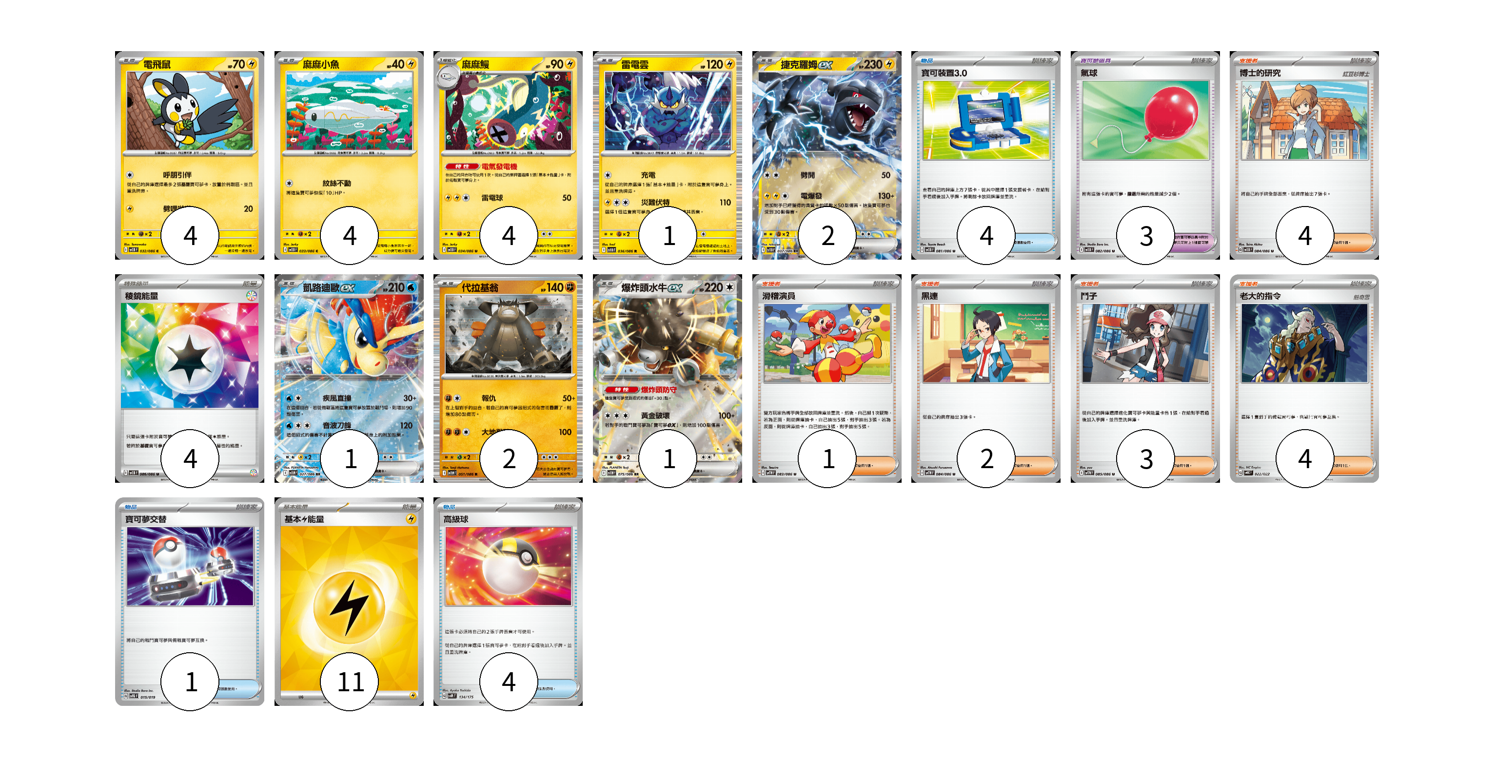 牌組構築方案 以此牌組為基礎新構築牌組 顯示卡面 顯示列表 寶可夢卡(19) 4 4 4 1 2 1 2 1 寶可夢道具(3) 3 物品卡(9) 4 1 4 支援者卡(14) 4 1 2 3 4 能量卡(15) 4 11 寶可夢卡(19) 卡牌名稱 張數 卡牌名稱 張數 電飛鼠 SV11B 032/086 04 麻麻小魚 SV11B 033/086 04 麻麻鰻 SV11B 034/086 04 雷電雲 SV11B 036/086 01 捷克羅姆ex SV11B 037/086 02 凱路迪歐ex SV11W 027/086 01 代拉基翁 SV11W 051/086 02 爆炸頭水牛ex SV11W 075/086 01 寶可夢道具(3) 卡牌名稱 張數 卡牌名稱 張數 氣球 SV11B 082/086 03 物品卡(9) 卡牌名稱 張數 卡牌名稱 張數 寶可裝置3.0 SV11B 081/086 04 寶可夢交替 SVTG 015/019 01 高級球 SVM 134/175 04 支援者卡(14) 卡牌名稱 張數 卡牌名稱 張數 博士的研究 SV11B 084/086 04 滑稽演員 SV11W 083/086 01 黑連 SV11W 084/086 02 鬥子 SV11W 085/086 03 老大的指令 SVHK 022/022 04 能量卡(15) 卡牌名稱 張數 卡牌名稱 張數 稜鏡能量 SV11B 086/086 04 基本【雷】能量 SVK LIG 11 以此牌組為基礎新構築牌組 牌組編碼 KNlNga-jnePcP-EkzEut copy 列印牌組單 牌組編碼已複製 分享至SNS