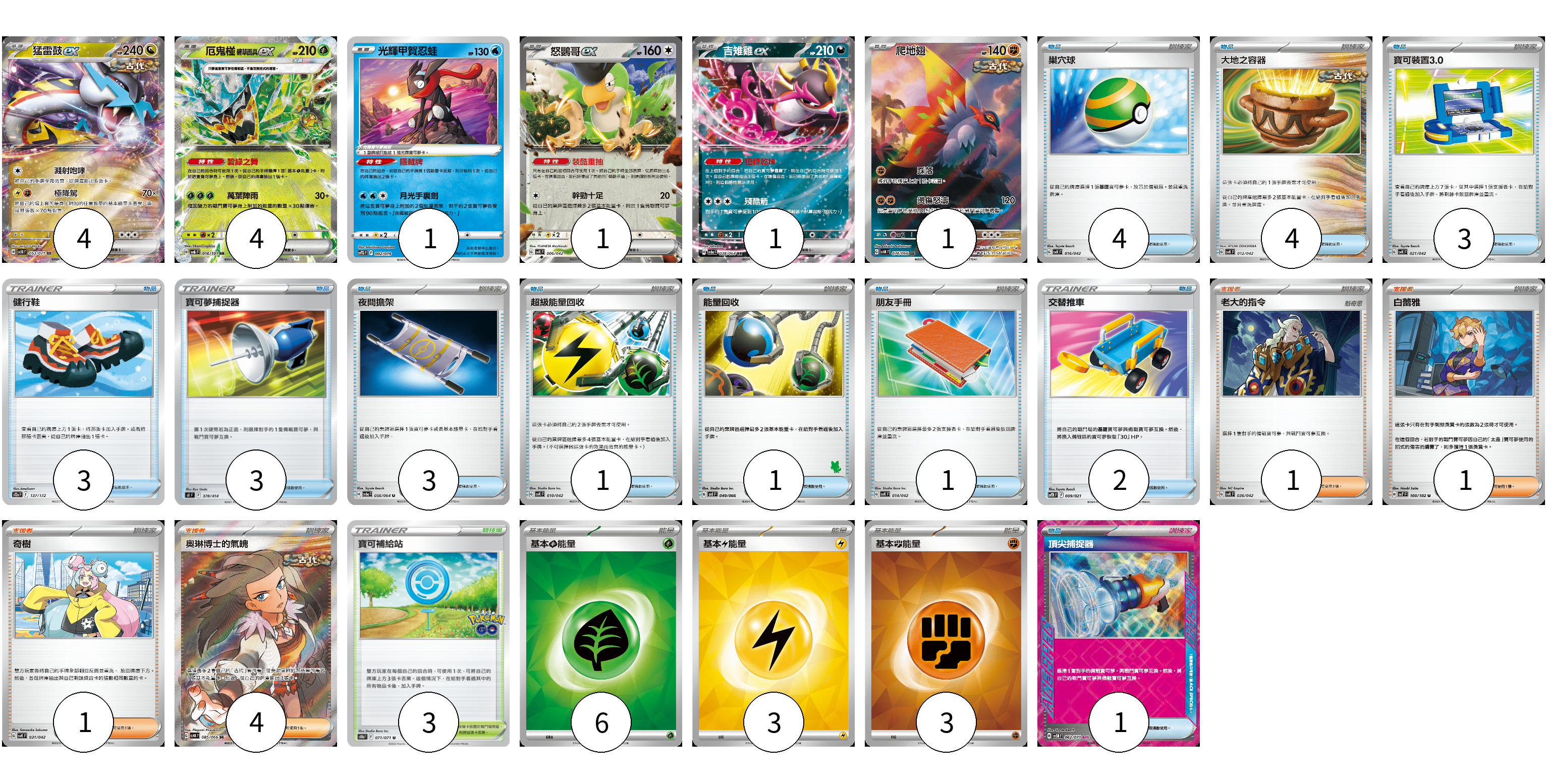 牌組構築方案 以此牌組為基礎新構築牌組 顯示卡面 顯示列表 寶可夢卡(12) 4 4 1 1 1 1 物品卡(26) 4 4 3 3 3 3 1 1 1 2 1 支援者卡(7) 1 1 1 4 競技場卡(3) 3 能量卡(12) 6 3 3 寶可夢卡(12) 卡牌名稱 張數 卡牌名稱 張數 猛雷鼓ex SV5K 053/071 04 厄鬼椪 碧草面具ex SV6 016/101 04 光輝甲賀忍蛙 SVTG 002/019 01 怒鸚哥ex SVK 006/042 01 吉雉雞ex SV6a 038/064 01 爬地翅 SV4K 074/066 01 物品卡(26) 卡牌名稱 張數 卡牌名稱 張數 巢穴球 SVK 016/042 04 大地之容器 SVK 012/042 04 寶可裝置3.0 SVK 021/042 03 健行鞋 S12a 137/172 03 寶可夢捕捉器 SI 378/414 03 夜間擔架 SV6a 056/064 03 超級能量回收 SVK 010/042 01 能量回收 SVI 049/066 01 朋友手冊 SVK 014/042 01 交替推車 SVTR 009/021 02 頂尖捕捉器 SV5M 062/071 01 支援者卡(7) 卡牌名稱 張數 卡牌名稱 張數 老大的指令 SVK 036/042 01 白蕾雅 SV7 100/102 01 奇樹 SVK 031/042 01 奧琳博士的氣魄 SV4K 085/066 04 競技場卡(3) 卡牌名稱 張數 卡牌名稱 張數 寶可補給站 S10b 071/071 03 能量卡(12) 卡牌名稱 張數 卡牌名稱 張數 基本【草】能量 SVK GRA 06 基本【雷】能量 SVK LIG 03 基本【鬥】能量 SVK FIG 03 以此牌組為基礎新構築牌組 牌組編碼 KPcOqY-lzBObP-YVdNxG copy 列印牌組單 牌組編碼已複製 分享至SNS