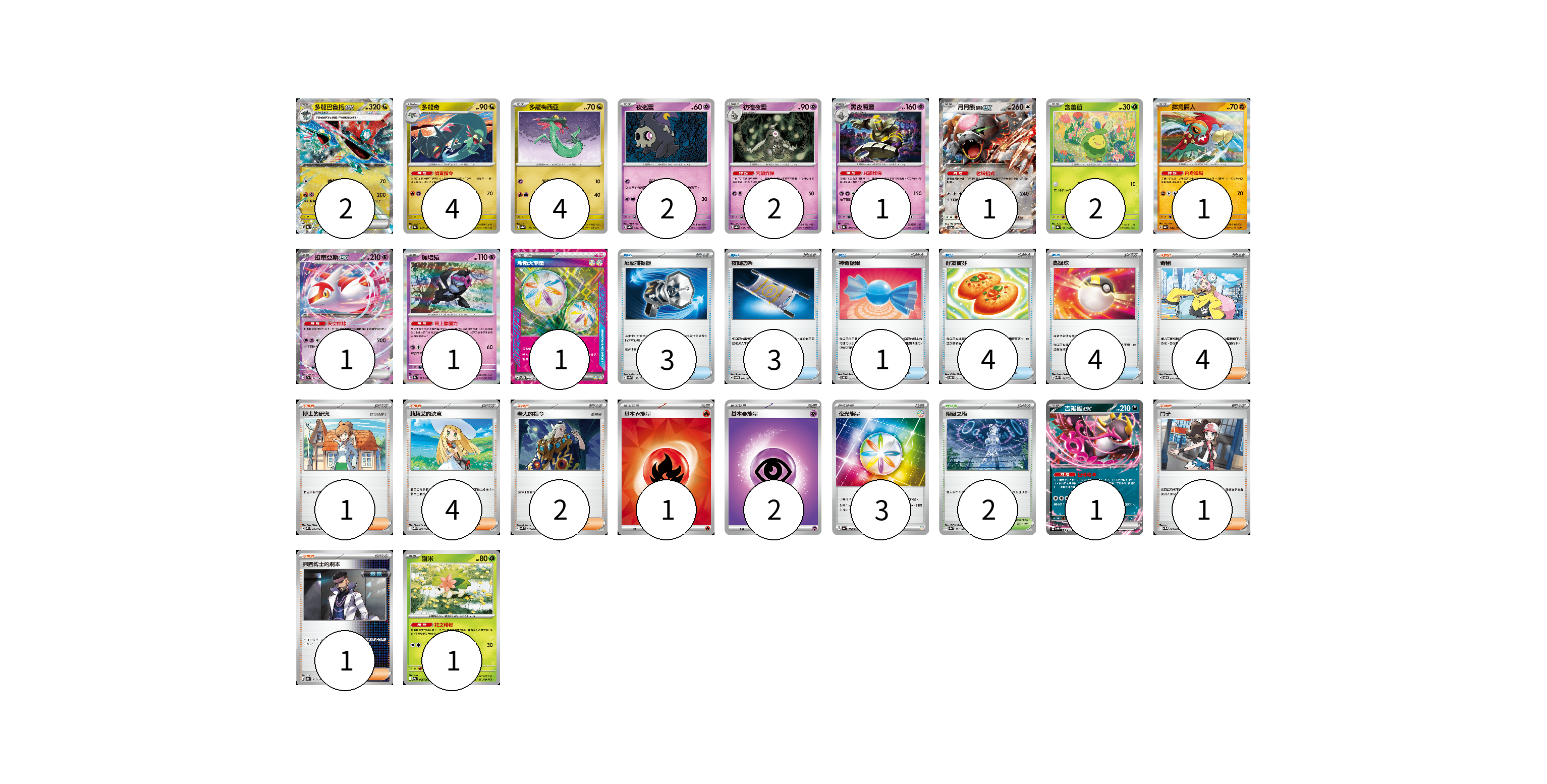 牌組構築方案 以此牌組為基礎新構築牌組 顯示卡面 顯示列表 寶可夢卡(23) 2 4 4 2 2 1 1 2 1 1 1 1 1 物品卡(15) 3 3 1 4 4 支援者卡(13) 4 1 4 2 1 1 競技場卡(2) 2 能量卡(7) 1 1 2 3 寶可夢卡(23) 卡牌名稱 張數 卡牌名稱 張數 多龍巴魯托ex SV8a 120/187 02 多龍奇 SV8a 119/187 04 多龍梅西亞 SV8a 118/187 04 夜巡靈 SV8a 064/187 02 彷徨夜靈 SV8a 065/187 02 黑夜魔靈 SV8a 066/187 01 月月熊 赫月 ex SV5a 052/066 01 含羞苞 SV8a 001/187 02 摔角鷹人 SV8a 084/187 01 拉帝亞斯ex SV7a 019/064 01 願增猿 SV8a 075/187 01 吉雉雞ex SVOD 004/020 01 謝米 SV9a 006/063 01 物品卡(15) 卡牌名稱 張數 卡牌名稱 張數 反擊捕捉器 SV8a 139/187 03 夜間擔架 SVOM 016/021 03 神奇糖果 SVOD 013/020 01 好友寶芬 SVOD 011/020 04 高級球 SVQL 015/022 04 支援者卡(13) 卡牌名稱 張數 卡牌名稱 張數 奇樹 SVOD 016/020 04 博士的研究 SV11B 084/086 01 莉莉艾的決意 M1L 062/063 04 老大的指令 SVK 036/042 02 鬥子 SV11W 085/086 01 弗圖博士的劇本 SV8a 175/187 01 競技場卡(2) 卡牌名稱 張數 卡牌名稱 張數 阻礙之塔 SV8a 181/187 02 能量卡(7) 卡牌名稱 張數 卡牌名稱 張數 新衝天能量 SV5K 071/071 01 基本【火】能量 SVQL FIR 01 基本【超】能量 M-P PSY 02 夜光能量 SV4a 190/190 03 以此牌組為基礎新構築牌組 牌組編碼 KRQpnu-QmxYtS-dVmbQv copy 列印牌組單 牌組編碼已複製 分享至SNS