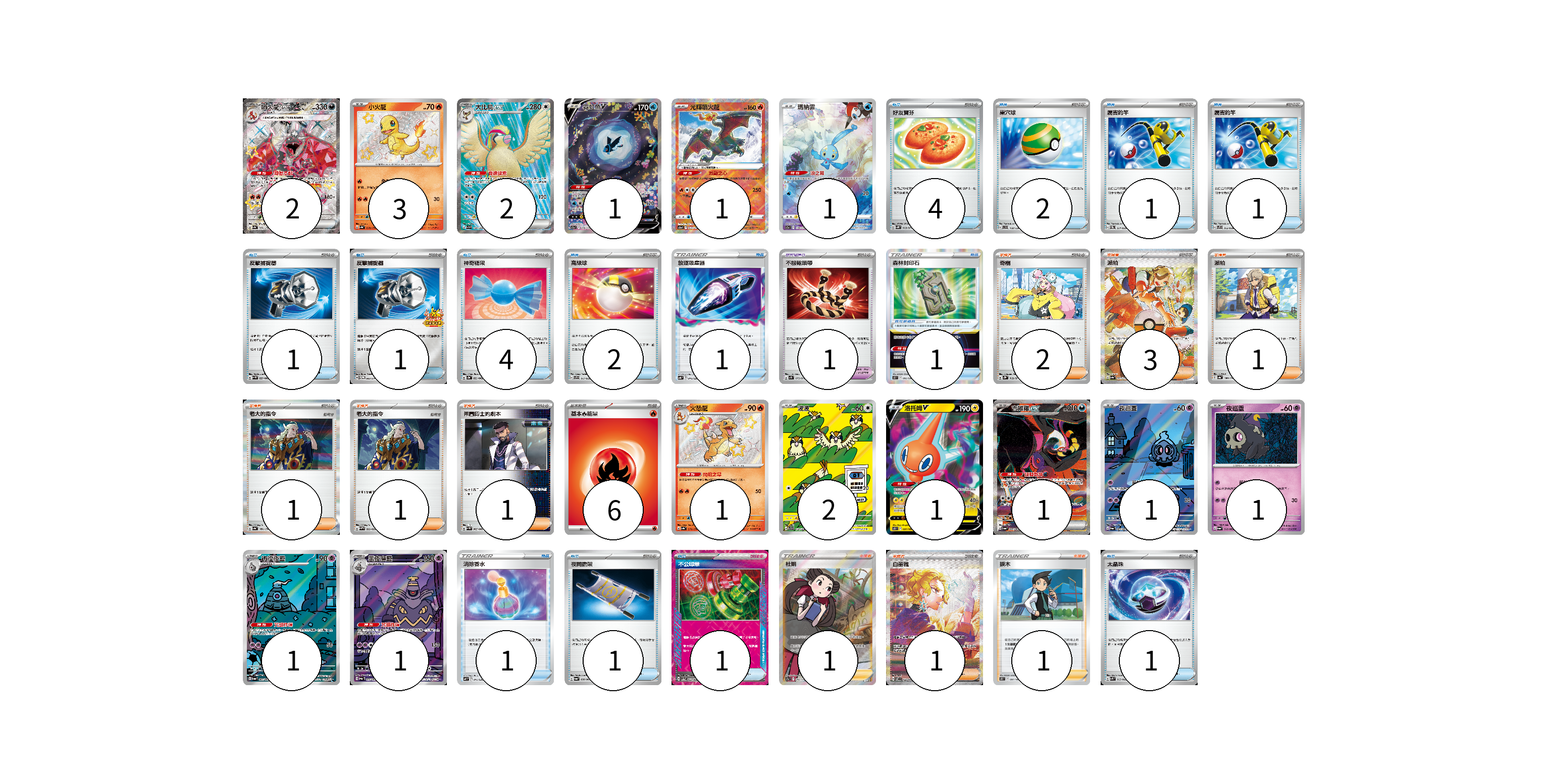 牌組構築方案 以此牌組為基礎新構築牌組 顯示卡面 顯示列表 寶可夢卡(19) 2 3 2 1 1 1 1 2 1 1 1 1 1 1 寶可夢道具(2) 1 1 物品卡(21) 4 2 1 1 1 1 4 2 1 1 1 1 1 支援者卡(12) 2 3 1 1 1 1 1 1 1 能量卡(6) 6 寶可夢卡(19) 卡牌名稱 張數 卡牌名稱 張數 噴火龍ex SV4a 331/190 02 小火龍 SV4a 210/190 03 大比鳥ex SV3 128/108 02 霓虹魚V S12a 216/172 01 光輝噴火龍 S12a 015/172 01 瑪納霏 S12a 178/172 01 火恐龍 SV4a 211/190 01 波波 SV3 118/108 02 洛托姆V S11 037/100 01 吉雉雞ex SV6a 089/064 01 夜巡靈 SV6a 068/064 01 夜巡靈 SV6a 018/064 01 彷徨夜靈 SV6a 069/064 01 黑夜魔靈 SV6a 070/064 01 寶可夢道具(2) 卡牌名稱 張數 卡牌名稱 張數 不服輸頭帶 SV1S 073/078 01 森林封印石 S12 092/098 01 物品卡(21) 卡牌名稱 張數 卡牌名稱 張數 好友寶芬 SV5K 063/071 04 巢穴球 SVD 118/139 02 厲害釣竿 SVEM 011/020 01 厲害釣竿 SVF 013/038 01 反擊捕捉器 SV4M 059/066 01 反擊捕捉器 SV-P 083/SV-P 01 神奇糖果 SV3a 053/062 04 高級球 SVF 017/038 02 放逐吸塵器 SVB 016/028 01 消除香水 SVF 011/038 01 夜間擔架 SV6a 056/064 01 不公印章 SV5a 053/066 01 太晶珠 SVK 013/042 01 支援者卡(12) 卡牌名稱 張數 卡牌名稱 張數 奇樹 SV2D 069/071 02 派帕 SV4a 353/190 03 派帕 SV4a 180/190 01 老大的指令 SV4a 181/190 01 老大的指令 SVHM 022/022 01 弗圖博士的劇本 SV4M 065/066 01 杜娟 S12a 242/172 01 白蕾雅 SV7 132/102 01 捩木 S11 097/100 01 能量卡(6) 卡牌名稱 張數 卡牌名稱 張數 基本【火】能量 SVF FIR 06 以此牌組為基礎新構築牌組 牌組編碼 KRmEvJ-HmqUOw-ExIQVp copy 列印牌組單 牌組編碼已複製 分享至SNS