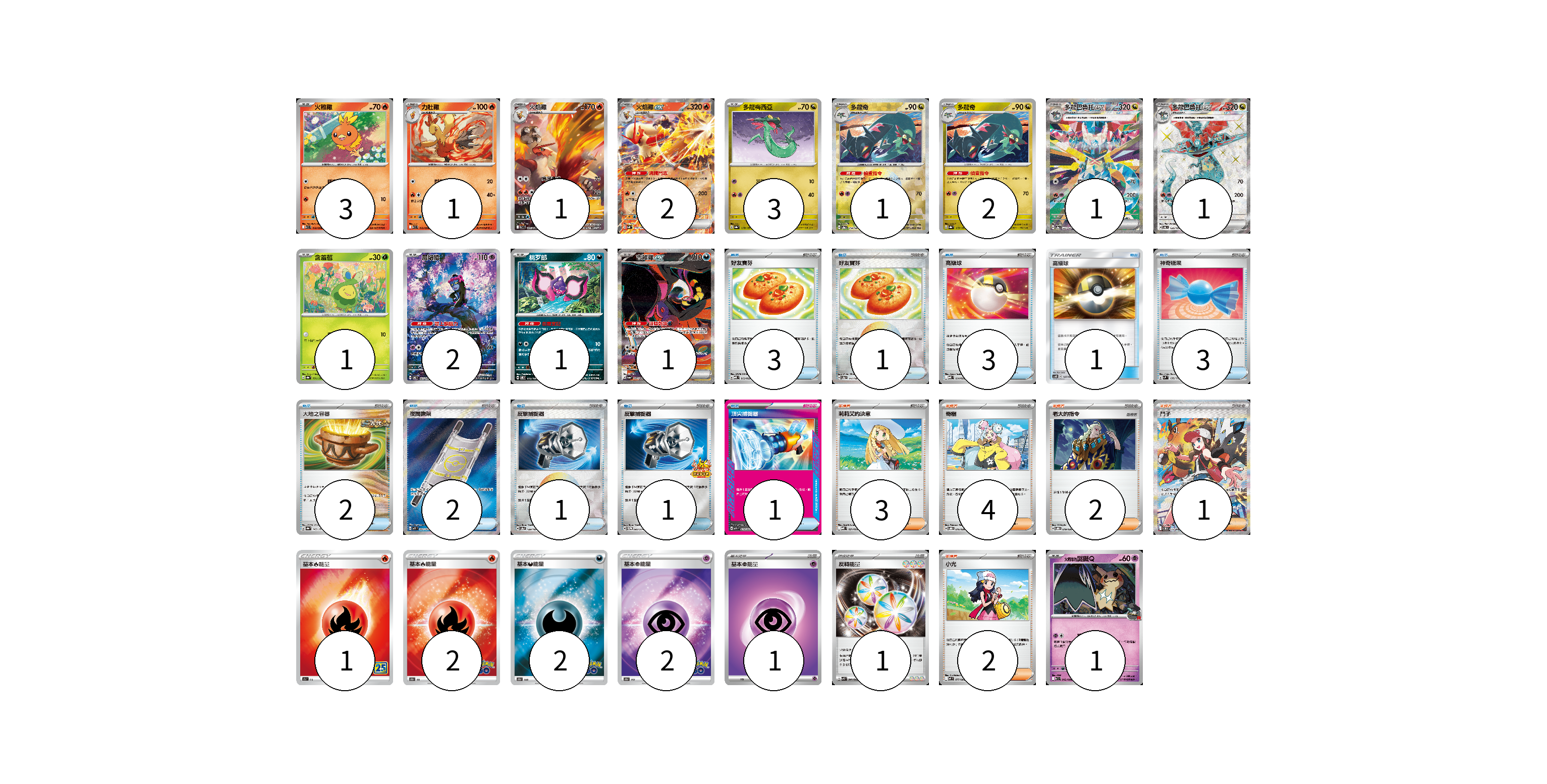牌組構築方案 以此牌組為基礎新構築牌組 顯示卡面 顯示列表 寶可夢卡(21) 3 1 1 2 3 1 2 1 1 1 2 1 1 1 物品卡(18) 3 1 3 1 3 2 2 1 1 1 支援者卡(12) 3 4 2 1 2 能量卡(9) 1 2 2 2 1 1 寶可夢卡(21) 卡牌名稱 張數 卡牌名稱 張數 火稚雞 SV10 018/098 03 力壯雞 SV10 019/098 01 火焰雞 SV10 101/098 01 火焰雞ex SVM 016/175 02 多龍梅西亞 SV8a 118/187 03 多龍奇 SV8a 119/187 01 多龍奇 SV8a 119/187 02 多龍巴魯托ex SV8a 221/187 01 多龍巴魯托ex SV6 120/101 01 含羞苞 SV8a 001/187 01 願增猿 SV6 107/101 02 桃歹郎 SV8 075/106 01 吉雉雞ex SV6a 089/064 01 <火箭隊的>謎擬Q SV10 042/098 01 物品卡(18) 卡牌名稱 張數 卡牌名稱 張數 好友寶芬 MBD 013/022 03 好友寶芬 SV8a 147/187 01 高級球 MBD 014/022 03 高級球 AS6D 147/168 01 神奇糖果 SVM 135/175 03 大地之容器 SV8a 143/187 02 夜間擔架 M1L 083/063 02 反擊捕捉器 SV8a 139/187 01 反擊捕捉器 SV-P 083/SV-P 01 頂尖捕捉器 MBG 014/022 01 支援者卡(12) 卡牌名稱 張數 卡牌名稱 張數 莉莉艾的決意 MBD 021/022 03 奇樹 SVOD 016/020 04 老大的指令 SVOD 019/020 02 鬥子 SV11W 173/086 01 小光 M2 077/080 02 能量卡(9) 卡牌名稱 張數 卡牌名稱 張數 基本火能量 S8a FIR 01 基本火能量 S10b FIR 02 基本惡能量 S10b DAR 02 基本超能量 S10b PSY 02 基本超能量 sv-p PSY 01 反轉能量 SVK 041/042 01 以此牌組為基礎新構築牌組 牌組編碼 KUkyWF-LuTjCU-pBkoIw copy 列印牌組單 牌組編碼已複製 分享至SNS