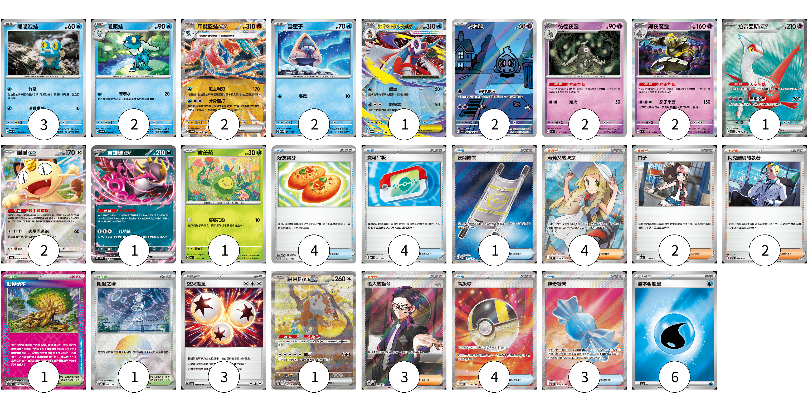 牌組構築方案 以此牌組為基礎新構築牌組 顯示卡面 顯示列表 寶可夢卡(22) 3 2 2 2 1 2 2 2 1 2 1 1 1 物品卡(16) 4 4 1 4 3 支援者卡(11) 4 2 2 3 競技場卡(2) 1 1 能量卡(9) 3 6 寶可夢卡(22) 卡牌名稱 張數 卡牌名稱 張數 呱呱泡蛙 SV5a 023/066 03 呱頭蛙 SV5a 024/066 02 甲賀忍蛙ex SV5a 045/066 02 雪童子 M2a 035/193 02 超級雪妖女ex M2a 036/193 01 夜巡靈 SV6a 068/064 02 彷徨夜靈 SV6a 019/064 02 黑夜魔靈 SV6a 020/064 02 拉帝亞斯ex SV7a 078/064 01 喵喵ex M3 061/080 02 吉雉雞ex SVOM 009/021 01 含羞苞 M2a 011/193 01 月月熊 赫月 ex SV5a 091/066 01 物品卡(16) 卡牌名稱 張數 卡牌名稱 張數 好友寶芬 SVTG 011/019 04 寶可平板 MC 662/742 04 夜間擔架 M1L 083/063 01 高級球 M2a 216/193 04 神奇糖果 M1S 082/063 03 支援者卡(11) 卡牌名稱 張數 卡牌名稱 張數 莉莉艾的決意 M1L 086/063 04 鬥子 M2a 172/193 02 阿克羅瑪的執著 SVOM 017/021 02 老大的指令(烏羽) MC 760/742 03 競技場卡(2) 卡牌名稱 張數 卡牌名稱 張數 壯偉碩木 SV7 101/102 01 阻礙之塔 SV8a 181/187 01 能量卡(9) 卡牌名稱 張數 卡牌名稱 張數 燃火能量 SV11W 086/086 03 基本【水】能量 MC WAT 06 以此牌組為基礎新構築牌組 牌組編碼 KVrpHC-TgaPQX-SJQWyi copy 列印牌組單 牌組編碼已複製 分享至SNS