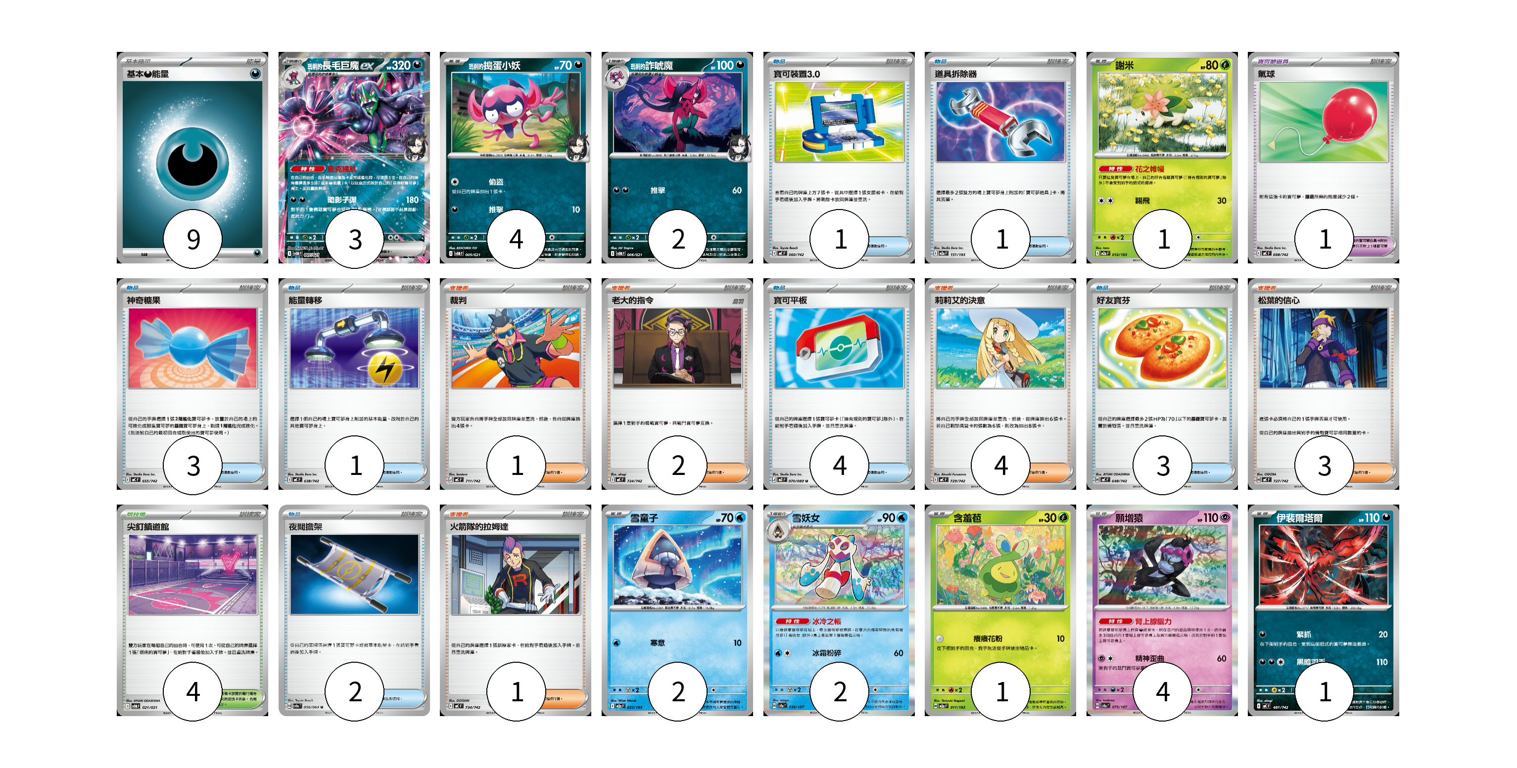 牌組構築方案 以此牌組為基礎新構築牌組 顯示卡面 顯示列表 寶可夢卡(20) 3 4 2 1 2 2 1 4 1 寶可夢道具(1) 1 物品卡(15) 1 1 3 1 4 3 2 支援者卡(11) 1 2 4 3 1 競技場卡(4) 4 能量卡(9) 9 寶可夢卡(20) 卡牌名稱 張數 卡牌名稱 張數 <瑪俐的>長毛巨魔ex SVOM 007/021 03 <瑪俐的>搗蛋小妖 SVOM 005/021 04 <瑪俐的>詐唬魔 SVOM 006/021 02 謝米 M2a 012/193 01 雪童子 M2a 035/193 02 雪妖女 SV8a 038/187 02 含羞苞 M2a 011/193 01 願增猿 SV8a 075/187 04 伊裴爾塔爾 MC 481/742 01 寶可夢道具(1) 卡牌名稱 張數 卡牌名稱 張數 氣球 MC 688/742 01 物品卡(15) 卡牌名稱 張數 卡牌名稱 張數 寶可裝置3.0 MC 660/742 01 道具拆除器 M2a 151/193 01 神奇糖果 MC 655/742 03 能量轉移 MC 638/742 01 寶可平板 M3 070/080 04 好友寶芬 MC 648/742 03 夜間擔架 SV6a 056/064 02 支援者卡(11) 卡牌名稱 張數 卡牌名稱 張數 裁判 MC 711/742 01 老大的指令 MC 724/742 02 莉莉艾的決意 MC 729/742 04 松葉的信心 MC 727/742 03 火箭隊的拉姆達 MC 734/742 01 競技場卡(4) 卡牌名稱 張數 卡牌名稱 張數 尖釘鎮道館 SVOM 021/021 04 能量卡(9) 卡牌名稱 張數 卡牌名稱 張數 基本【惡】能量 MC DAR 09 以此牌組為基礎新構築牌組 牌組編碼 KWUtEV-STFqpw-BreIVG copy 列印牌組單 牌組編碼已複製 分享至SNS