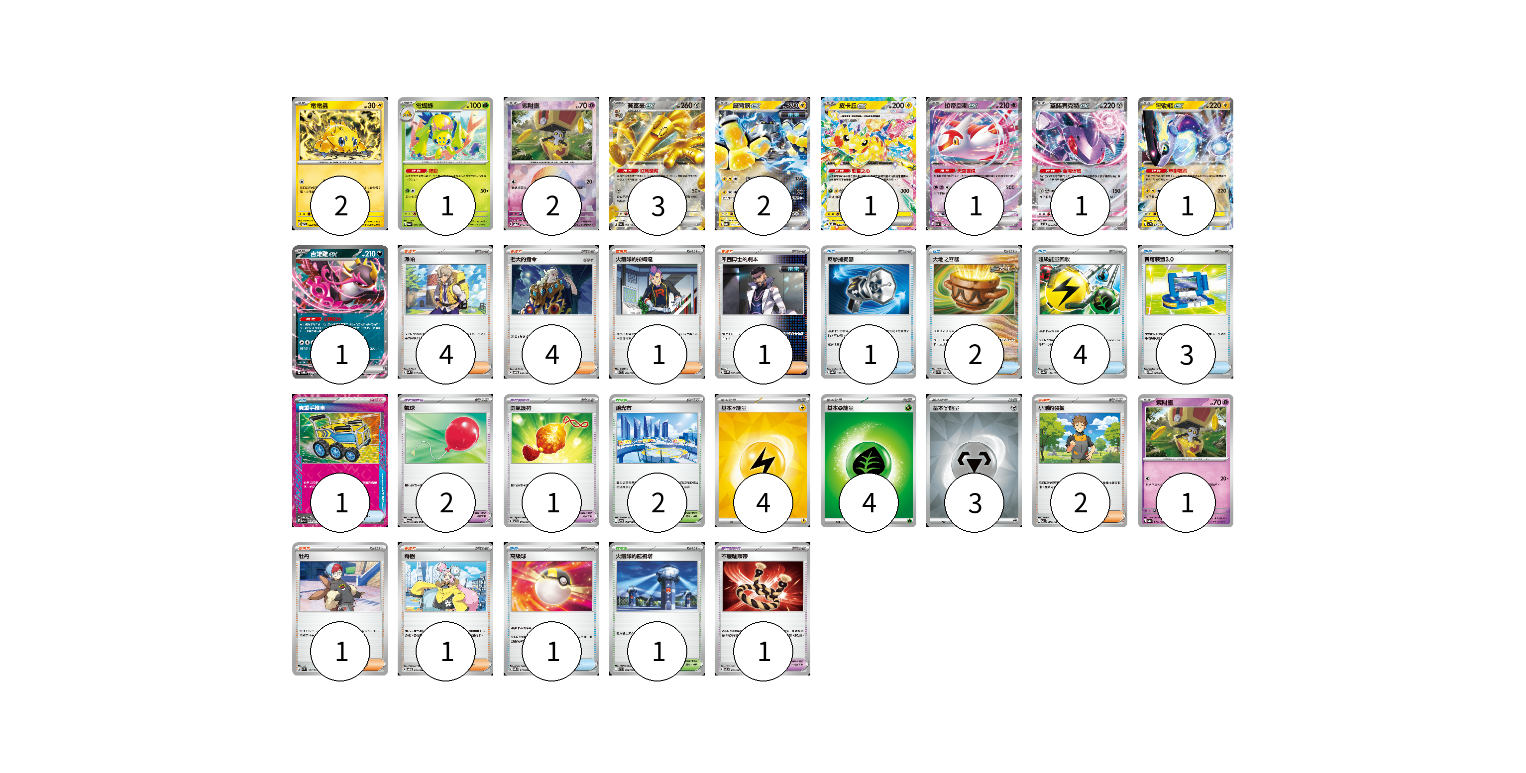 牌組構築方案 以此牌組為基礎新構築牌組 顯示卡面 顯示列表 寶可夢卡(16) 2 1 2 3 2 1 1 1 1 1 1 寶可夢道具(4) 2 1 1 物品卡(12) 1 2 4 3 1 1 支援者卡(14) 4 4 1 1 2 1 1 競技場卡(3) 2 1 能量卡(11) 4 4 3 寶可夢卡(16) 卡牌名稱 張數 卡牌名稱 張數 電電蟲 SV7 032/102 02 電蜘蛛 SV6a 002/064 01 索財靈 SV8a 073/187 02 賽富豪ex SV3a 050/062 03 鐵臂膀ex SV8a 054/187 02 皮卡丘ex SV8 033/106 01 拉帝亞斯ex SV7a 019/064 01 蓋諾賽克特ex SV11B 069/086 01 密勒頓ex SV1V 037/078 01 吉雉雞ex SVOD 004/020 01 索財靈 SV8a 073/187 01 寶可夢道具(4) 卡牌名稱 張數 卡牌名稱 張數 氣球 SV11B 082/086 02 勇氣護符 SVTR 015/021 01 不服輸頭帶 SVTL 016/021 01 物品卡(12) 卡牌名稱 張數 卡牌名稱 張數 反擊捕捉器 SV8a 139/187 01 大地之容器 SVK 012/042 02 超級能量回收 SV8a 141/187 04 寶可裝置3.0 SV11B 081/086 03 貴重手推車 SVK 020/042 01 高級球 SVQL 015/022 01 支援者卡(14) 卡牌名稱 張數 卡牌名稱 張數 派帕 SVK 035/042 04 老大的指令 SVOM 020/021 04 火箭隊的拉姆達 SV10 094/098 01 弗圖博士的劇本 SV4M 065/066 01 小剛的發掘 SV9 096/100 02 牡丹 SV1S 077/078 01 奇樹 SVOD 016/020 01 競技場卡(3) 卡牌名稱 張數 卡牌名稱 張數 釀光市 SV9 098/100 02 火箭隊的監視塔 SV10 096/098 01 能量卡(11) 卡牌名稱 張數 卡牌名稱 張數 基本【雷】能量 SVQP LIG 04 基本【草】能量 M-P GRA 04 基本【鋼】能量 SVOD MET 03 以此牌組為基礎新構築牌組 牌組編碼 KXGjbh-egRfvP-gfPbUZ copy 列印牌組單 牌組編碼已複製 分享至SNS