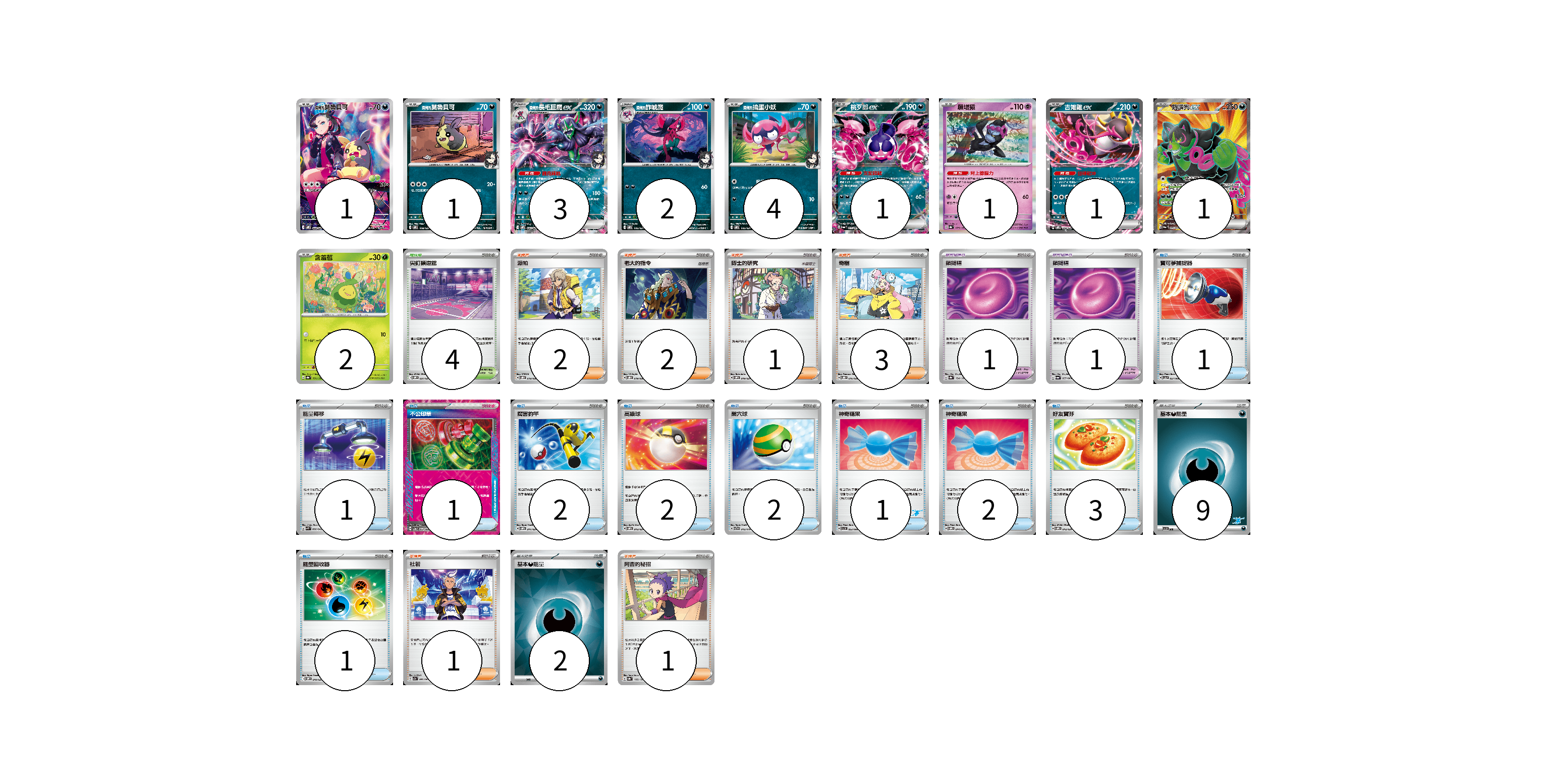 牌組構築方案 以此牌組為基礎新構築牌組 顯示卡面 顯示列表 寶可夢卡(17) 1 1 3 2 4 1 1 1 1 2 寶可夢道具(2) 1 1 物品卡(16) 1 1 1 2 2 2 1 2 3 1 支援者卡(10) 2 2 1 3 1 1 競技場卡(4) 4 能量卡(11) 9 2 寶可夢卡(17) 卡牌名稱 張數 卡牌名稱 張數 <瑪俐的>莫魯貝可 SVOM 022/021 01 <瑪俐的>莫魯貝可 SVOM 008/021 01 <瑪俐的>長毛巨魔ex SVOM 007/021 03 <瑪俐的>詐唬魔 SVOM 006/021 02 <瑪俐的>搗蛋小妖 SVOM 005/021 04 桃歹郎ex SV6a 039/064 01 願增猿 SV8a 075/187 01 吉雉雞ex SVOM 009/021 01 夠讚狗ex SV6a 079/064 01 含羞苞 SV8a 001/187 02 寶可夢道具(2) 卡牌名稱 張數 卡牌名稱 張數 鎖鏈糬 SV8a 154/187 01 鎖鏈糬 SV6a 057/064 01 物品卡(16) 卡牌名稱 張數 卡牌名稱 張數 寶可夢捕捉器 SV5a 057/066 01 能量轉移 SVK 008/042 01 不公印章 SV5a 053/066 01 厲害釣竿 SVOM 011/021 02 高級球 SVOM 013/021 02 巢穴球 SVTG 012/019 02 神奇糖果 SVI 053/066 01 神奇糖果 SVOM 014/021 02 好友寶芬 SVOM 012/021 03 能量回收器 SVOM 010/021 01 支援者卡(10) 卡牌名稱 張數 卡牌名稱 張數 派帕 SVOD 018/020 02 老大的指令 SVOD 019/020 02 博士的研究 SVOM 019/021 01 奇樹 SVOD 016/020 03 杜若 SV7a 060/064 01 阿杏的秘招 SV8a 166/187 01 競技場卡(4) 卡牌名稱 張數 卡牌名稱 張數 尖釘鎮道館 SVOM 021/021 04 能量卡(11) 卡牌名稱 張數 卡牌名稱 張數 基本【惡】能量 SVI DAR 09 基本【惡】能量 SVOM DAR 02 以此牌組為基礎新構築牌組 牌組編碼 KYnCej-TISjoE-ocJCDO copy 列印牌組單 牌組編碼已複製 分享至SNS
