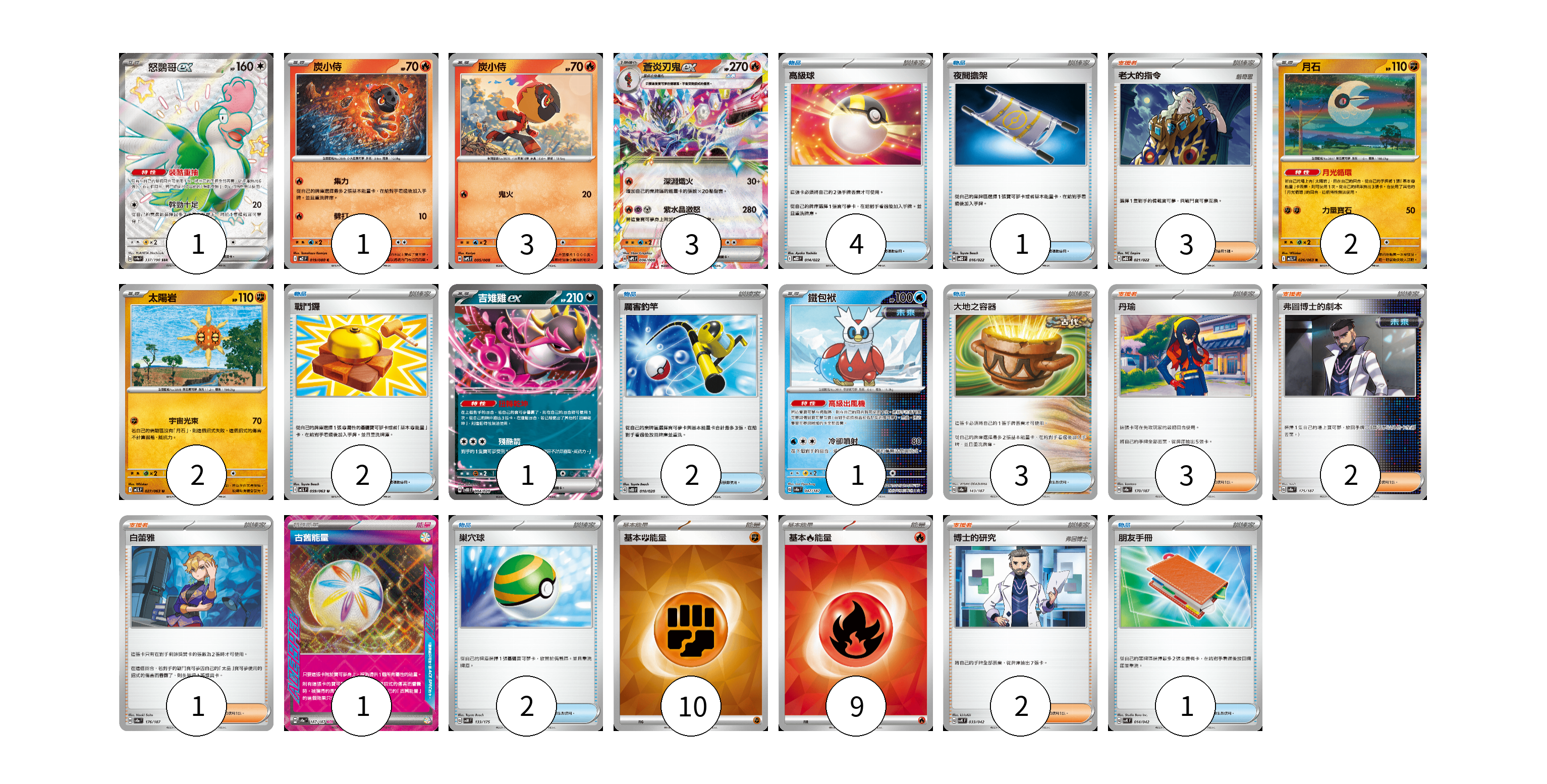 牌組構築方案 以此牌組為基礎新構築牌組 顯示卡面 顯示列表 寶可夢卡(14) 1 1 3 3 2 2 1 1 物品卡(15) 4 1 2 2 3 2 1 支援者卡(11) 3 3 2 1 2 能量卡(20) 1 10 9 寶可夢卡(14) 卡牌名稱 張數 卡牌名稱 張數 怒鸚哥ex SV4a 337/190 01 炭小侍 M2 019/080 01 炭小侍 SVPS 005/008 03 蒼炎刃鬼ex SVPS 006/008 03 月石 M1L 026/063 02 太陽岩 M1L 027/063 02 吉雉雞ex SVOD 004/020 01 鐵包袱 SV8a 047/187 01 物品卡(15) 卡牌名稱 張數 卡牌名稱 張數 高級球 MBD 014/022 04 夜間擔架 MBD 016/022 01 戰鬥鑼 M1L 059/063 02 厲害釣竿 SVOD 010/020 02 大地之容器 SV8a 143/187 03 巢穴球 SVM 133/175 02 朋友手冊 SVK 014/042 01 支援者卡(11) 卡牌名稱 張數 卡牌名稱 張數 老大的指令 MBG 021/022 03 丹瑜 SV8a 170/187 03 弗圖博士的劇本 SV8a 175/187 02 白蕾雅 SV8a 176/187 01 博士的研究 SVK 033/042 02 能量卡(20) 卡牌名稱 張數 卡牌名稱 張數 古舊能量 SV8a 187/187 01 基本【鬥】能量 SVM FIG 10 基本【火】能量 SVM FIR 09 以此牌組為基礎新構築牌組 牌組編碼 KYnjAL-bLApAy-bwbdYe copy 列印牌組單 牌組編碼已複製 分享至SNS