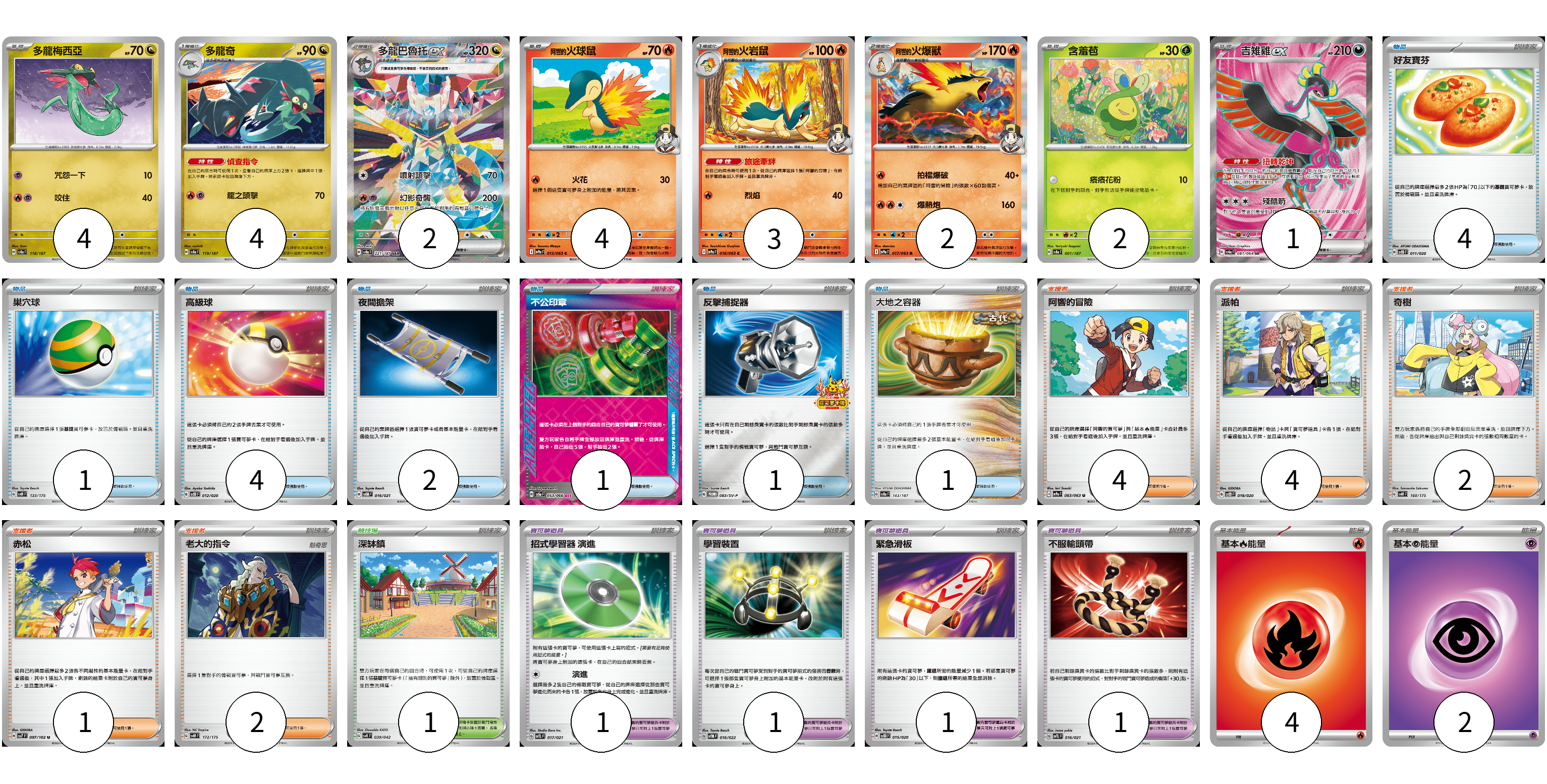 牌組構築方案 以此牌組為基礎新構築牌組 顯示卡面 顯示列表 寶可夢卡(22) 4 4 2 4 3 2 2 1 寶可夢道具(4) 1 1 1 1 物品卡(14) 4 1 4 2 1 1 1 支援者卡(13) 4 4 2 1 2 競技場卡(1) 1 能量卡(6) 4 2 寶可夢卡(22) 卡牌名稱 張數 卡牌名稱 張數 多龍梅西亞 SV8a 118/187 04 多龍奇 SV8a 119/187 04 多龍巴魯托ex SV8a 221/187 02 <阿響的>火球鼠 SV9a 015/063 04 <阿響的>火岩鼠 SV9a 016/063 03 <阿響的>火爆獸 SV9a 017/063 02 含羞苞 SV8a 001/187 02 吉雉雞ex SV6a 081/064 01 寶可夢道具(4) 卡牌名稱 張數 卡牌名稱 張數 招式學習器 演進 SVTL 017/021 01 學習裝置 SVTM 016/022 01 緊急滑板 SVOD 015/020 01 不服輸頭帶 SVTL 016/021 01 物品卡(14) 卡牌名稱 張數 卡牌名稱 張數 好友寶芬 SVOD 011/020 04 巢穴球 SVM 133/175 01 高級球 SVOD 012/020 04 夜間擔架 SVOM 016/021 02 不公印章 SV5a 053/066 01 反擊捕捉器 SV-P 083/SV-P 01 大地之容器 SV8a 143/187 01 支援者卡(13) 卡牌名稱 張數 卡牌名稱 張數 阿響的冒險 SV9a 063/063 04 派帕 SVOD 018/020 04 奇樹 SVM 160/175 02 赤松 SV7 097/102 01 老大的指令 SVM 172/175 02 競技場卡(1) 卡牌名稱 張數 卡牌名稱 張數 深缽鎮 SVK 039/042 01 能量卡(6) 卡牌名稱 張數 卡牌名稱 張數 基本【火】能量 SVTL FIR 04 基本【超】能量 SVTS PSY 02 以此牌組為基礎新構築牌組 牌組編碼 KbLtqH-eJmUlK-JgylbS copy 列印牌組單 牌組編碼已複製 分享至SNS
